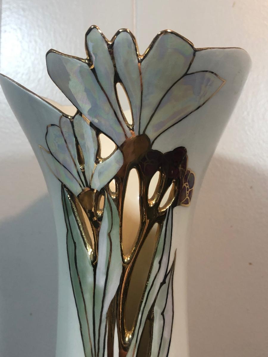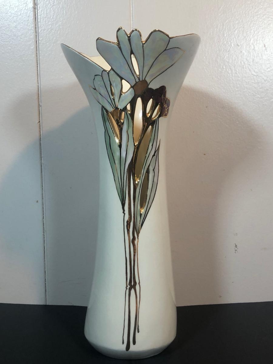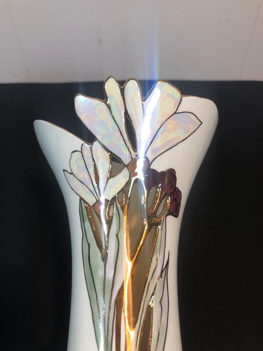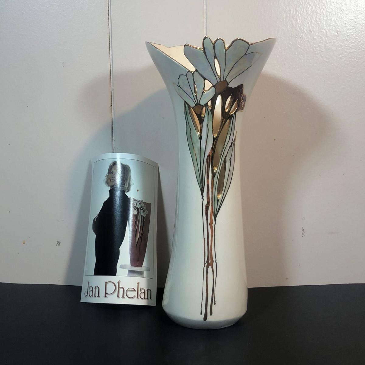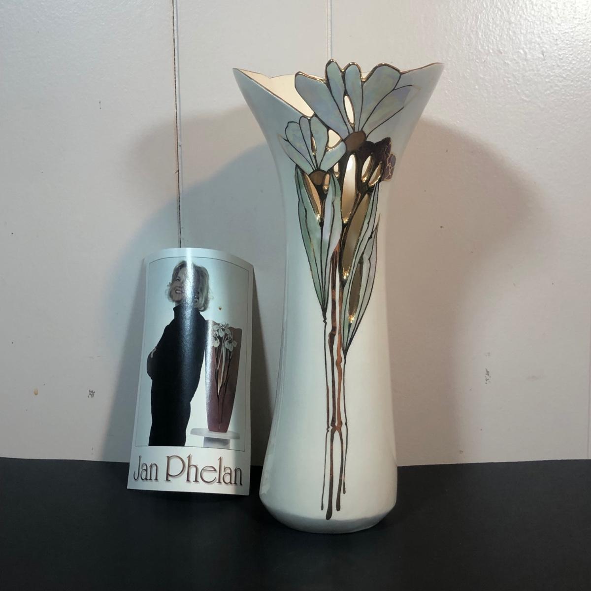LOT 38L: Signed Jan Phelan Floral Art Pottery Vase w/ Gold Colored & Iridescent Accents