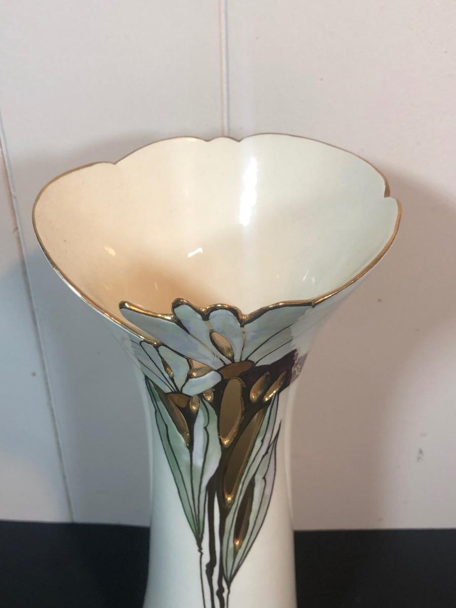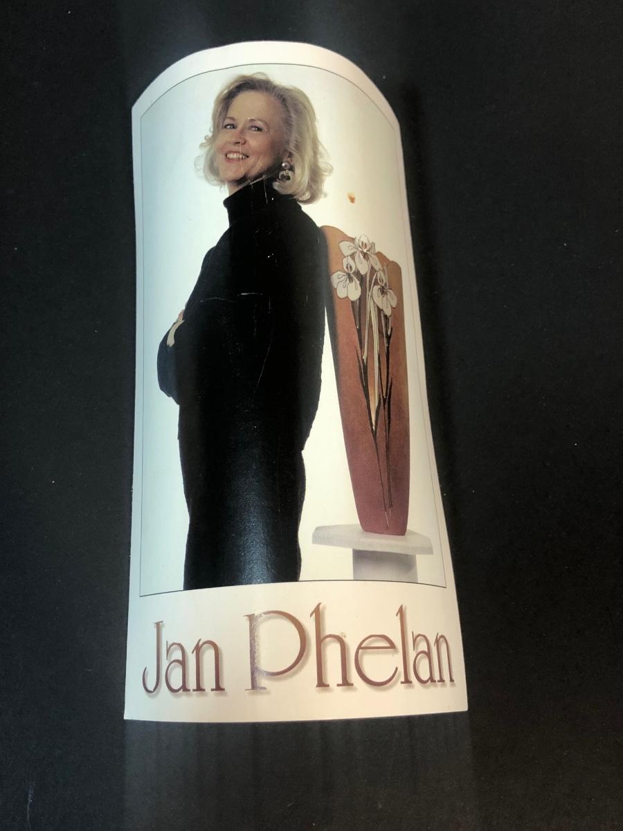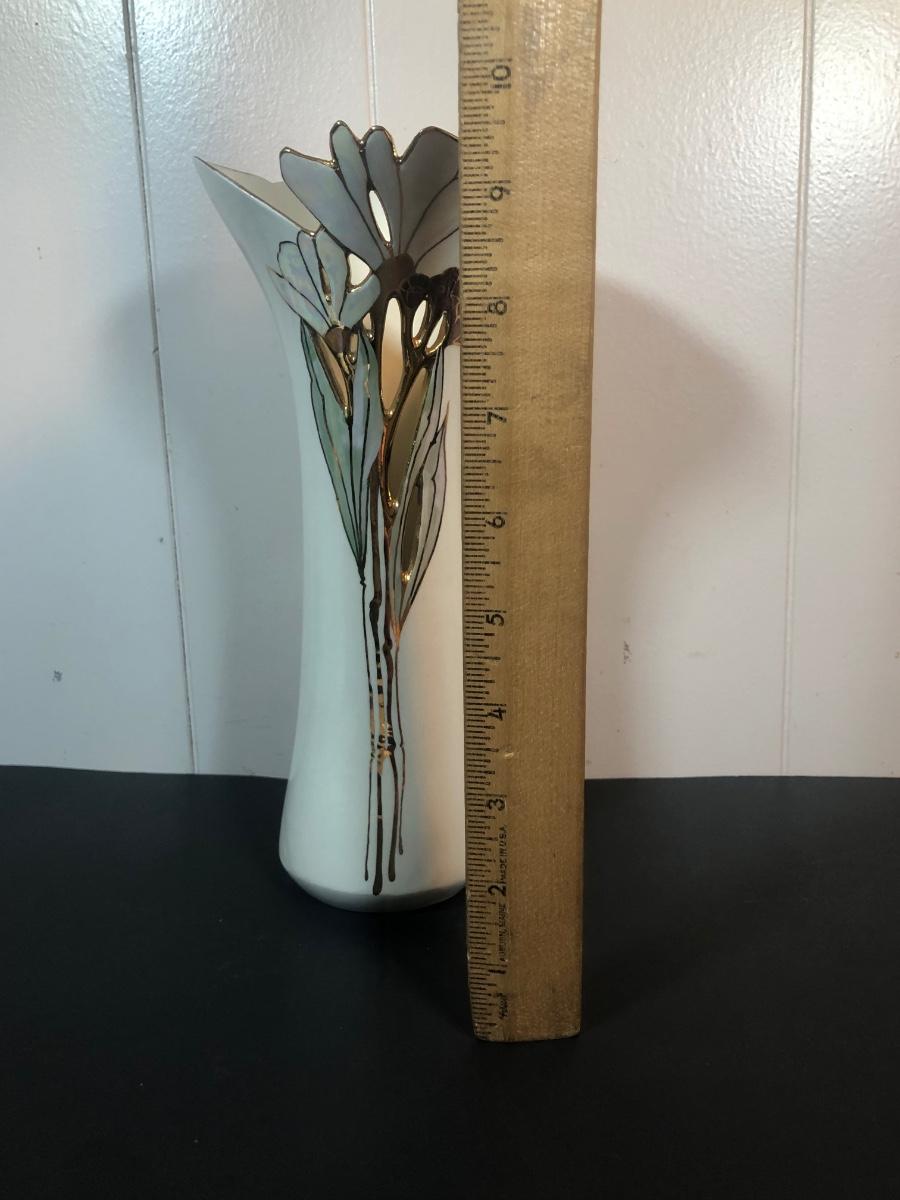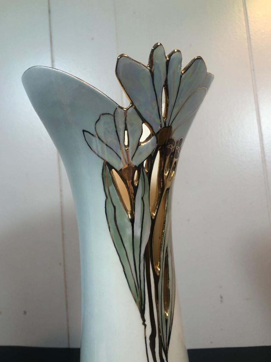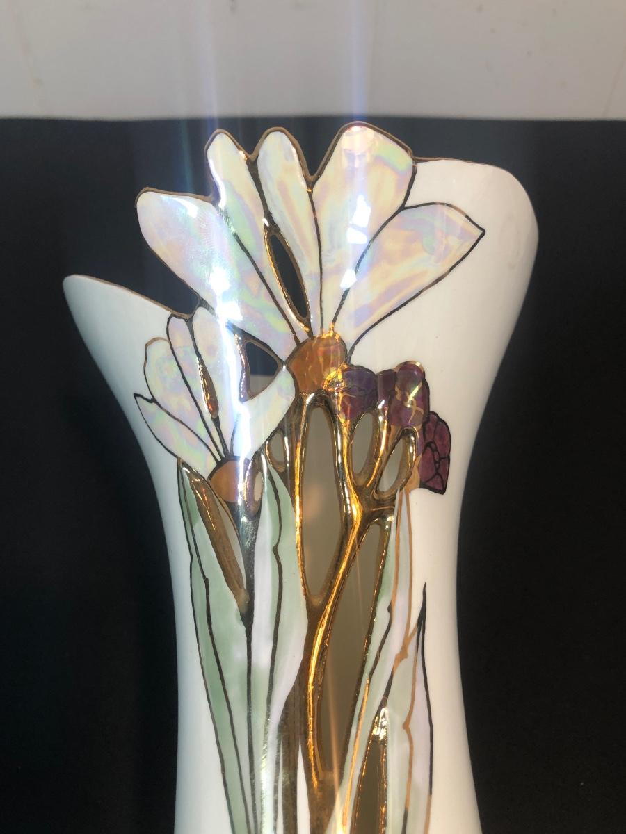 LOT 38L: Signed Jan Phelan Floral Art Pottery Vase w/ Gold Colored & Iridescent Accents