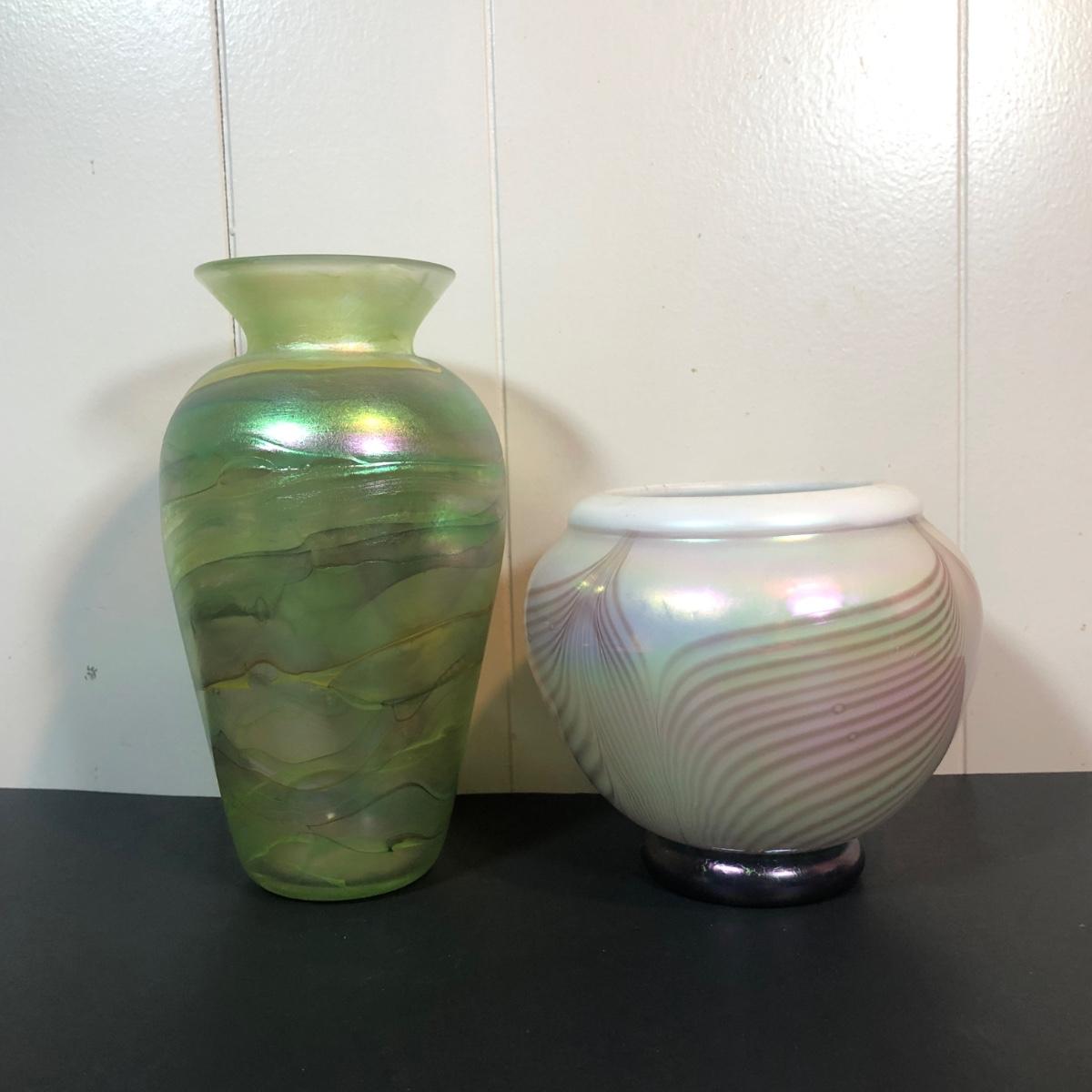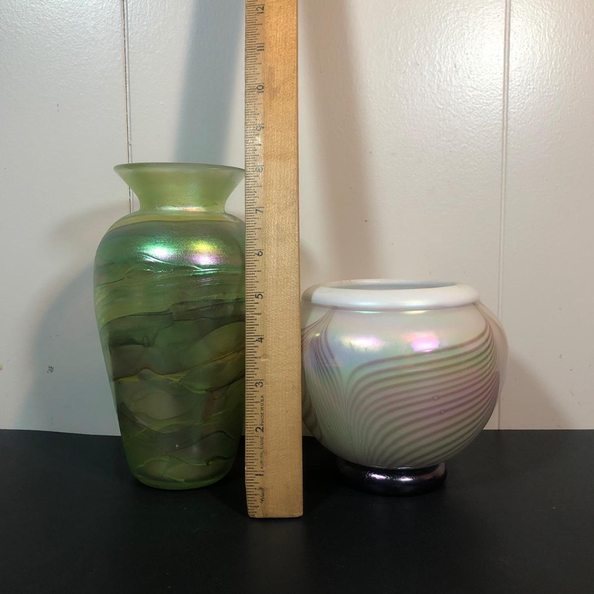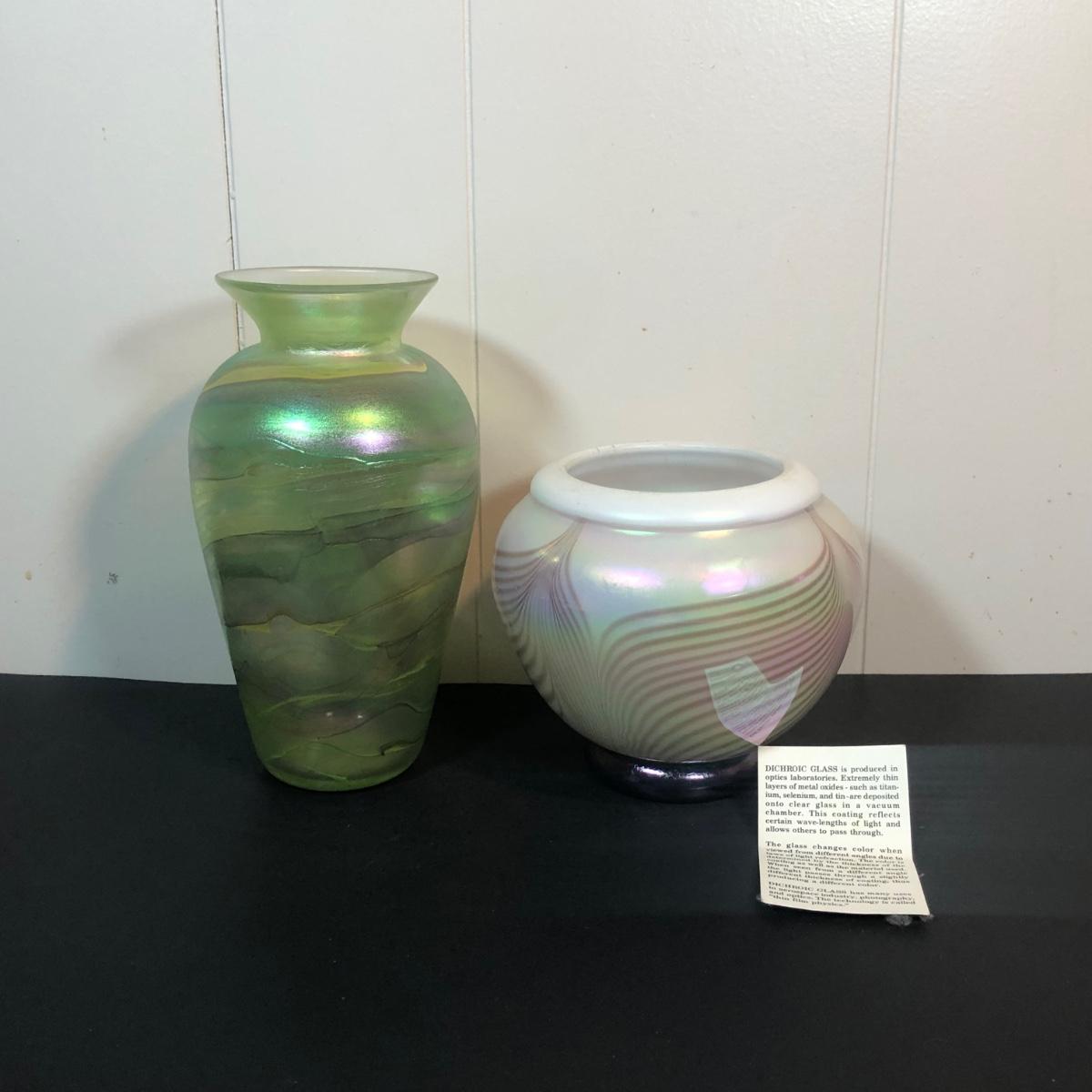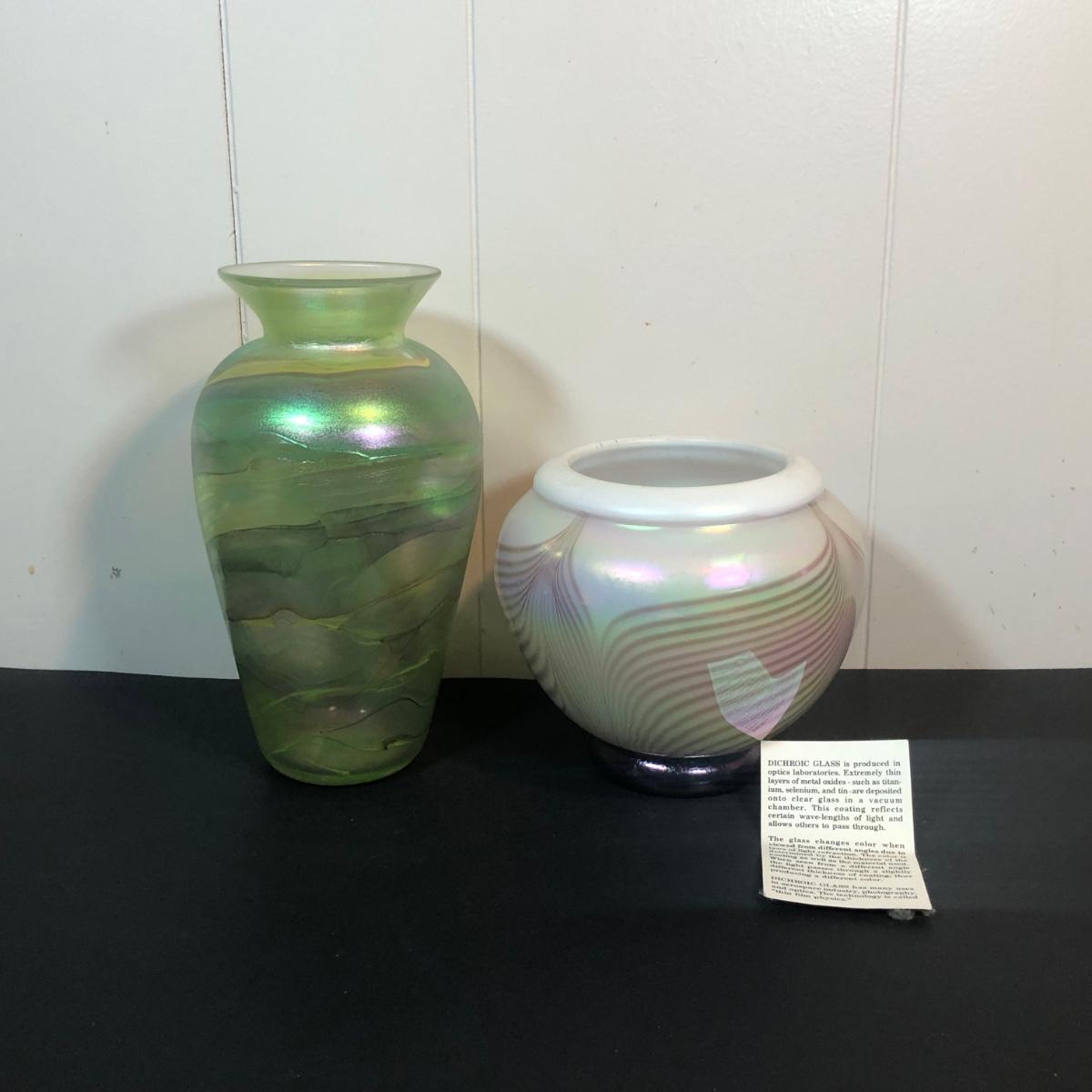 LOT 39L: Signed Handblown Dichroic Glass Jar & Handblown Green Glass Vase