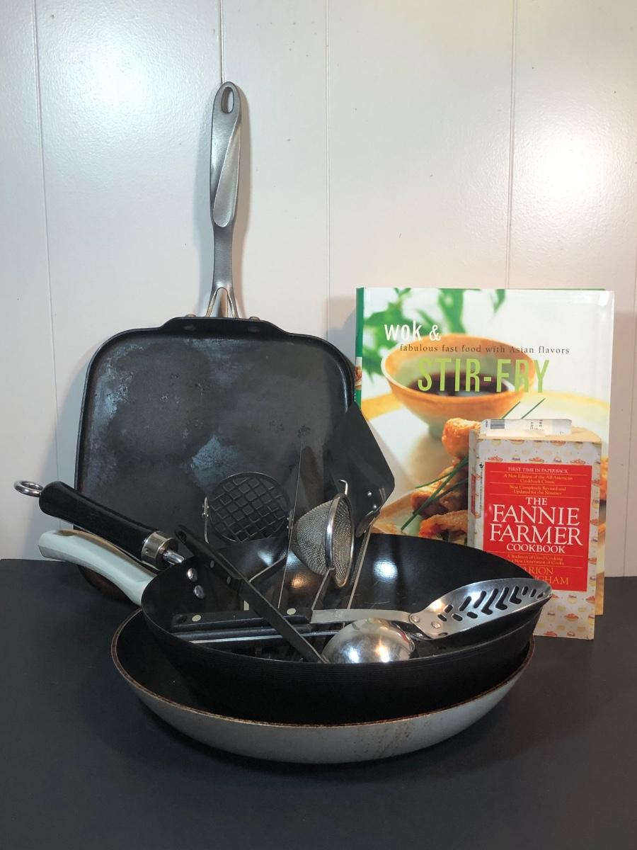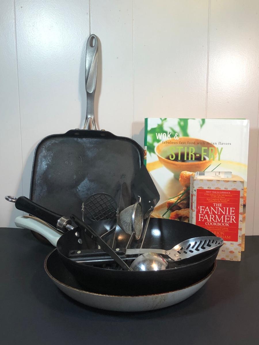 LOT 43L: Kitchen Collection - Pans incl. T-Fal & Calphalon, Ecko & Flint Stainless Tools & Cook Books