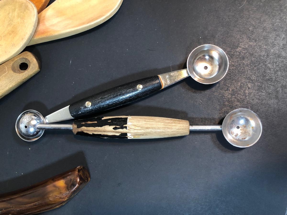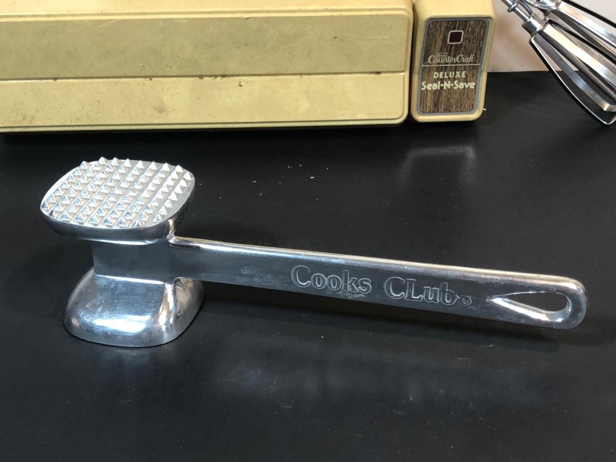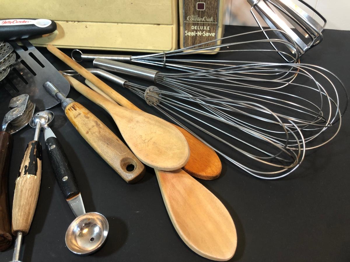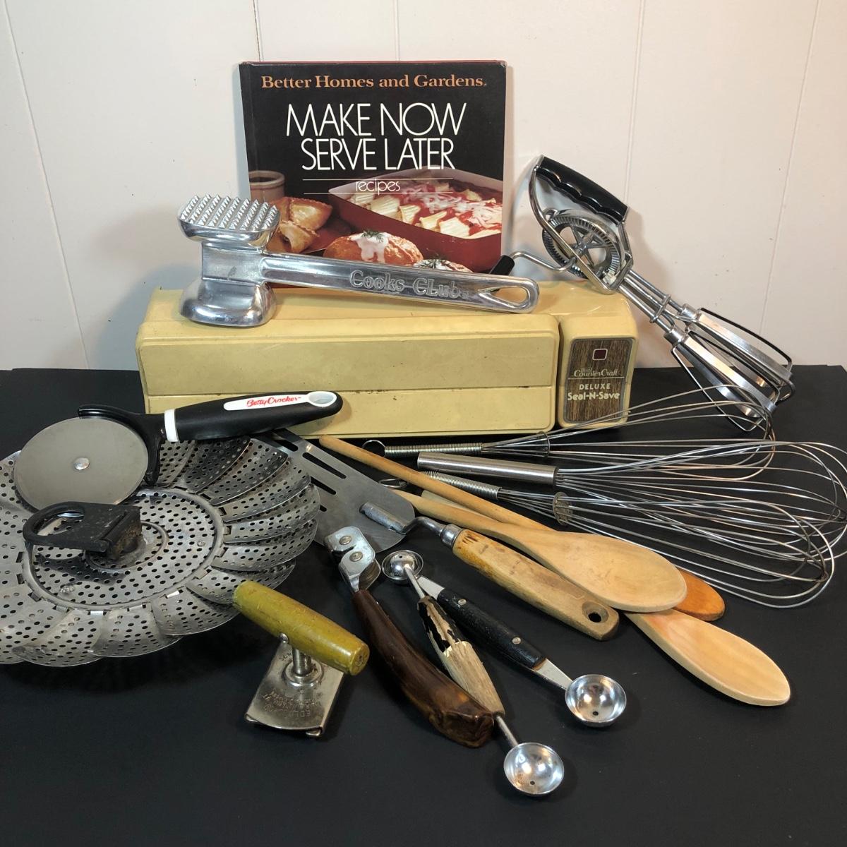 LOT 44L: Kitchen Tools - Vintage Sears Counter Craft Deluxe Seal-N-Save, Farberware Drainer, Cooks Club Meat Tenderizer, Betty Crocker Pizza Cutter, Melon Ballers & More