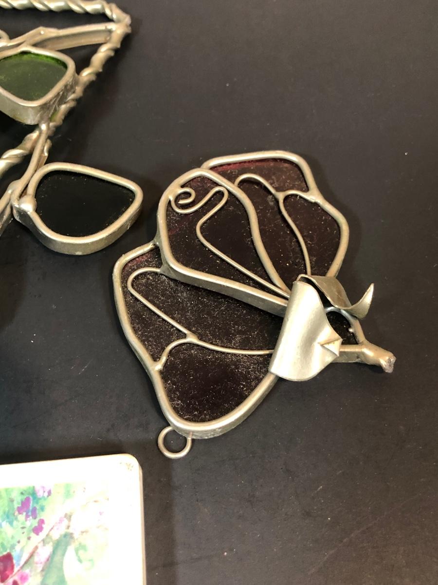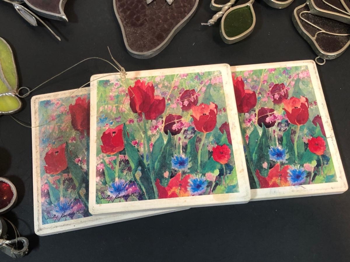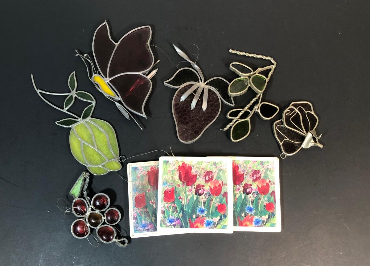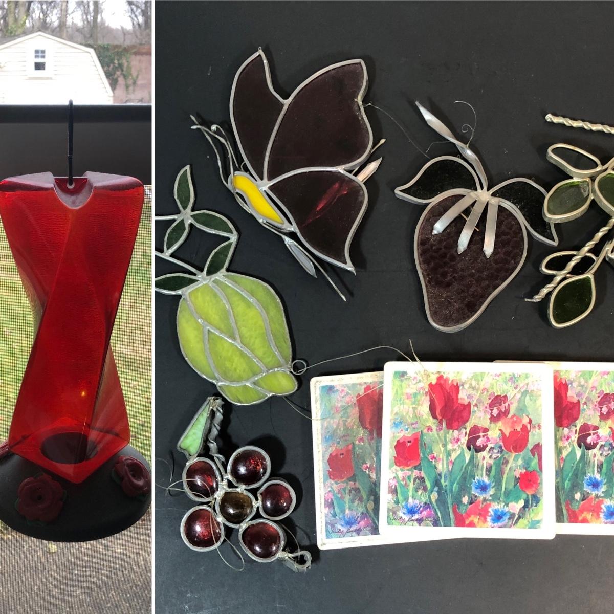 LOT 53K: Hummingbird Feeder w/ Stained Glass & Floral Coasters