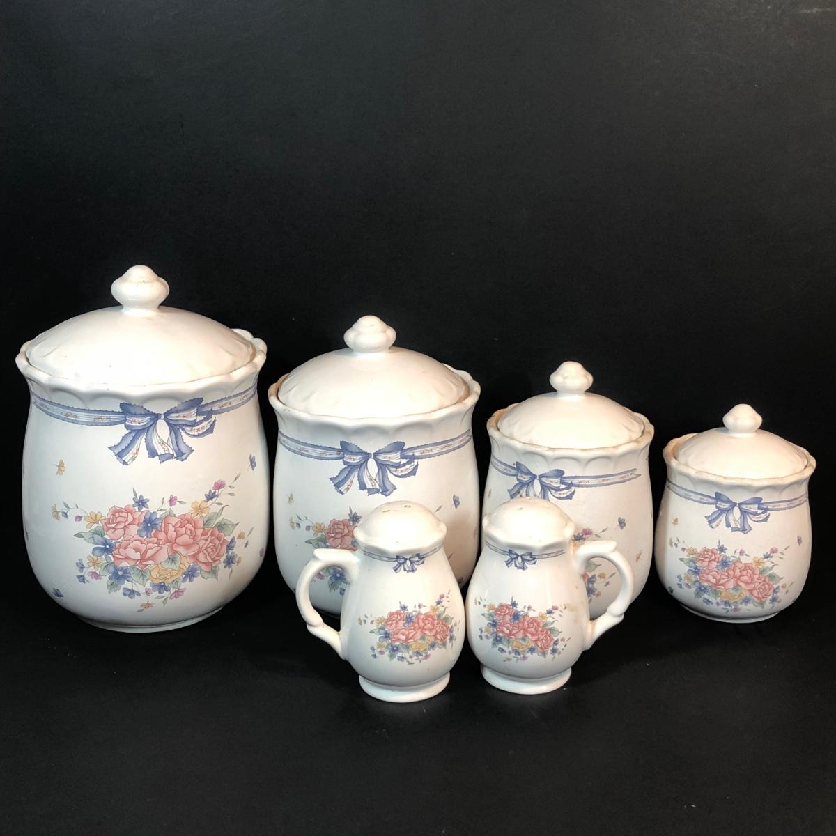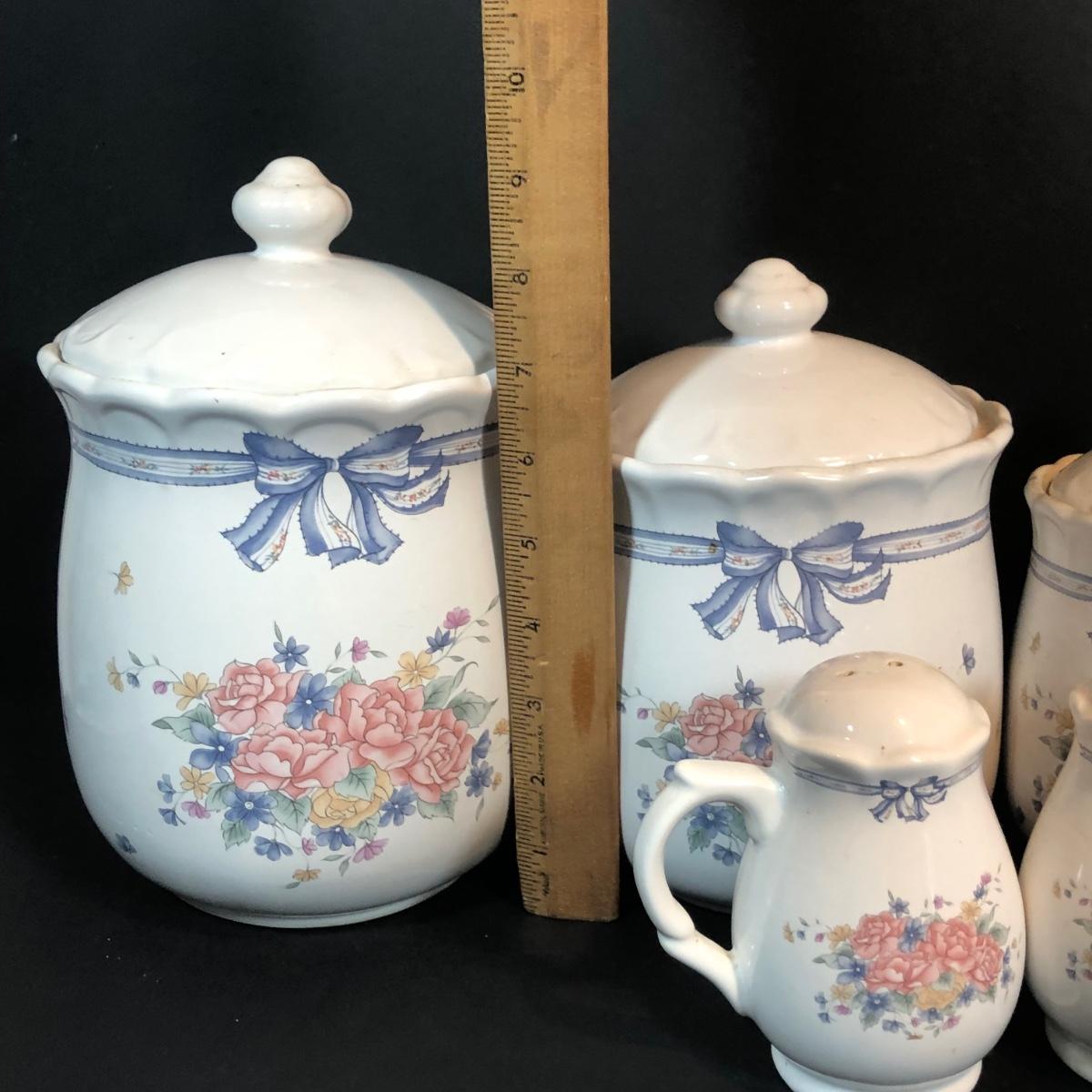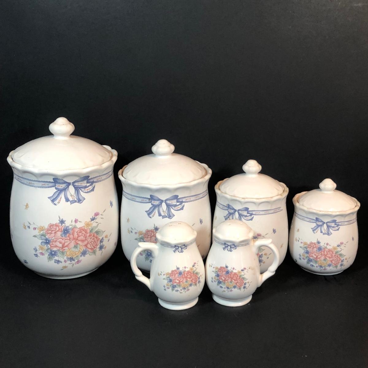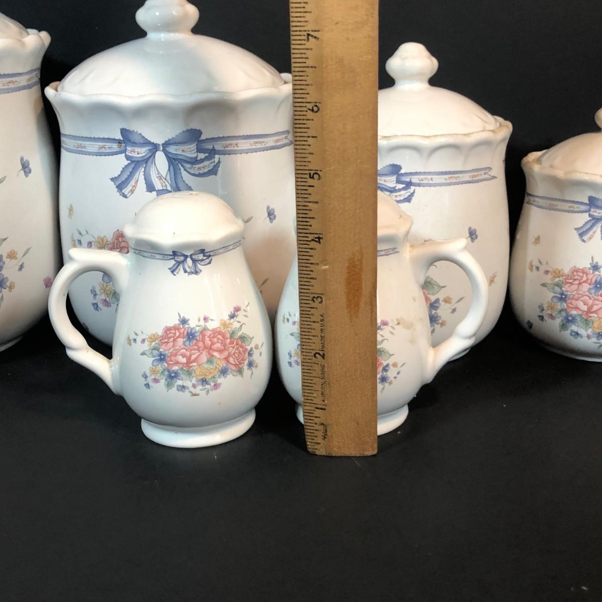 LOT 59K: Vintage Floral Ceramic Kitchen Canisters w/ Matching Salt & Pepper Shakers