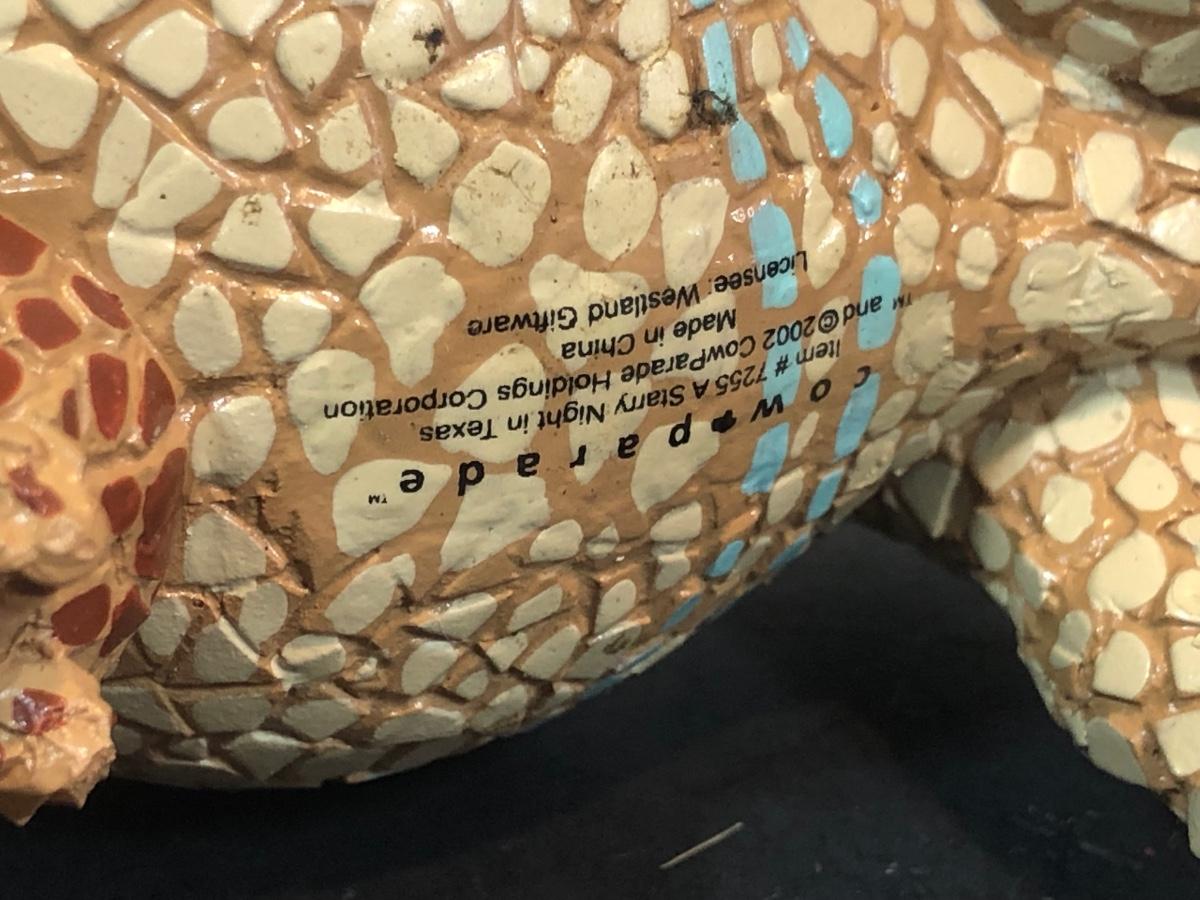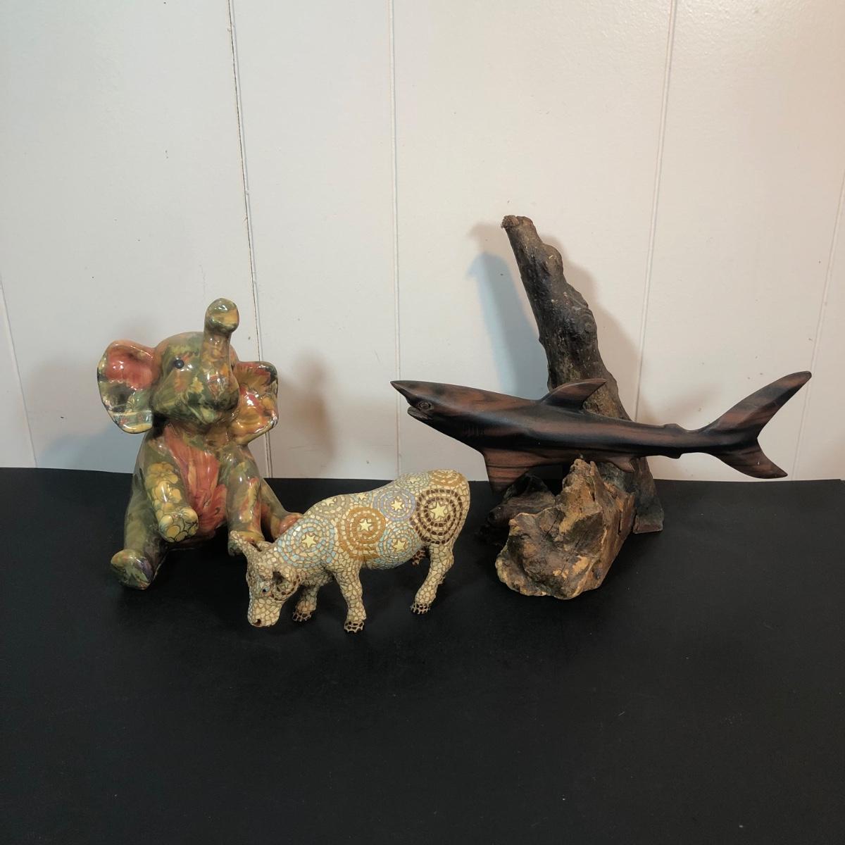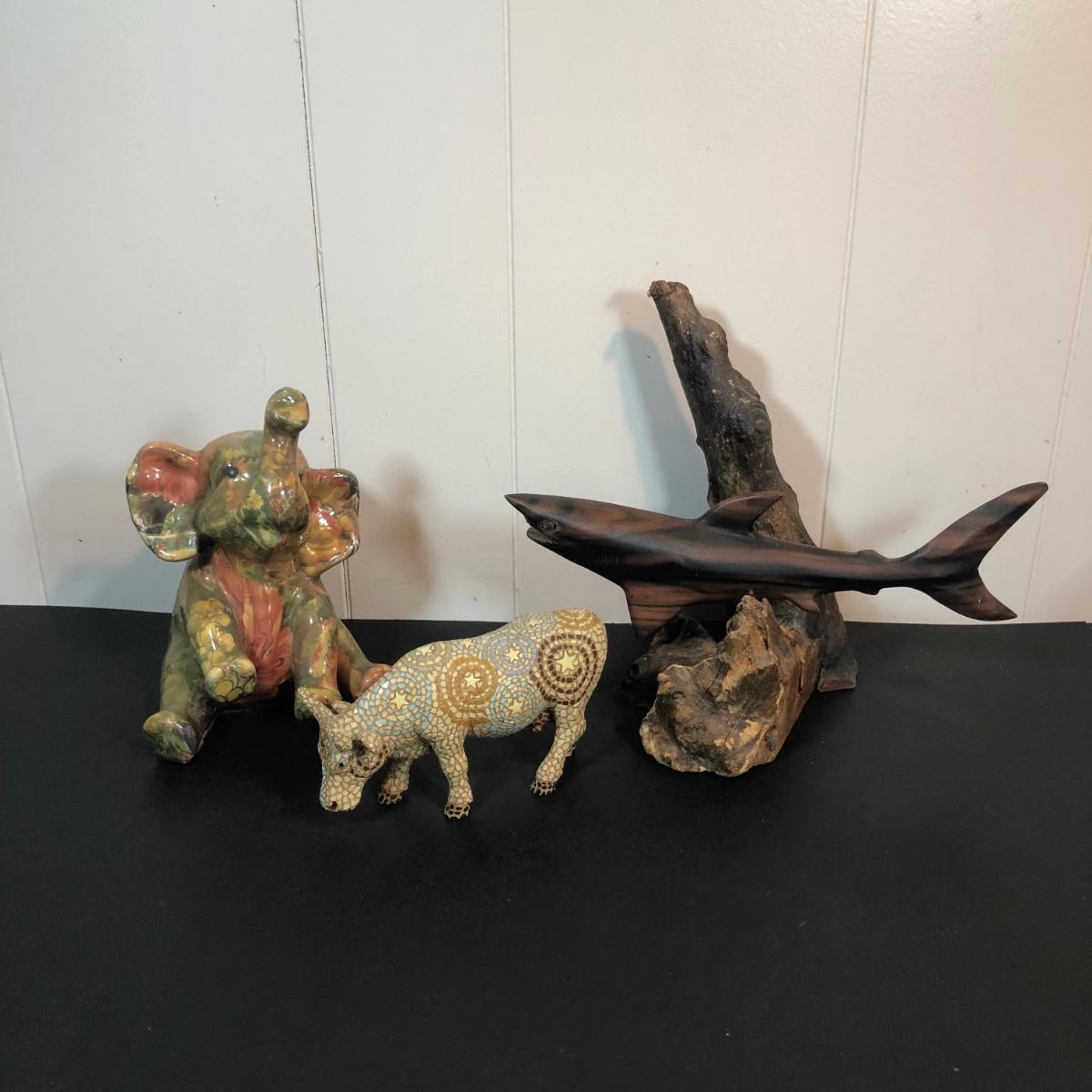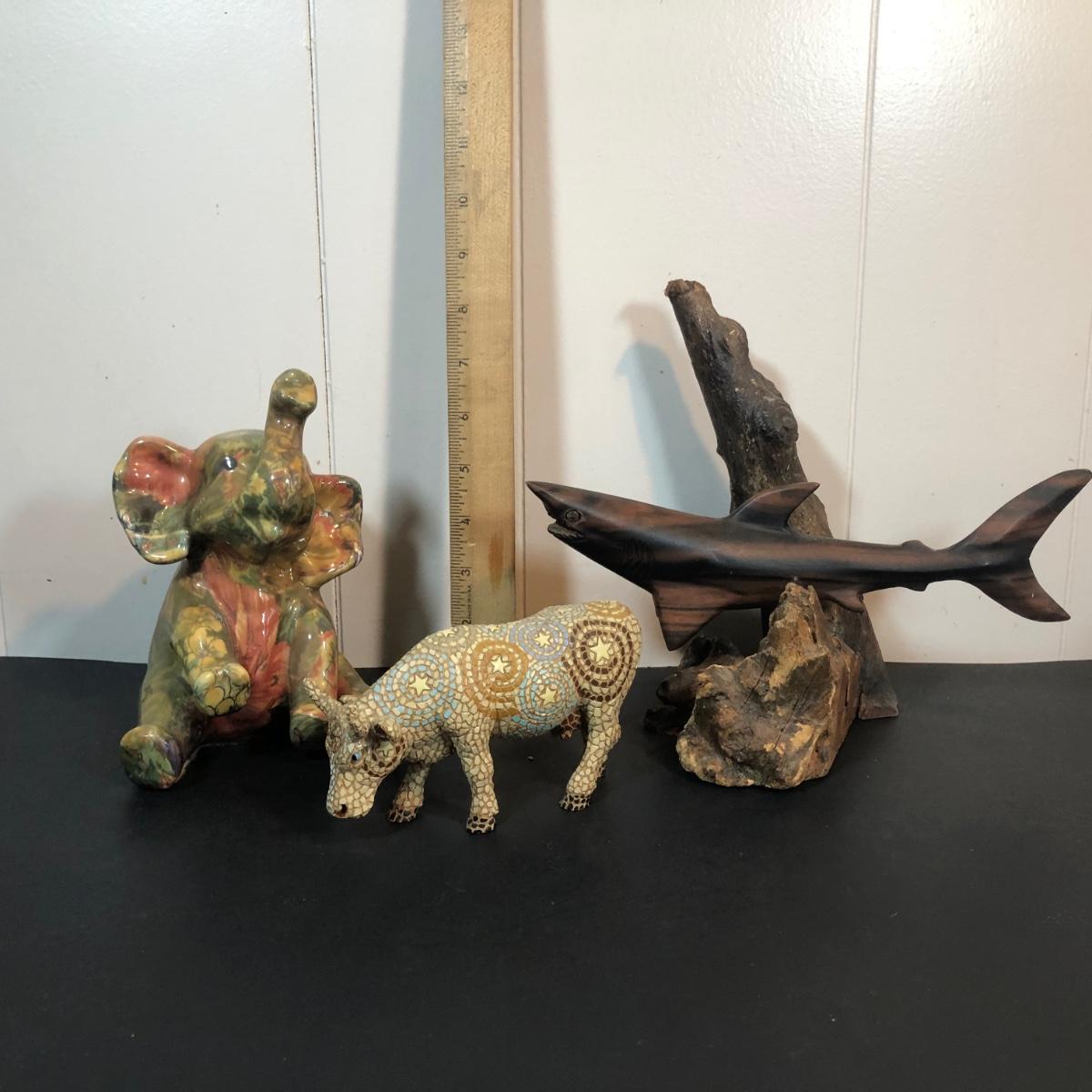 LOT 66L: Wood Shark Sculpture, 2002 Cow Parade #2255 A Starry Night in Texas & Patchwork Ceramic Elephant