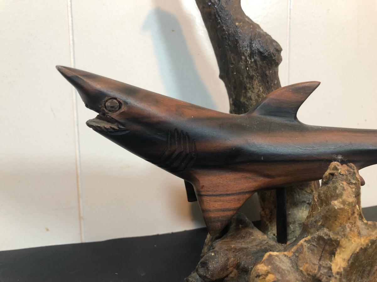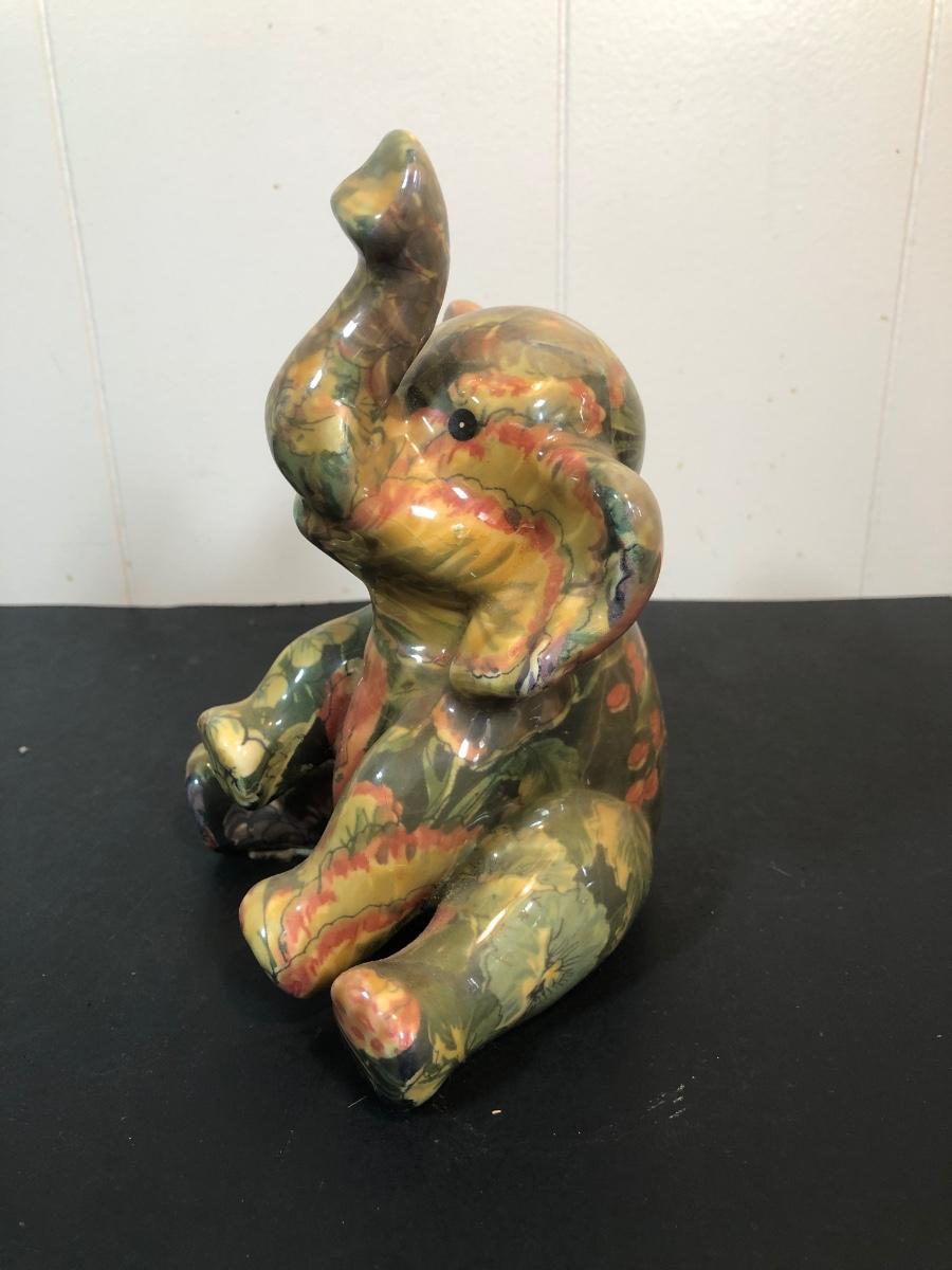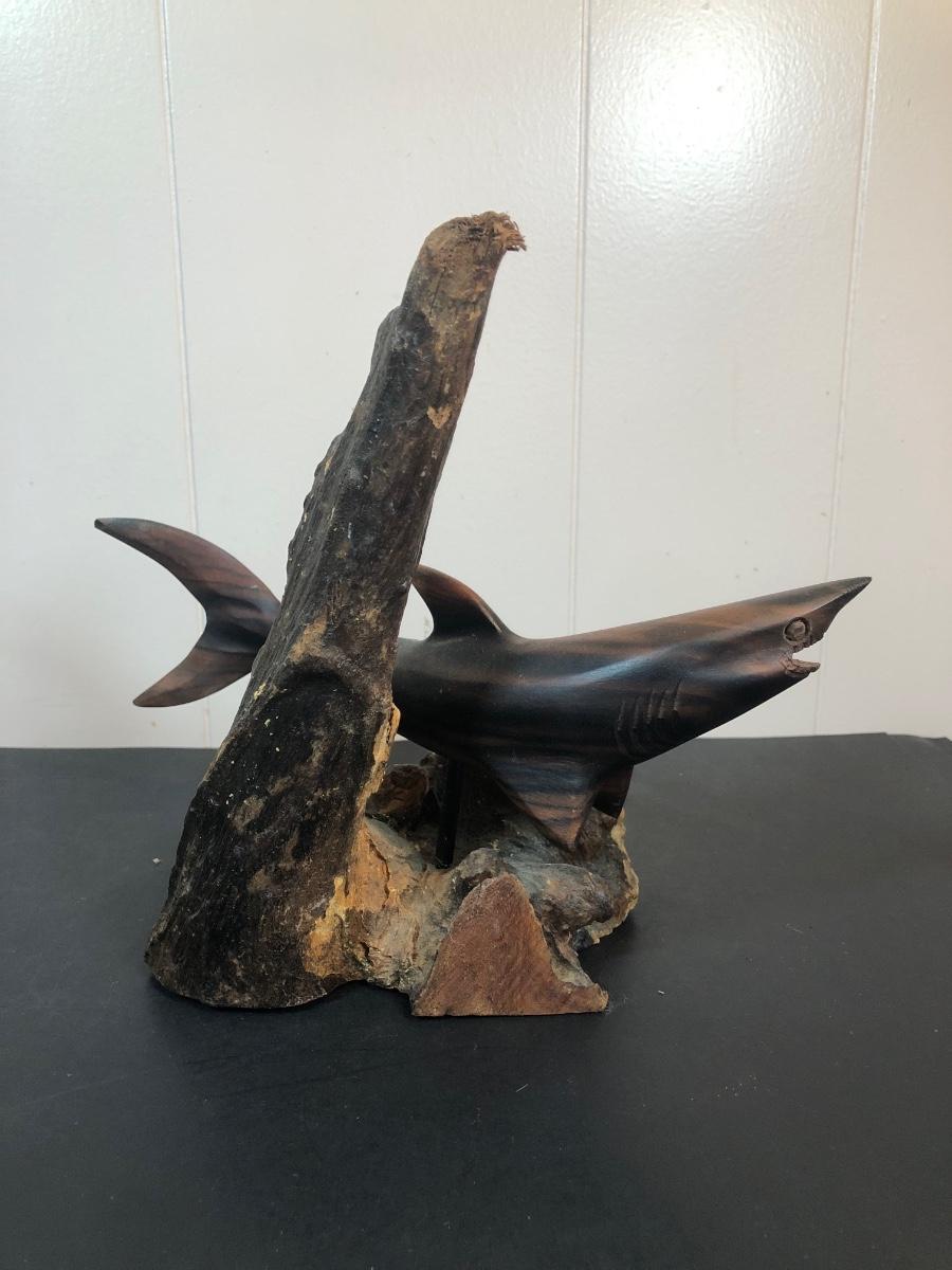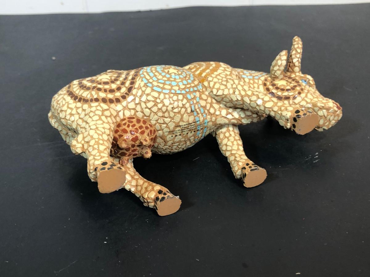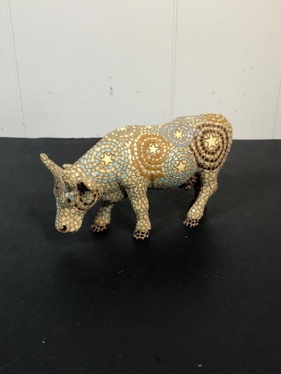 LOT 66L: Wood Shark Sculpture, 2002 Cow Parade #2255 A Starry Night in Texas & Patchwork Ceramic Elephant