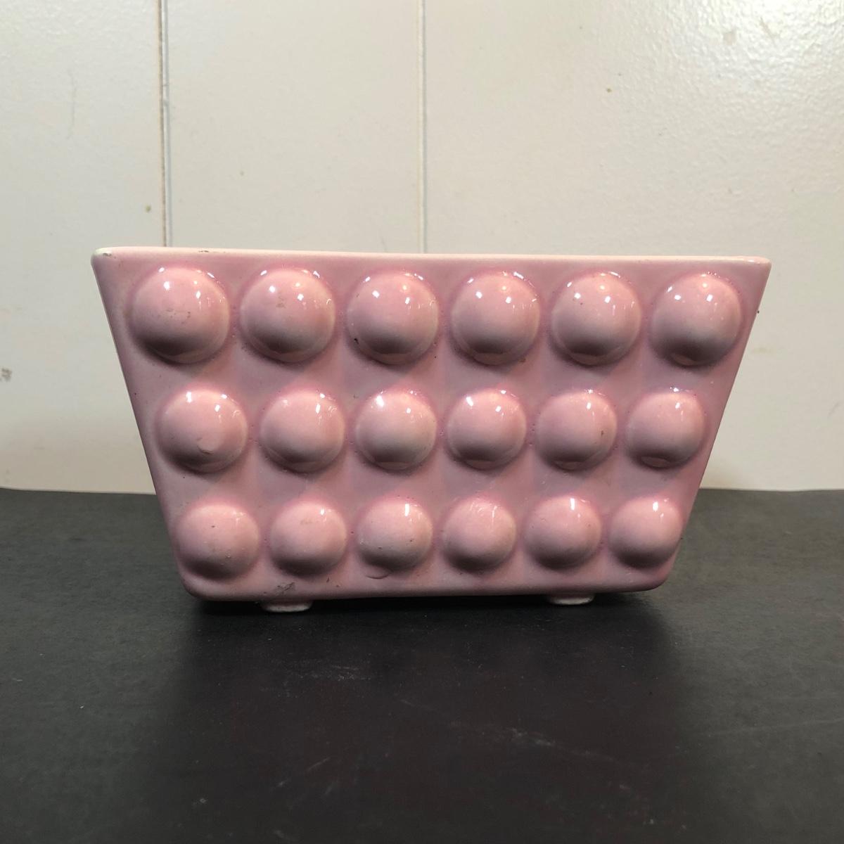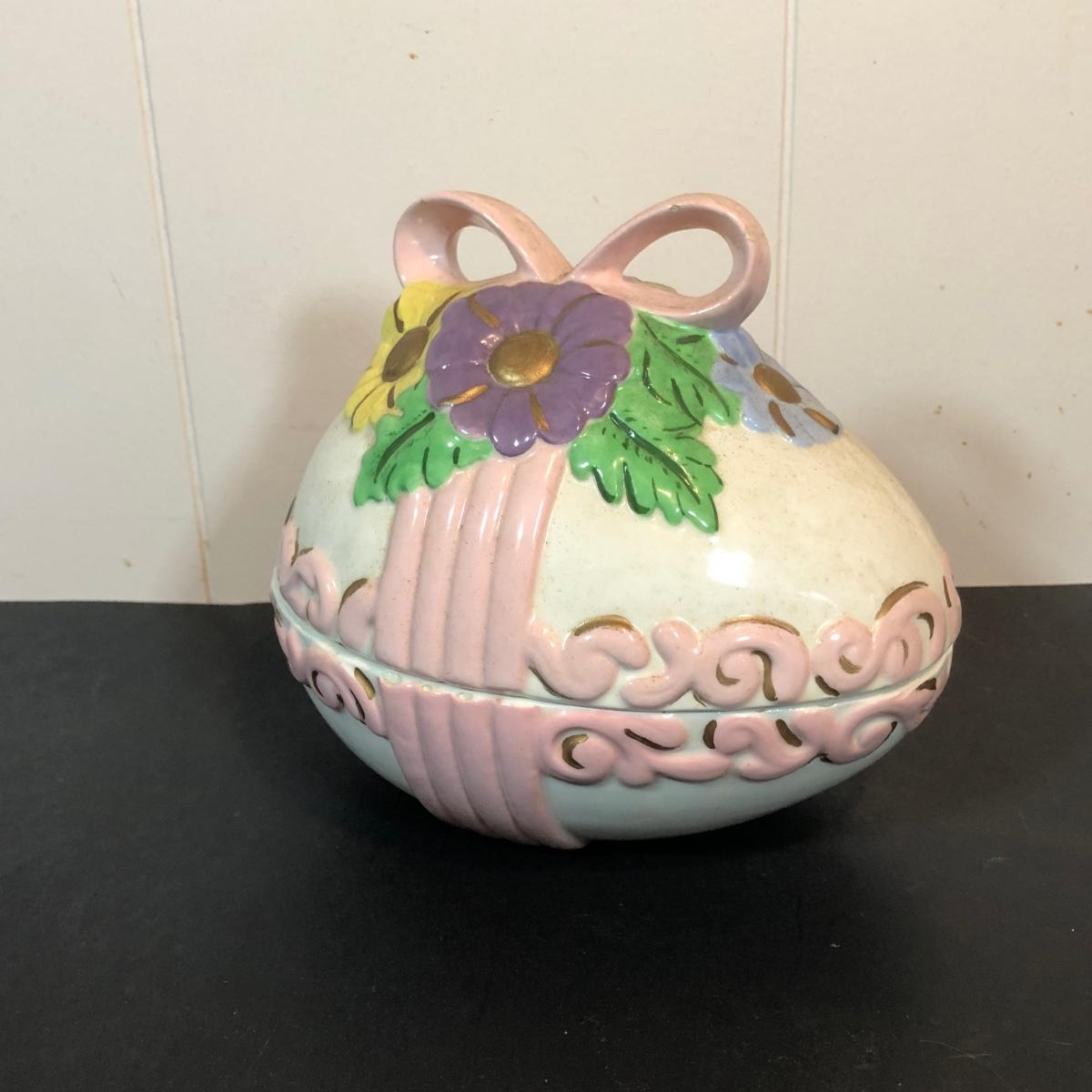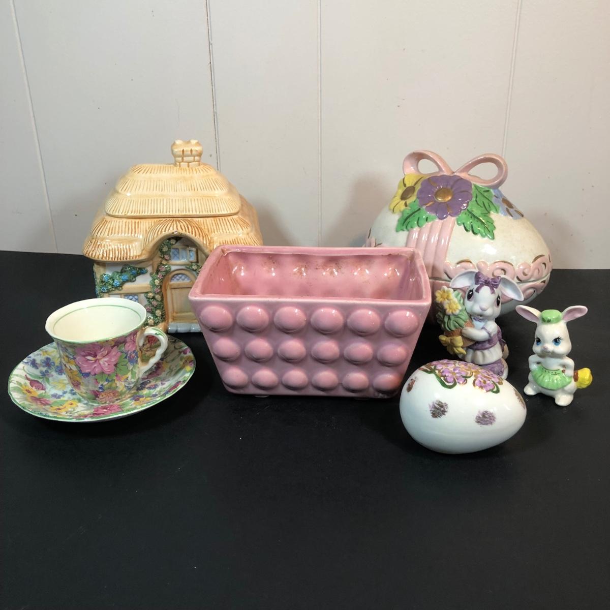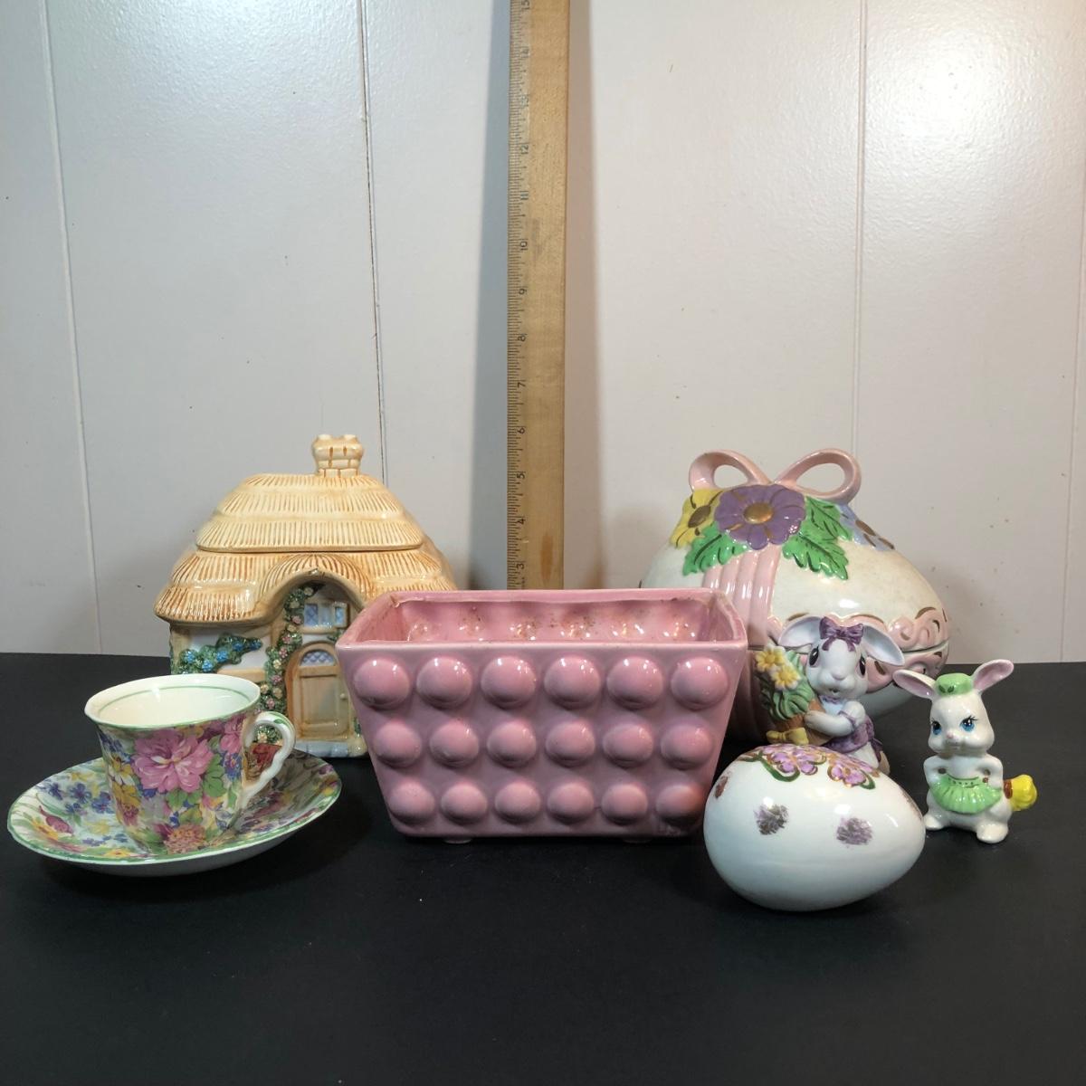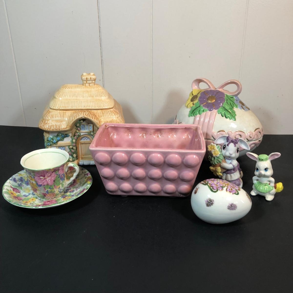 LOT 70L: Vintage Springtime Pottery & China - 1980s Teleflora Ceramic Cottage Cookie Jar, Pink Rectangular Bubble Planter Marked USA, Signed 1970s Egg Dish & More