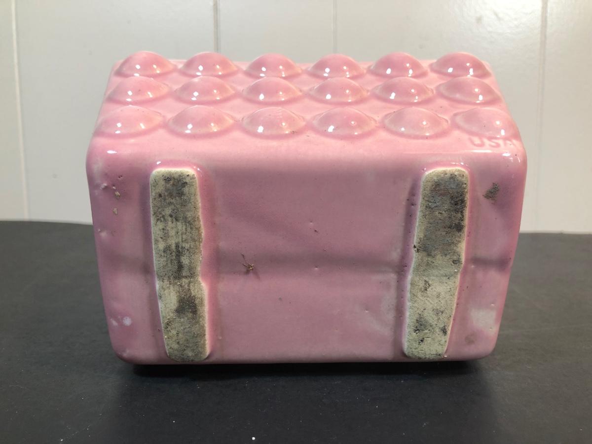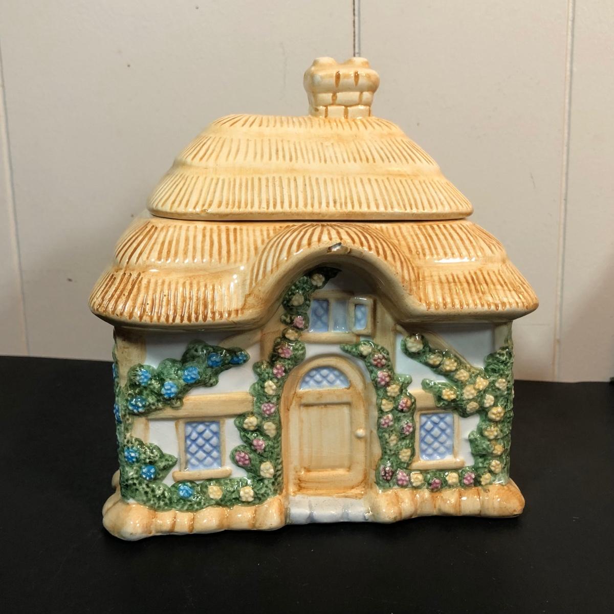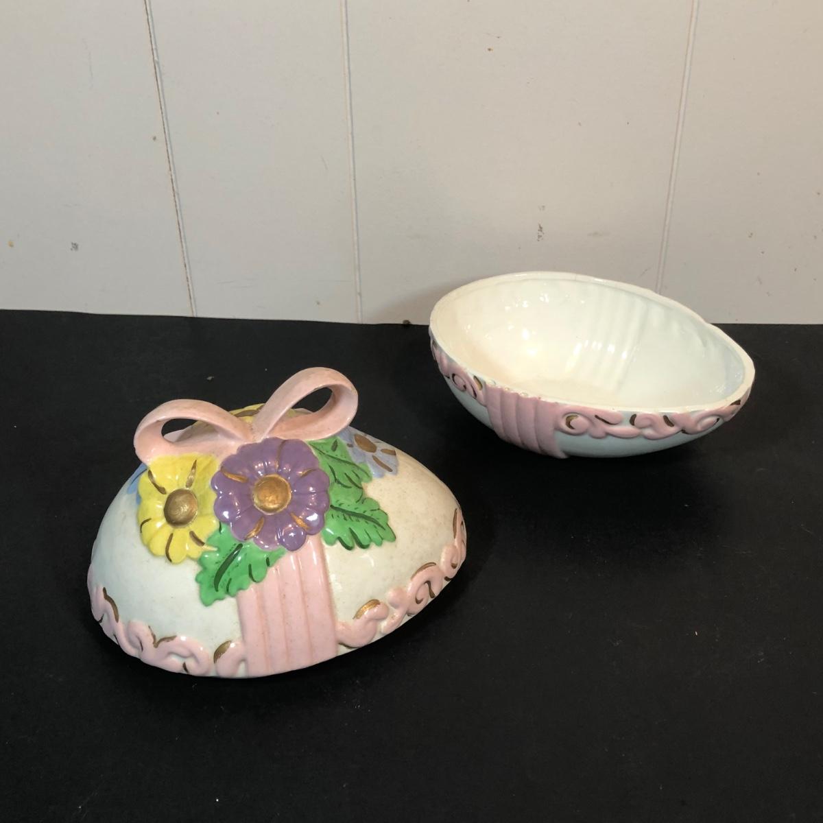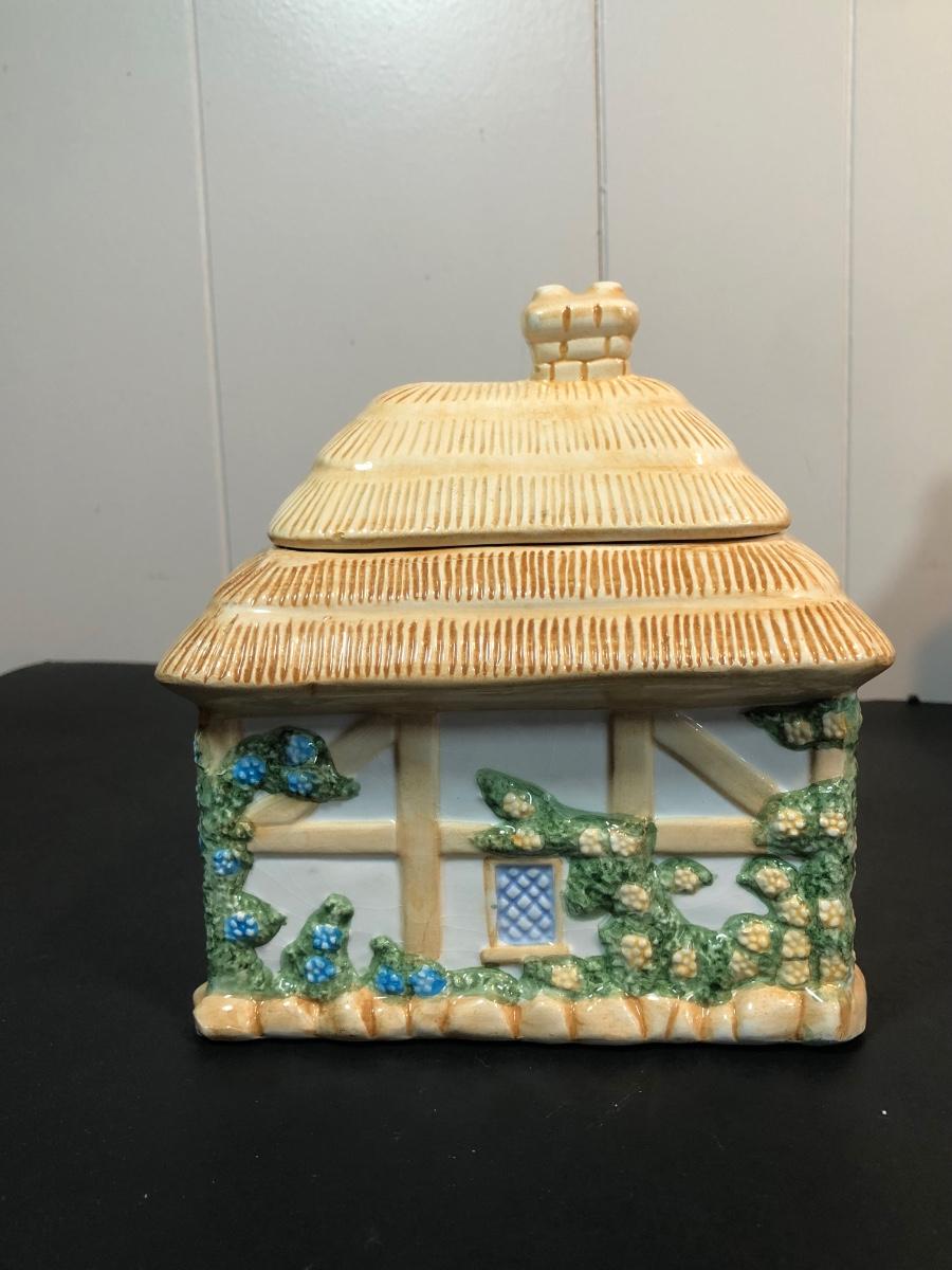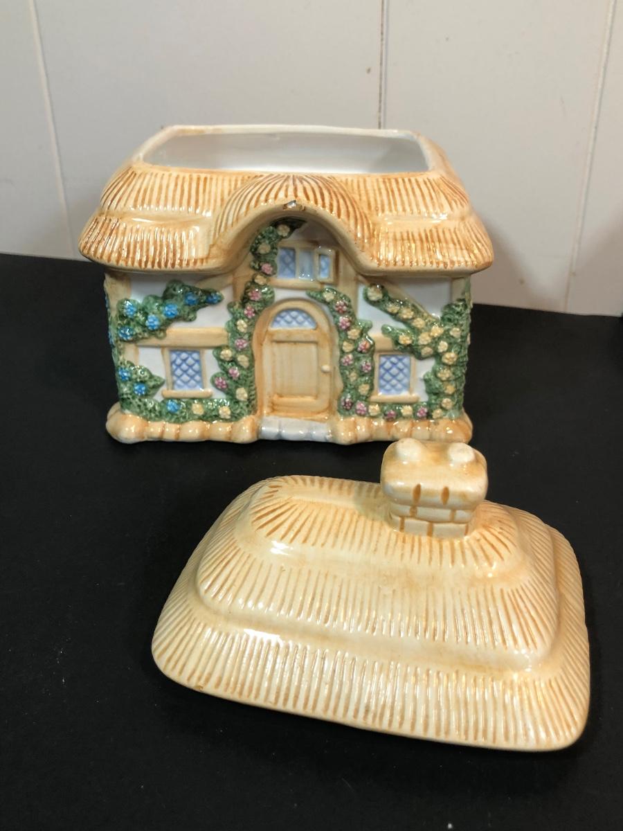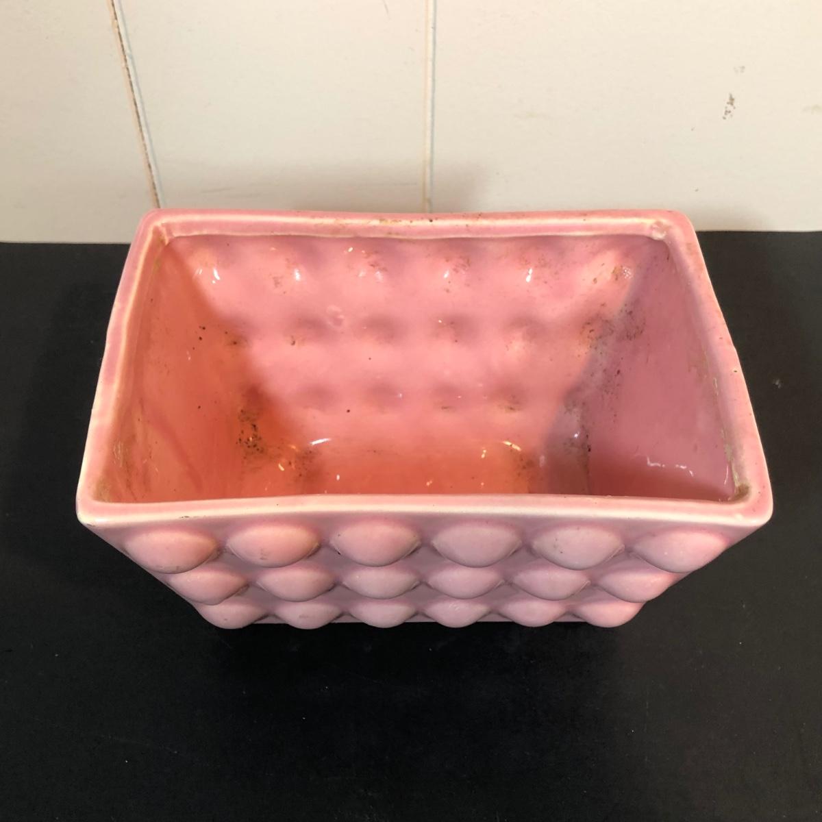 LOT 70L: Vintage Springtime Pottery & China - 1980s Teleflora Ceramic Cottage Cookie Jar, Pink Rectangular Bubble Planter Marked USA, Signed 1970s Egg Dish & More