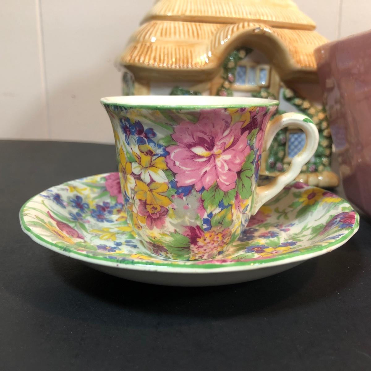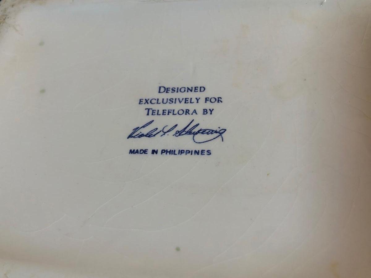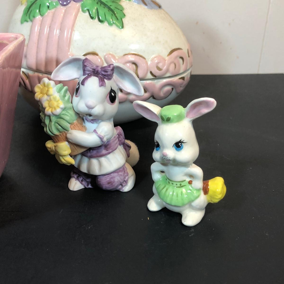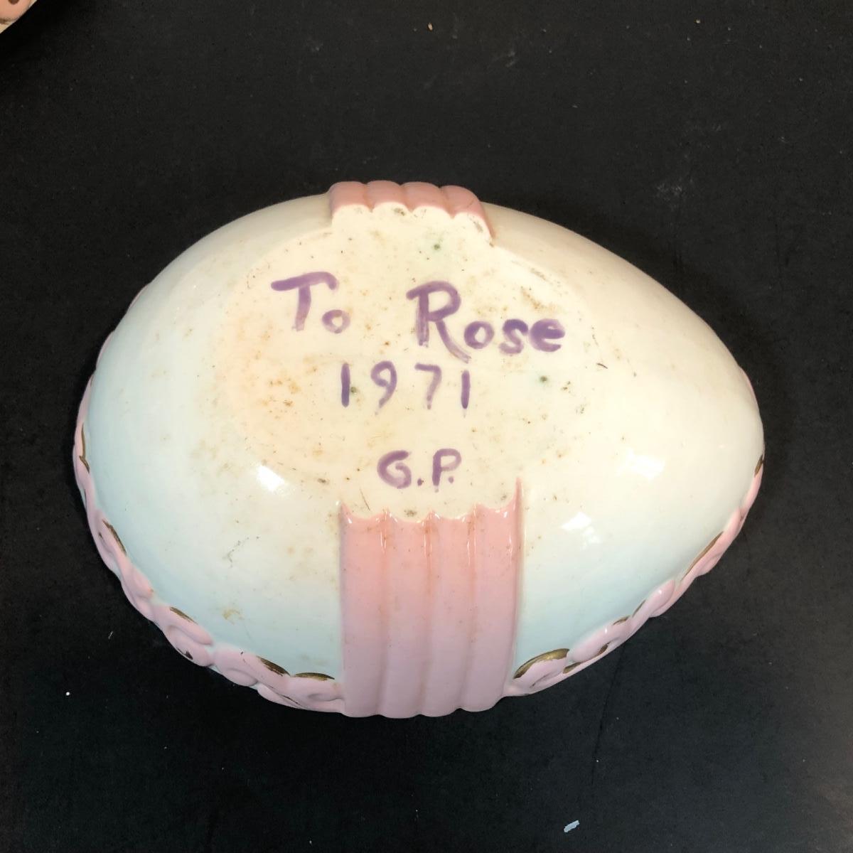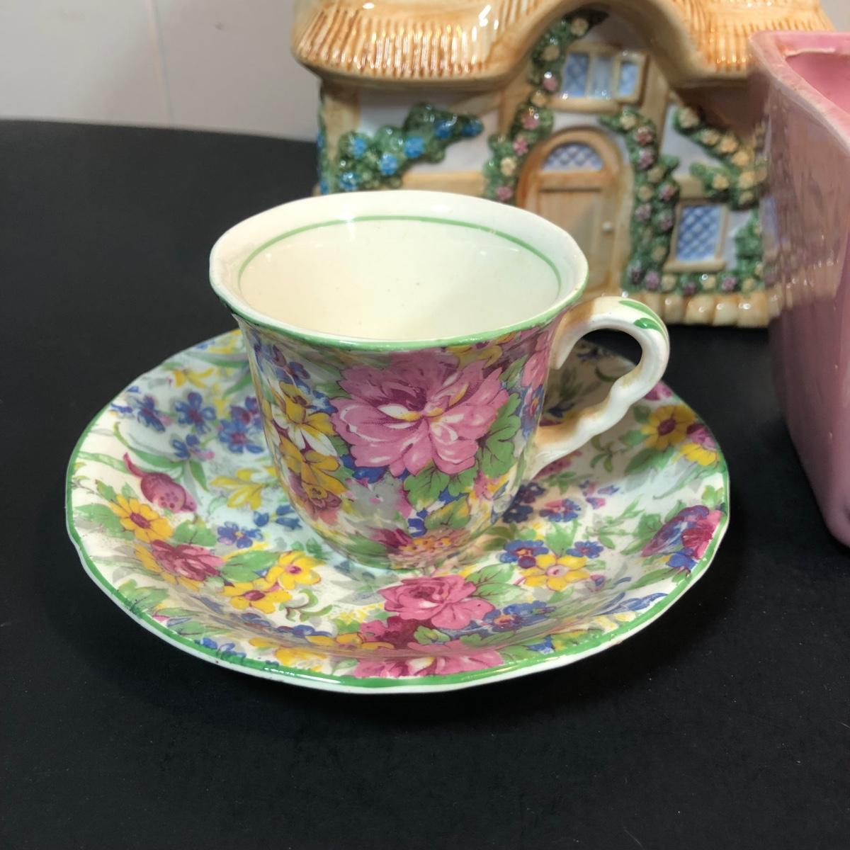 LOT 70L: Vintage Springtime Pottery & China - 1980s Teleflora Ceramic Cottage Cookie Jar, Pink Rectangular Bubble Planter Marked USA, Signed 1970s Egg Dish & More
