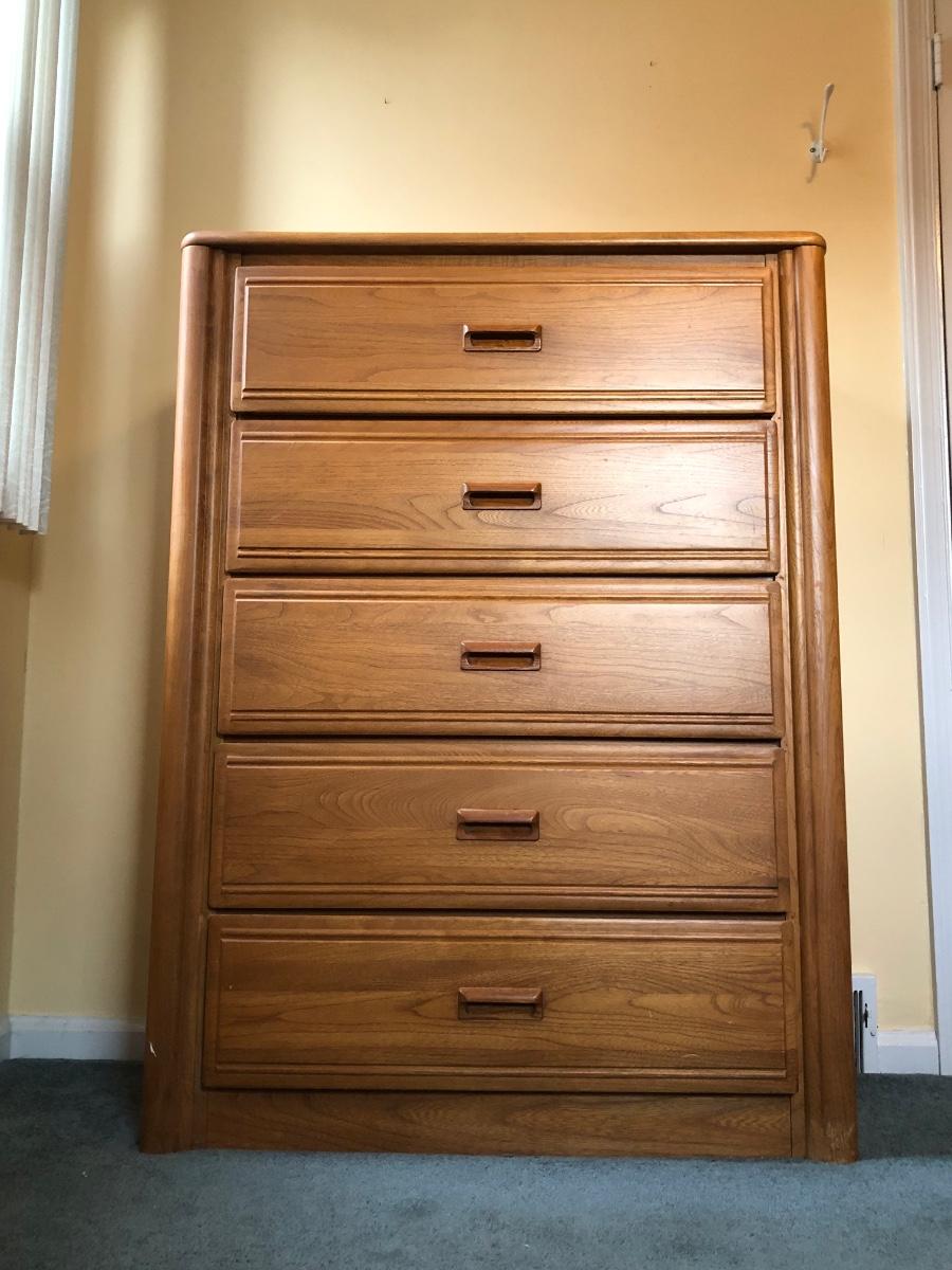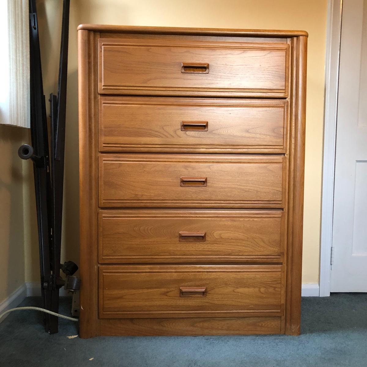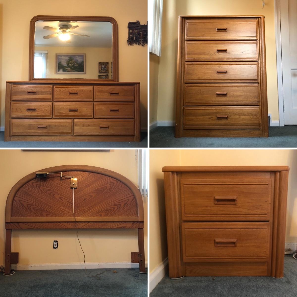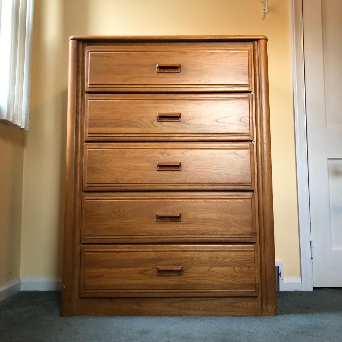 LOT 72C: Vintage Lea Bedroom Set - Headboard, Dresser w/ Mirror, 5 Drawer Dresser & End Table