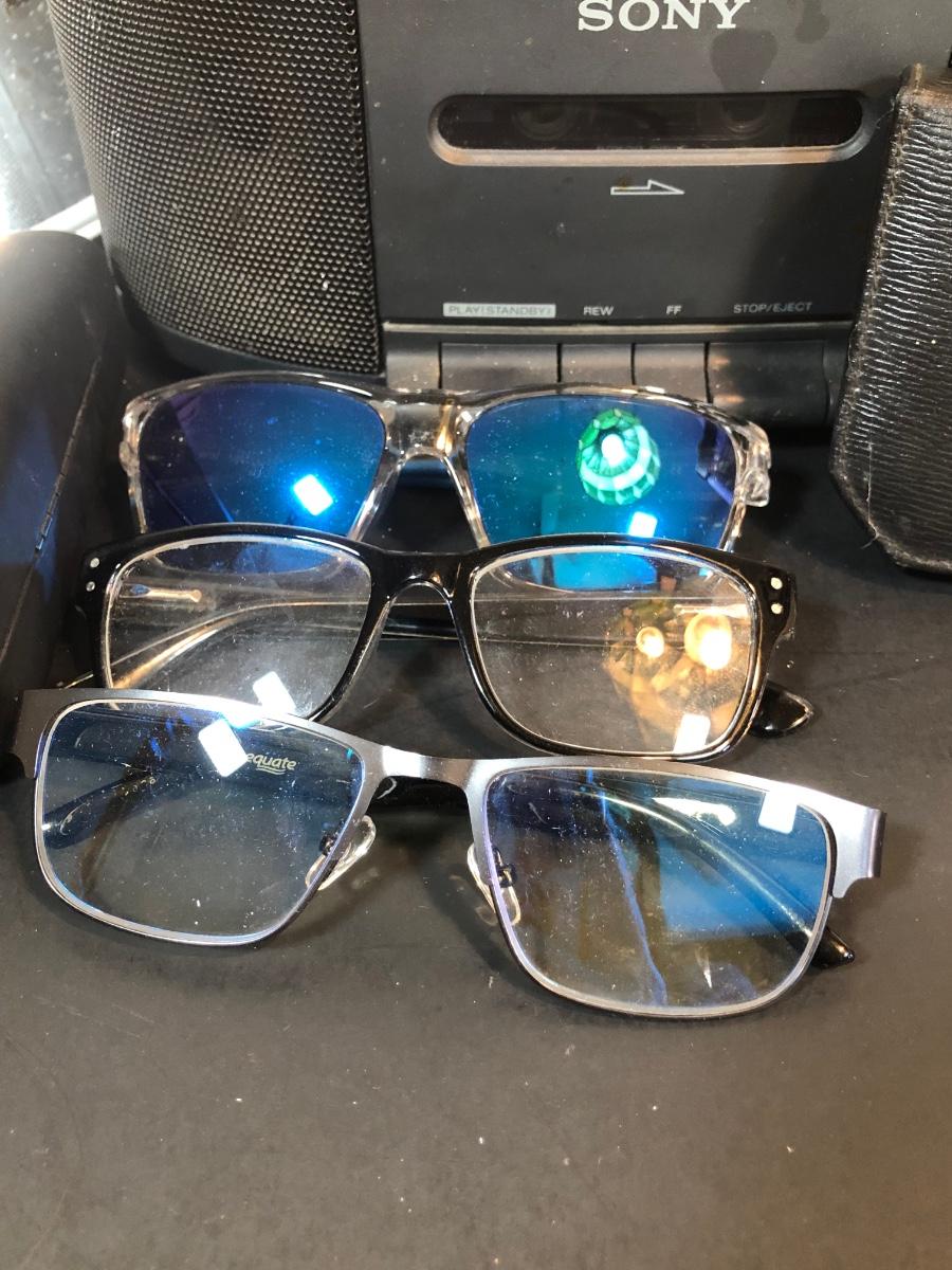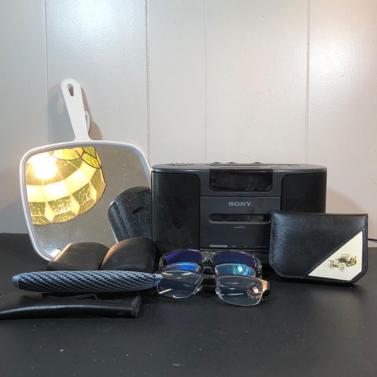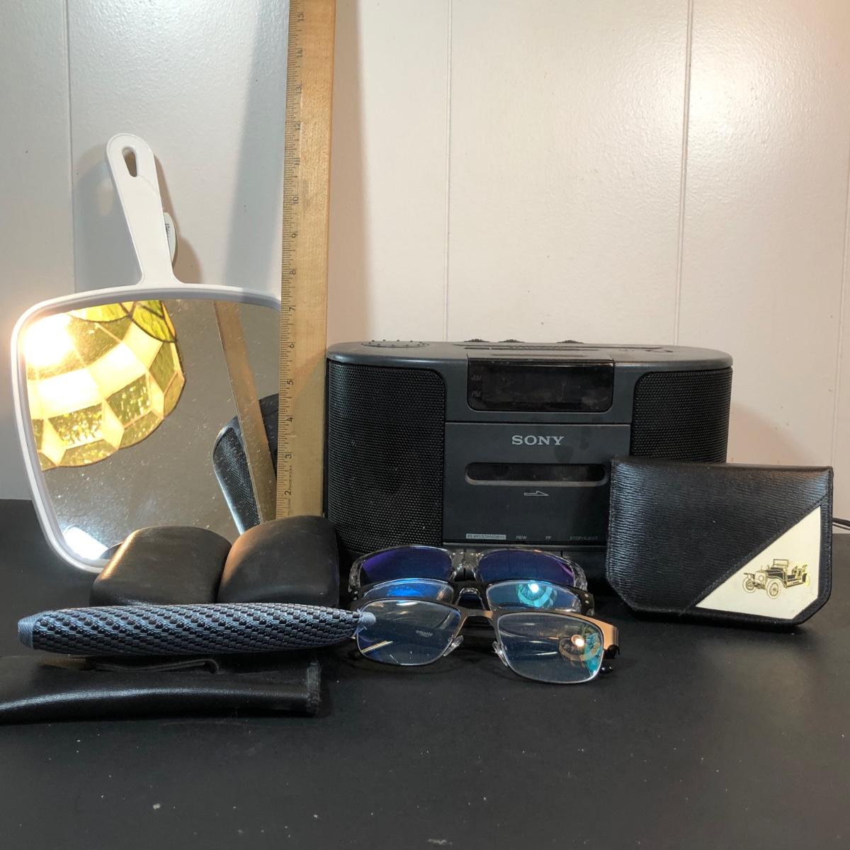 LOT 92K: Men's Dresser Collection - Vintage Grooming Kit, Sony Clock Radio Model ICF-CS650, Glasses & Cases