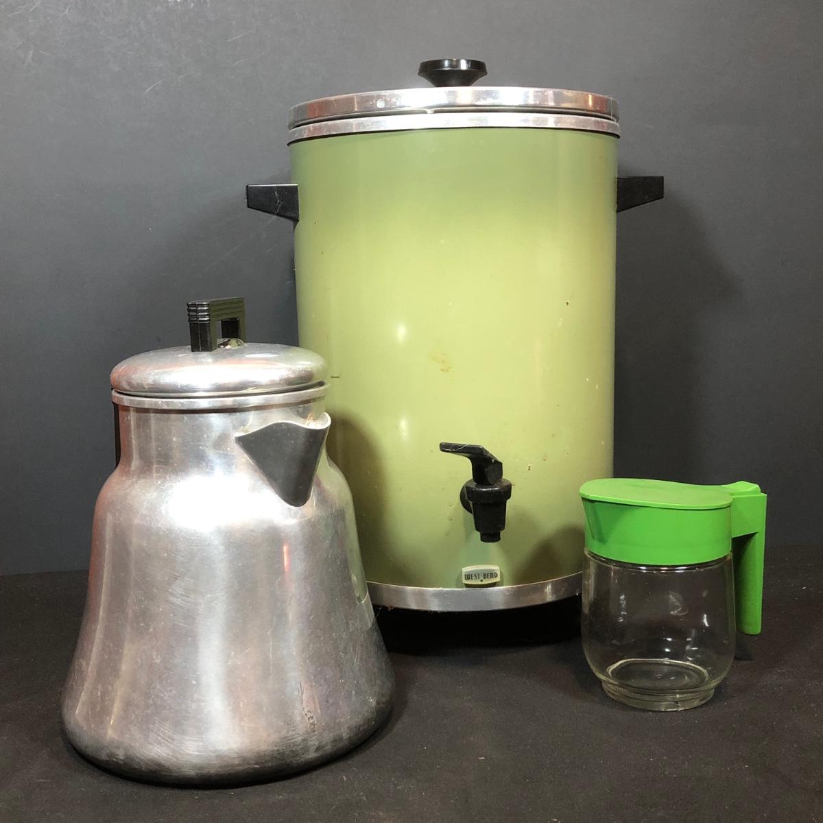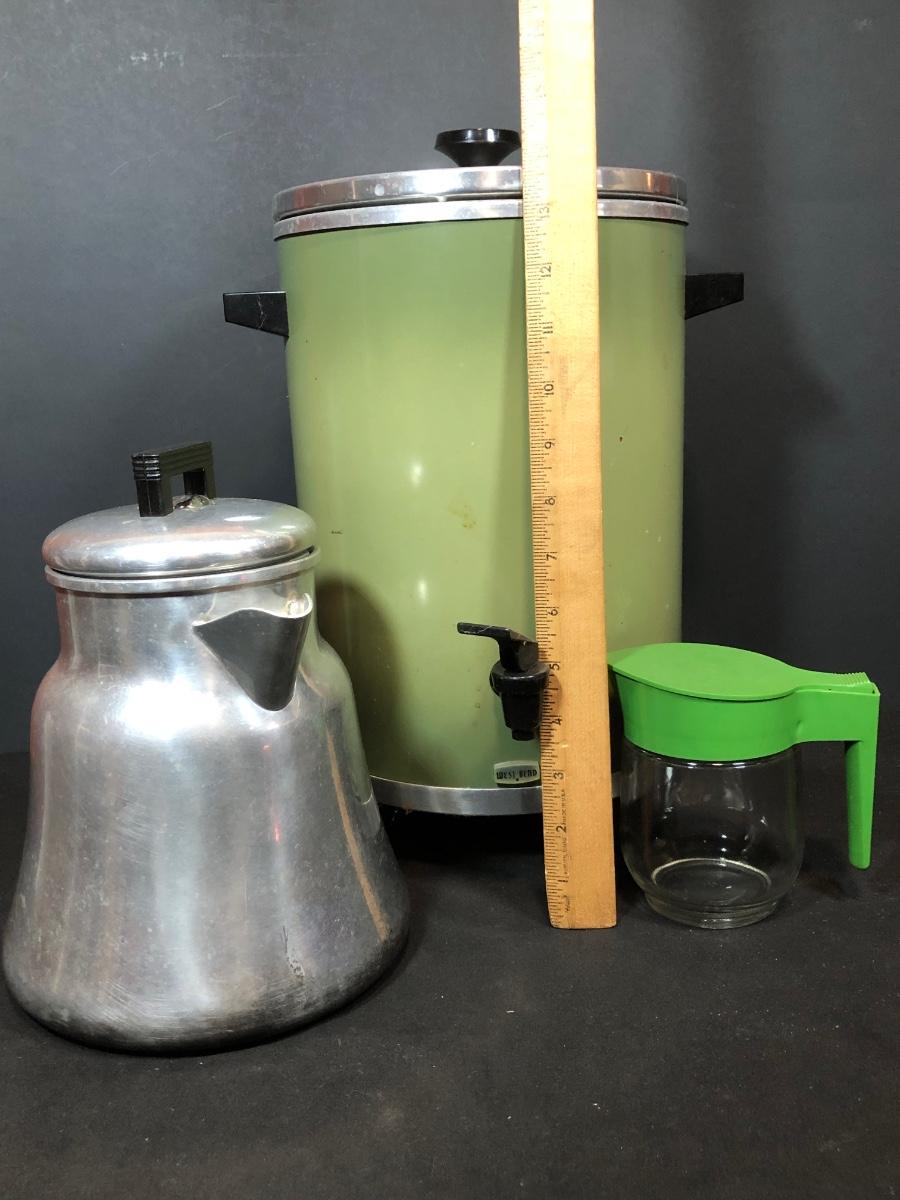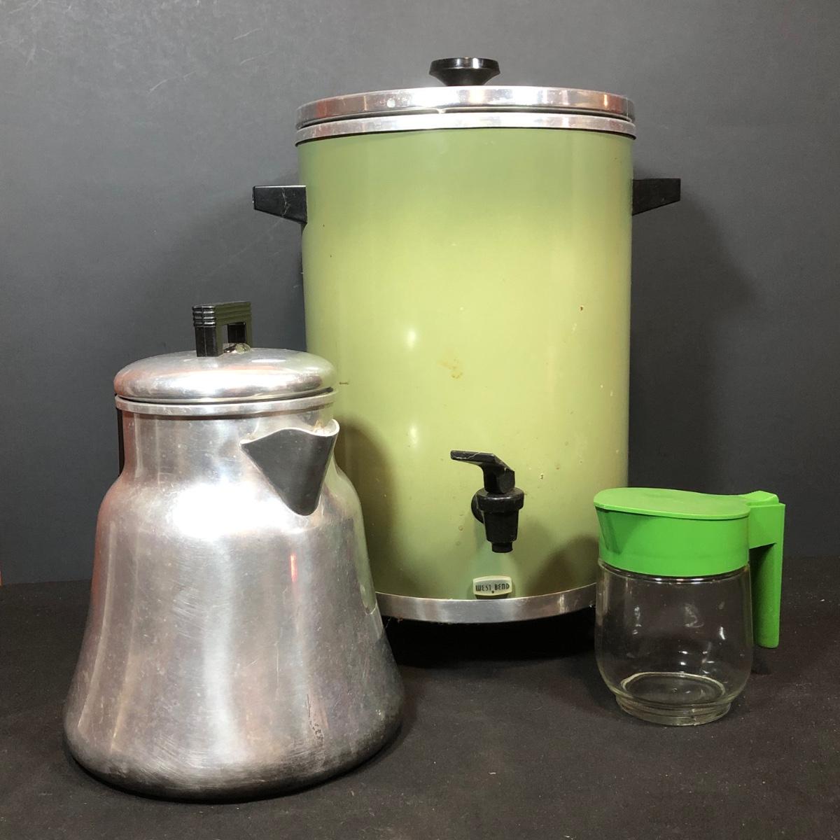 LOT 114B: Vintage Green West Bend Electric Percolator, Wear-Ever Aluminum Percolator No 3012 & Glass syrup Jug