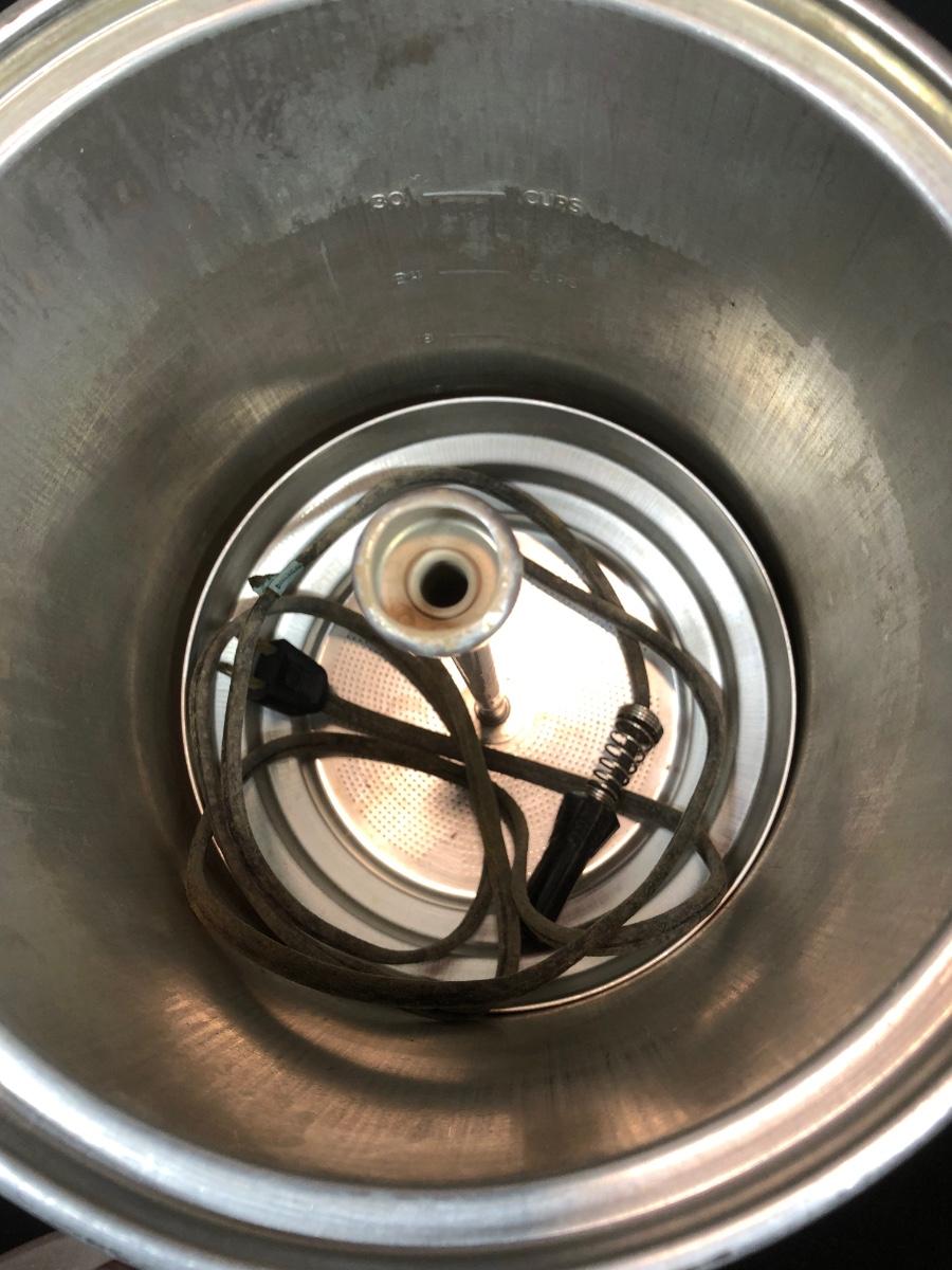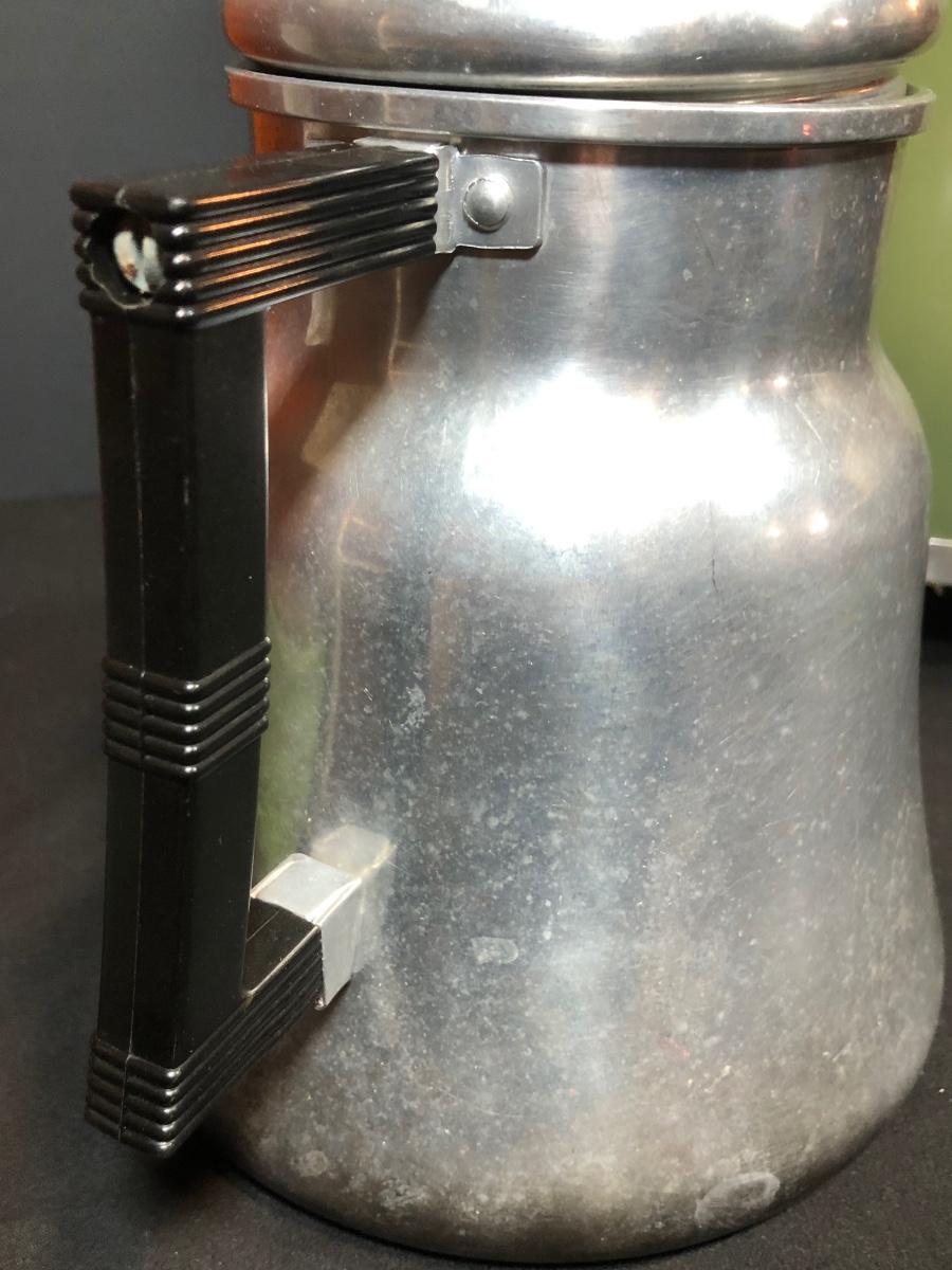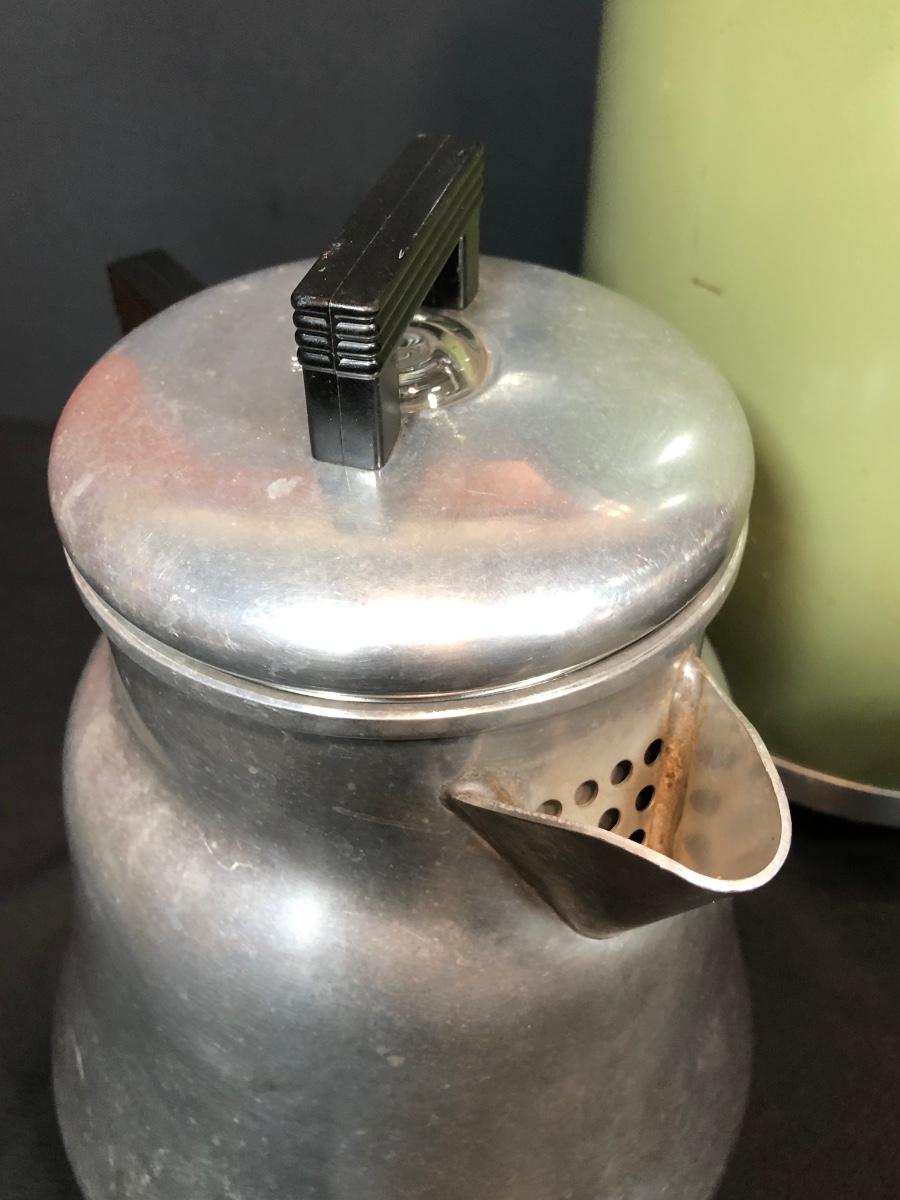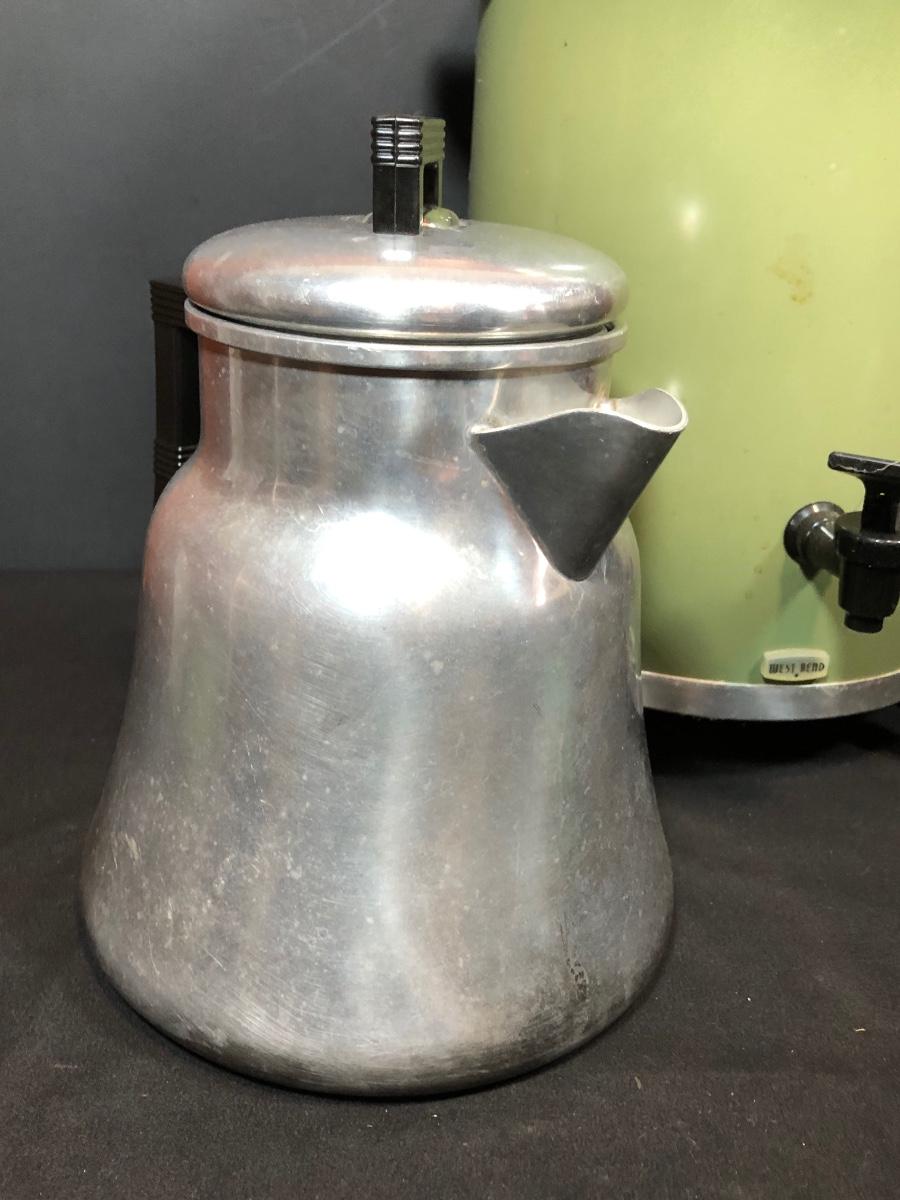LOT 114B: Vintage Green West Bend Electric Percolator, Wear-Ever Aluminum Percolator No 3012 & Glass syrup Jug