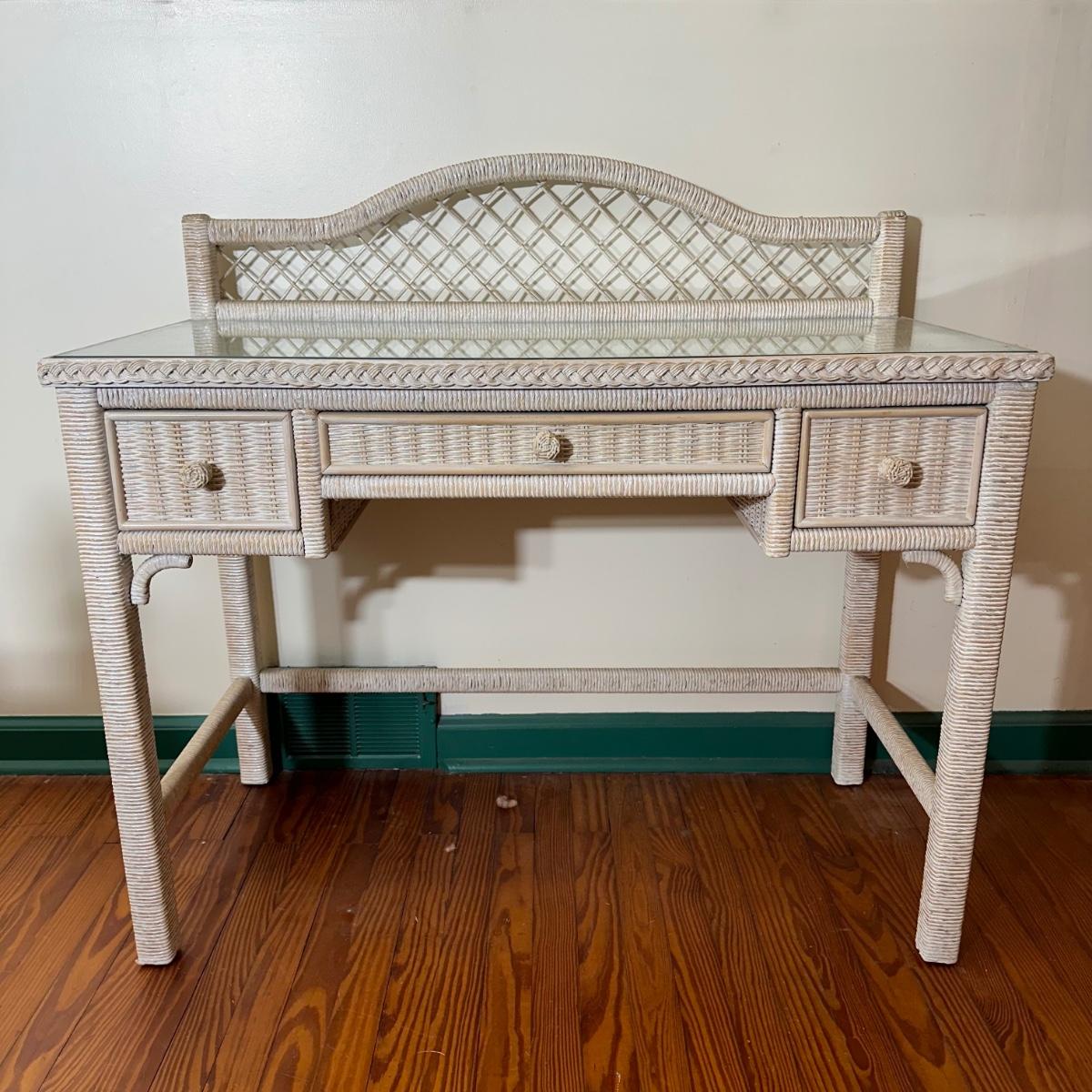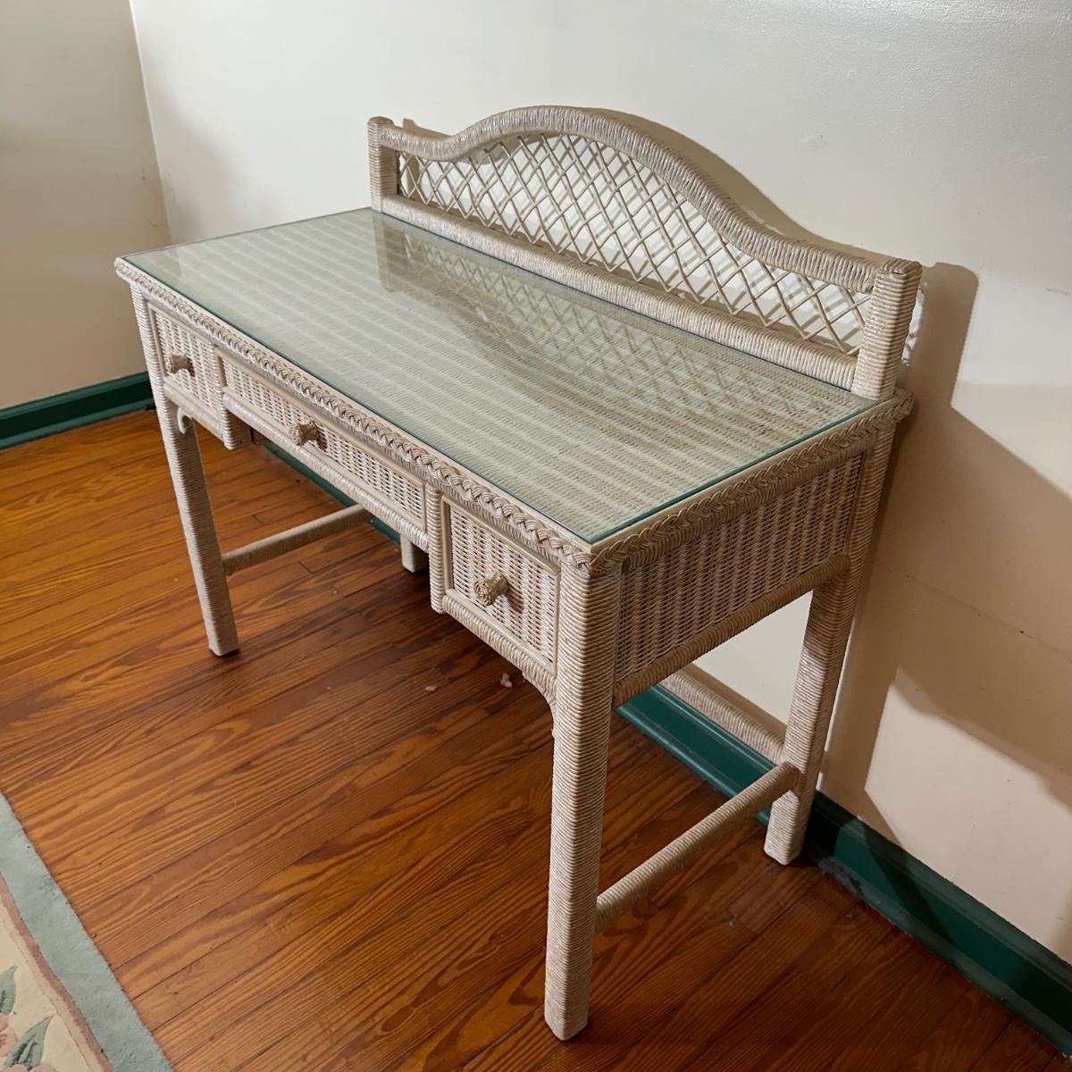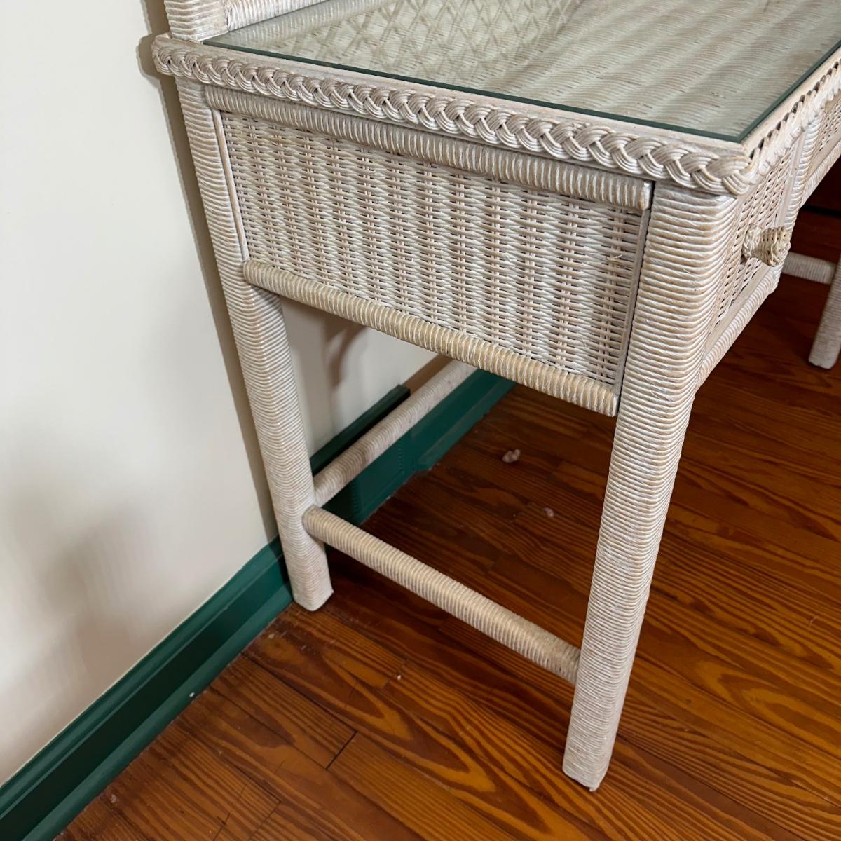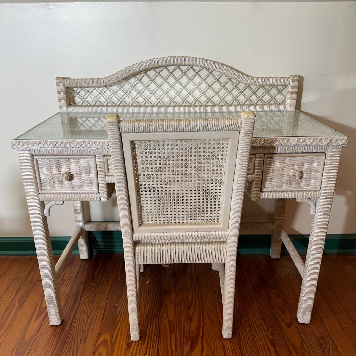 LOT 129X: Henry Link White Wicker Glass Top Writing Desk W/ Chair