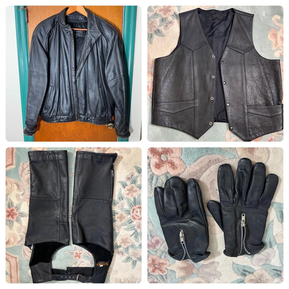 LOT 153X: Leather Motorcycle Gear - Jacket, Vest, Chaps & Gloves