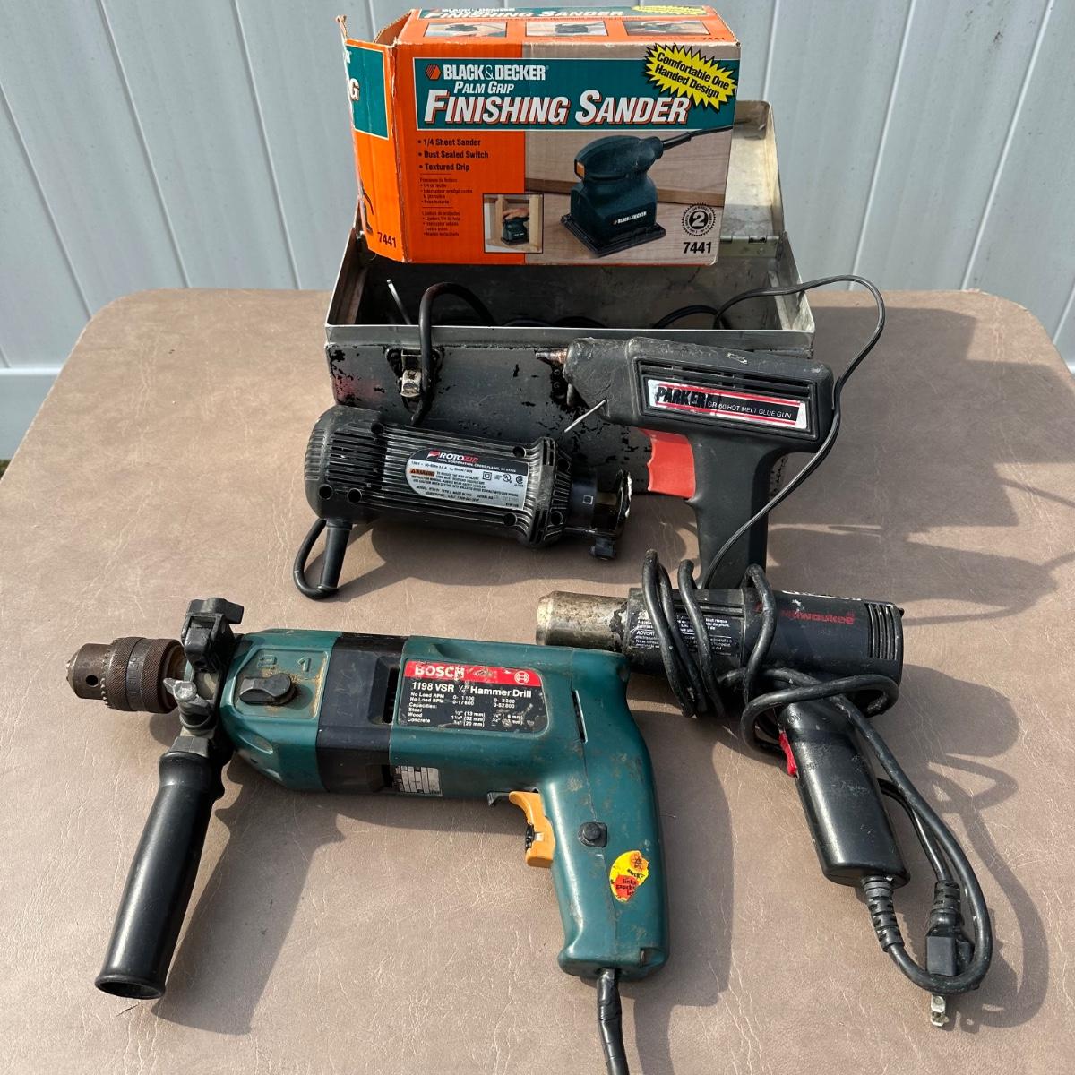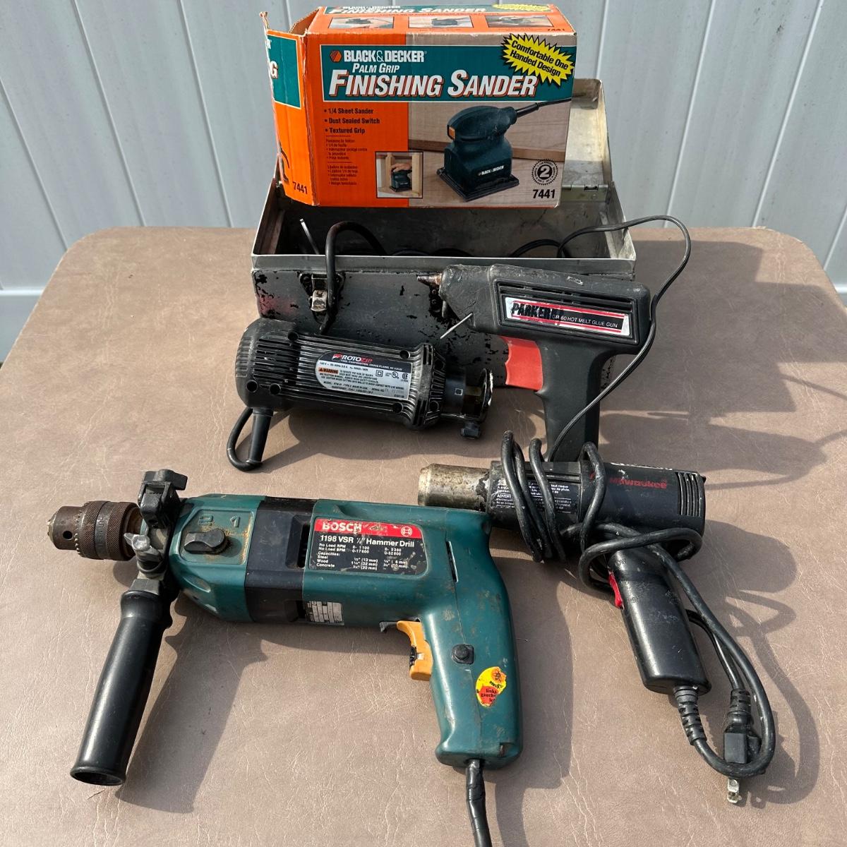 LOT 173S: Power Tools - Bosch Hammer Drill, Milwaukee Heat Gun, Black & Decker Belt Sander, & Rotozip