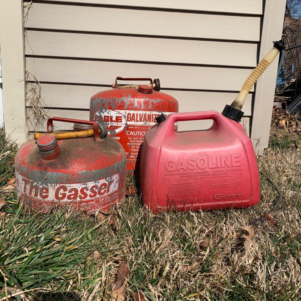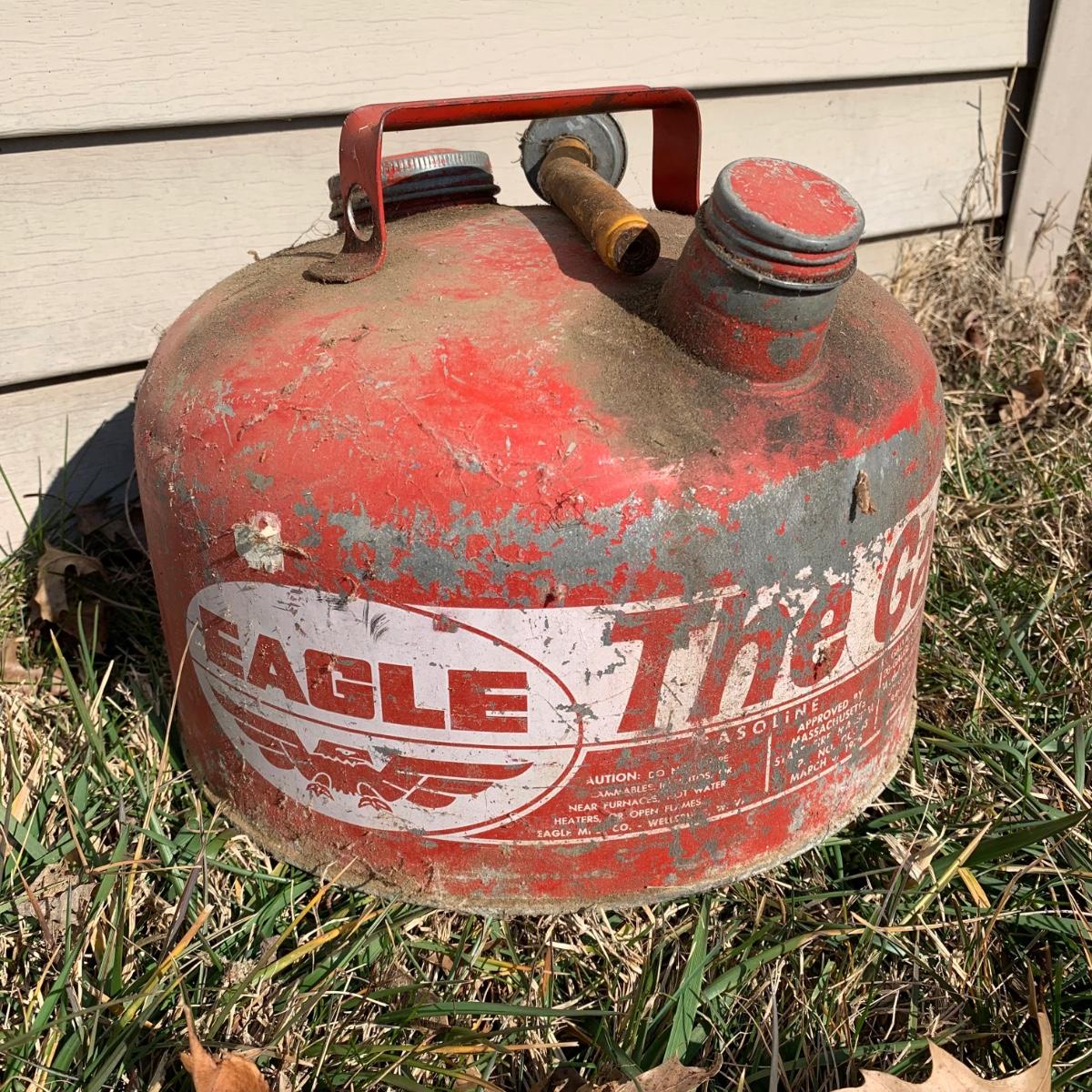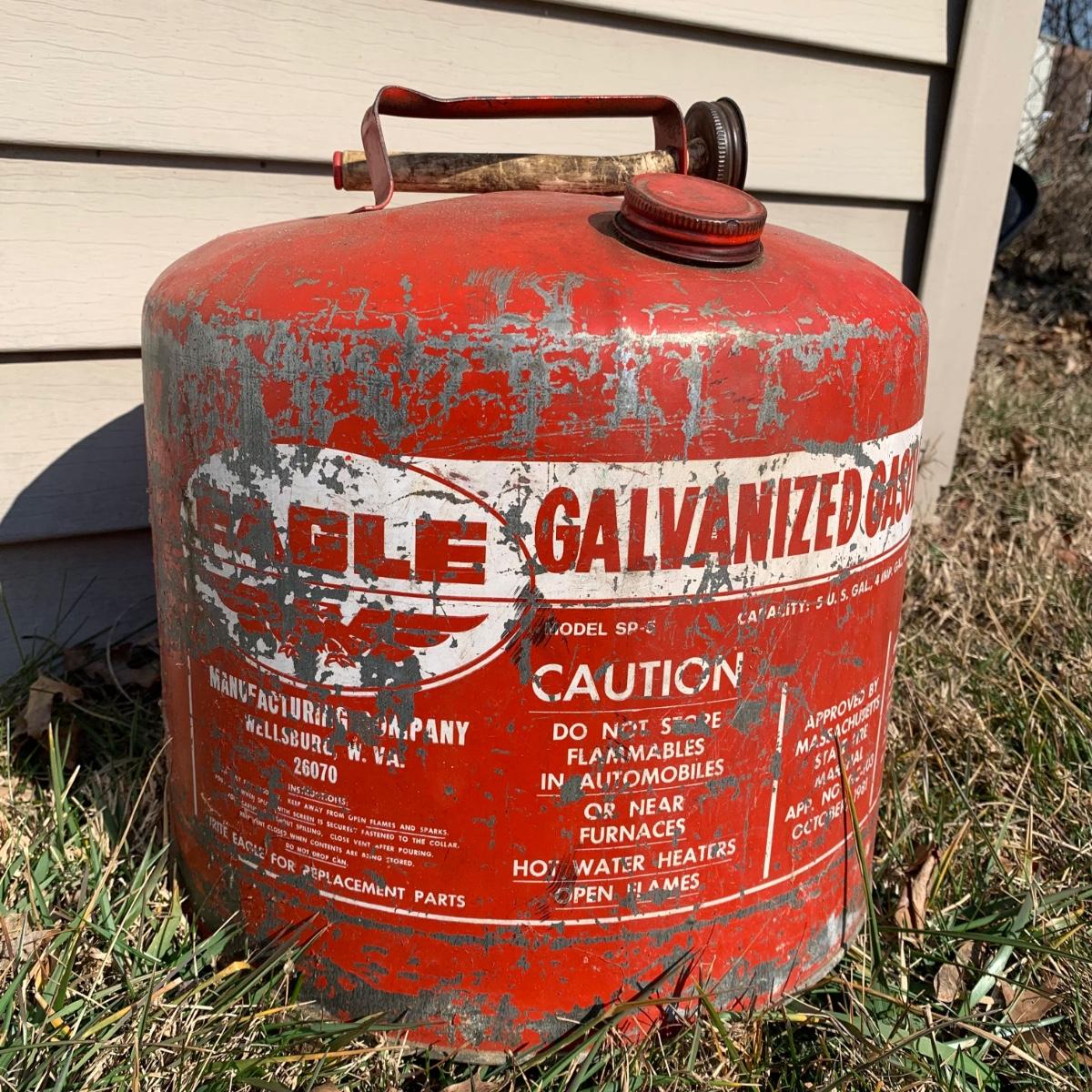 LOT 203 S: 2 Vintage Galvanised Steel Eagle Gas Cans: 5 & 2.5 Gallons & Plastic Gas Can