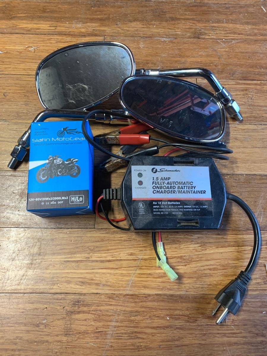 LOT 213 S: Slatin Motogear Motoled Headlight, Schumacher 1.5 AMP Fully Automatic Onboard Battery Charger/Maintainer, Motorcycle Side Mirrors, & More