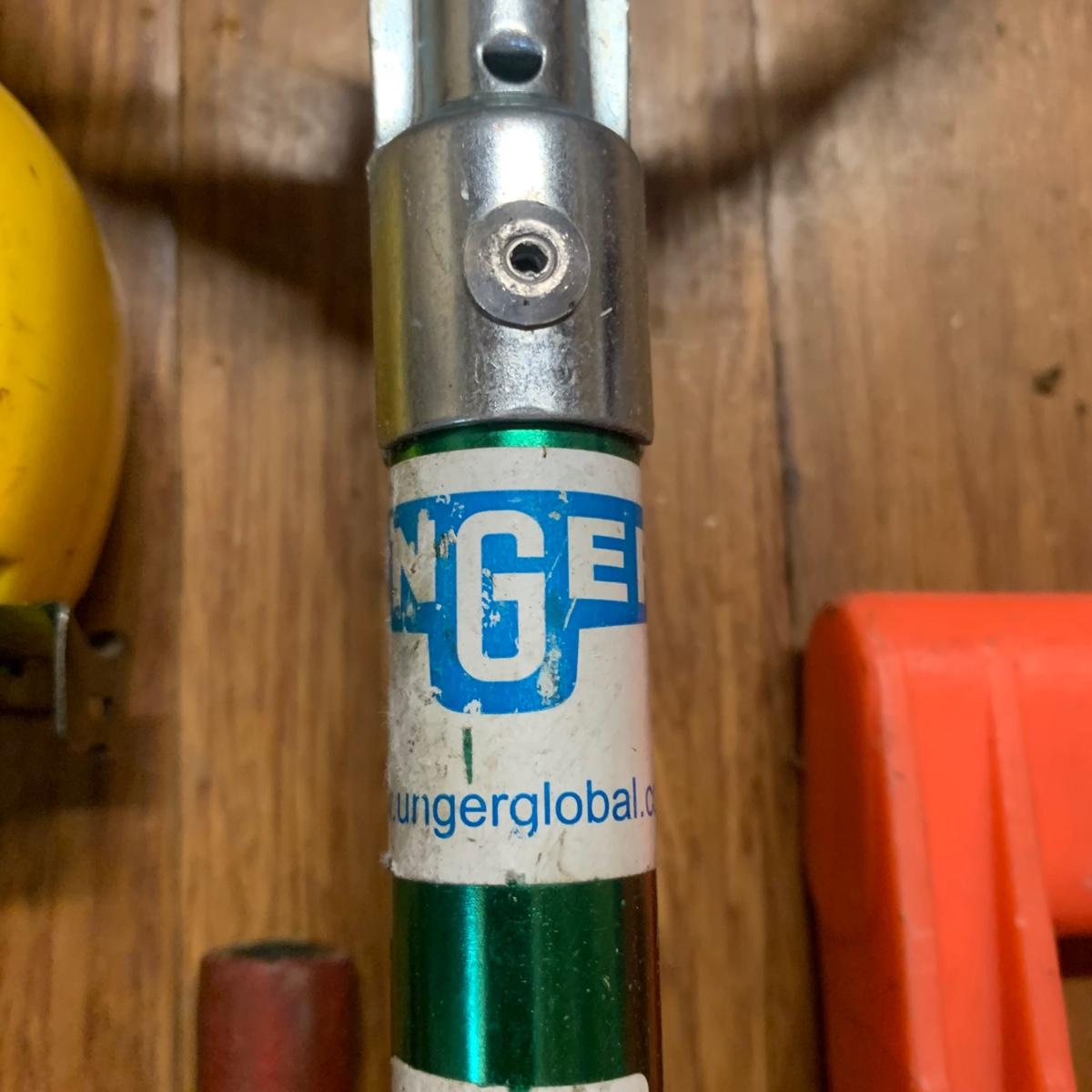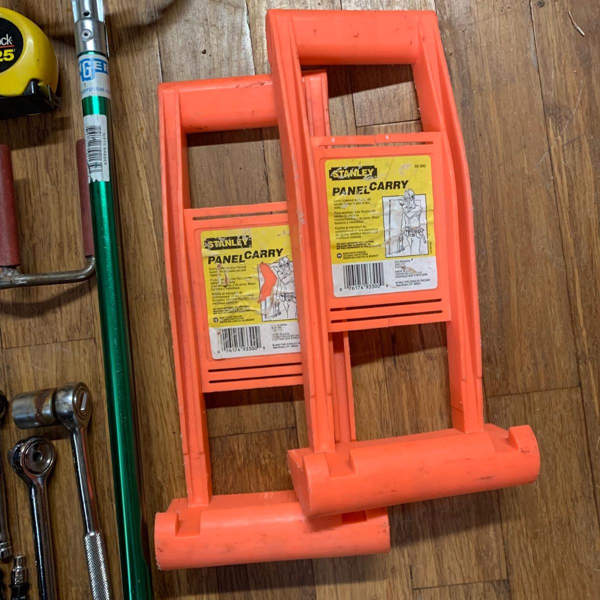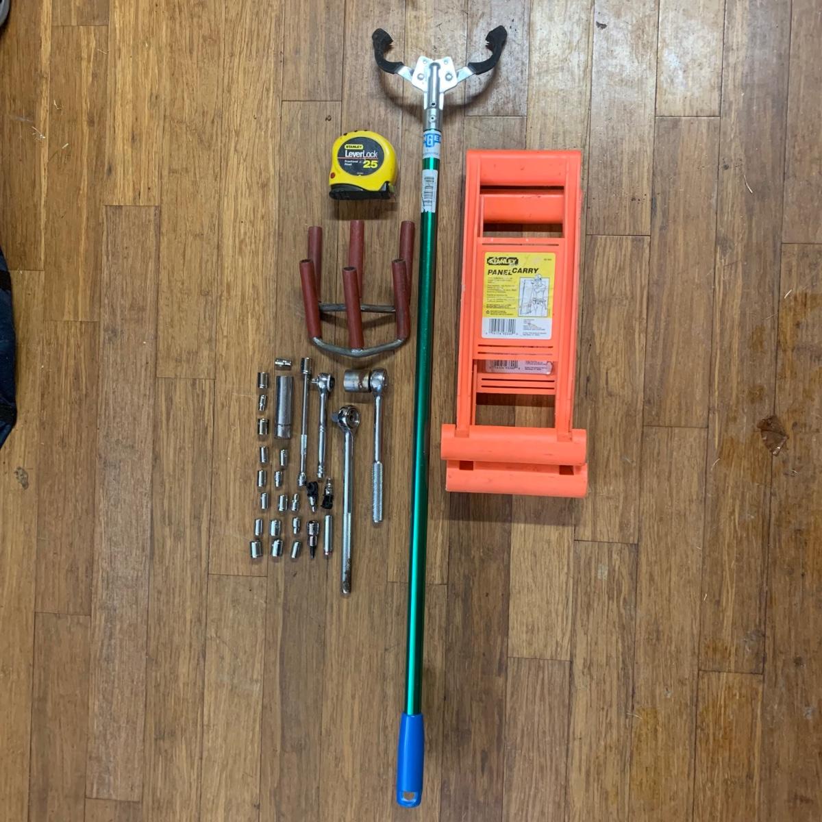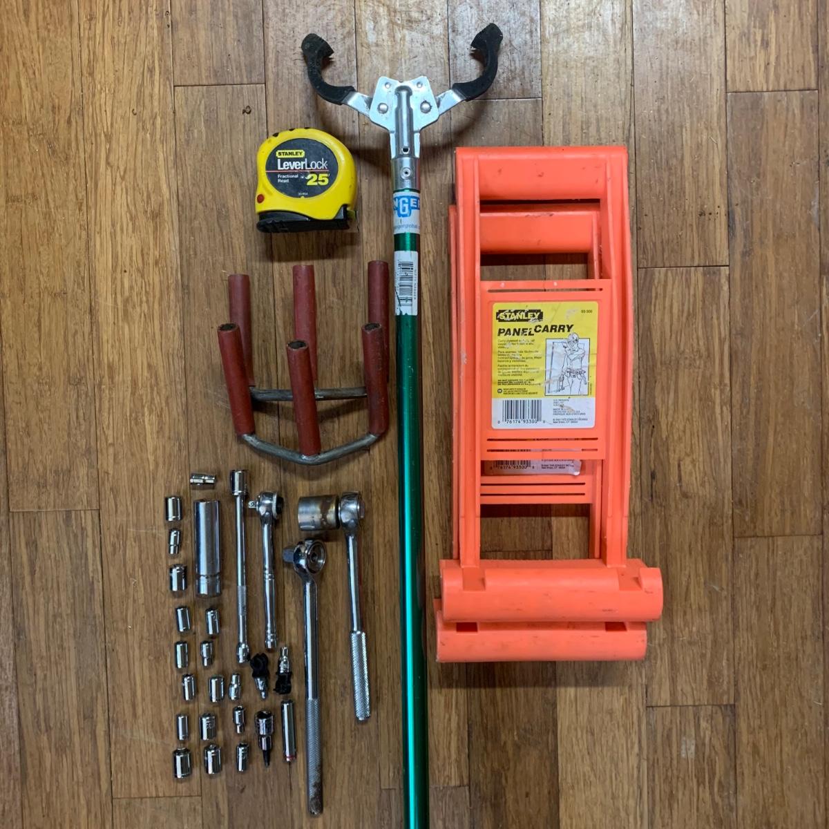 LOT 218 S: Stanley Tape Measure W/ Panel Carriers, Metal Panel Carriers, Ratchets W/ Bits, & Unger Gripper