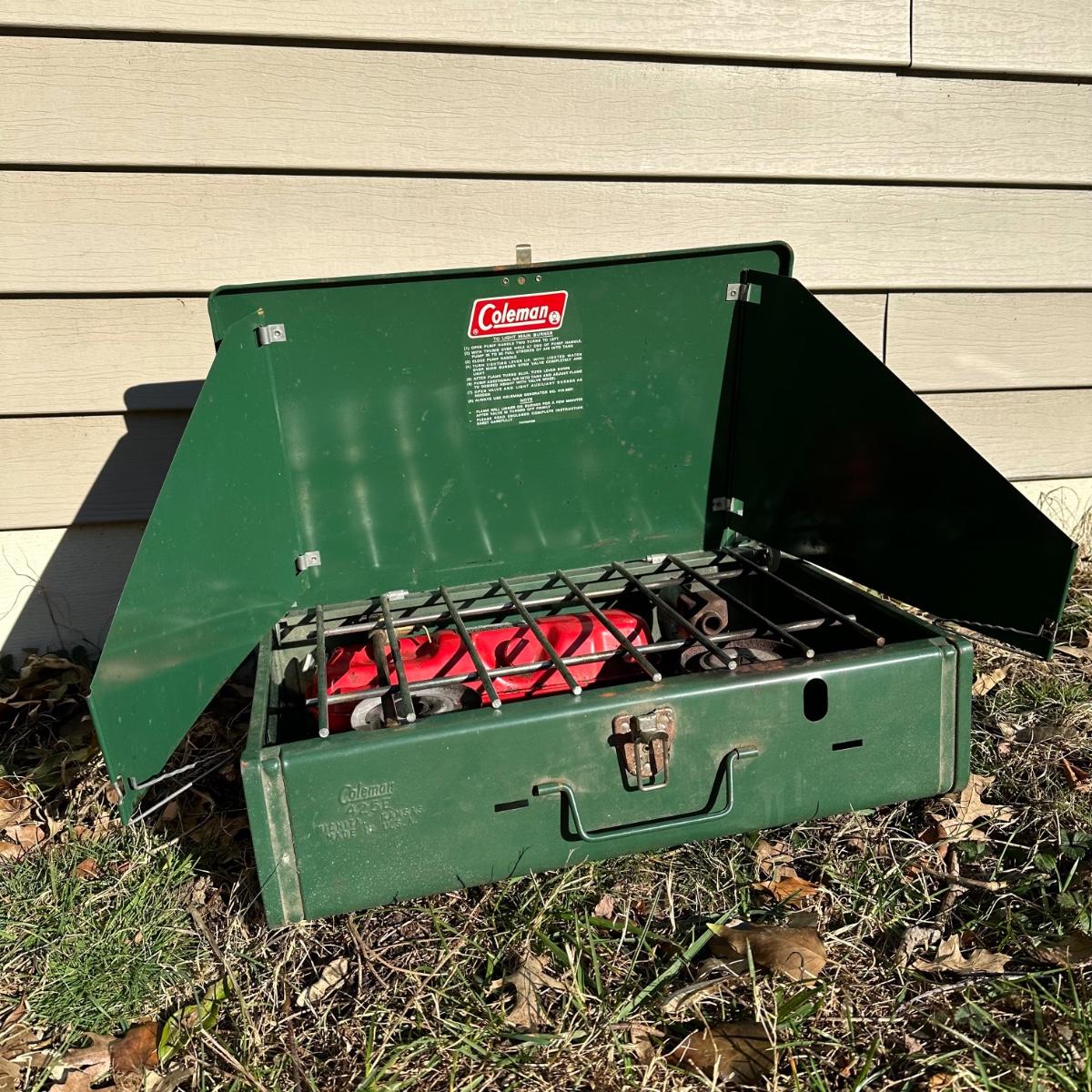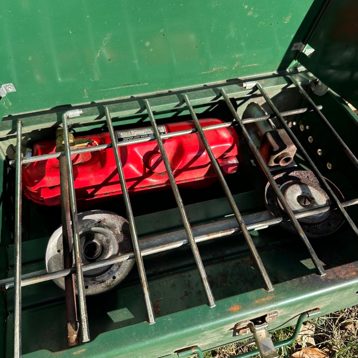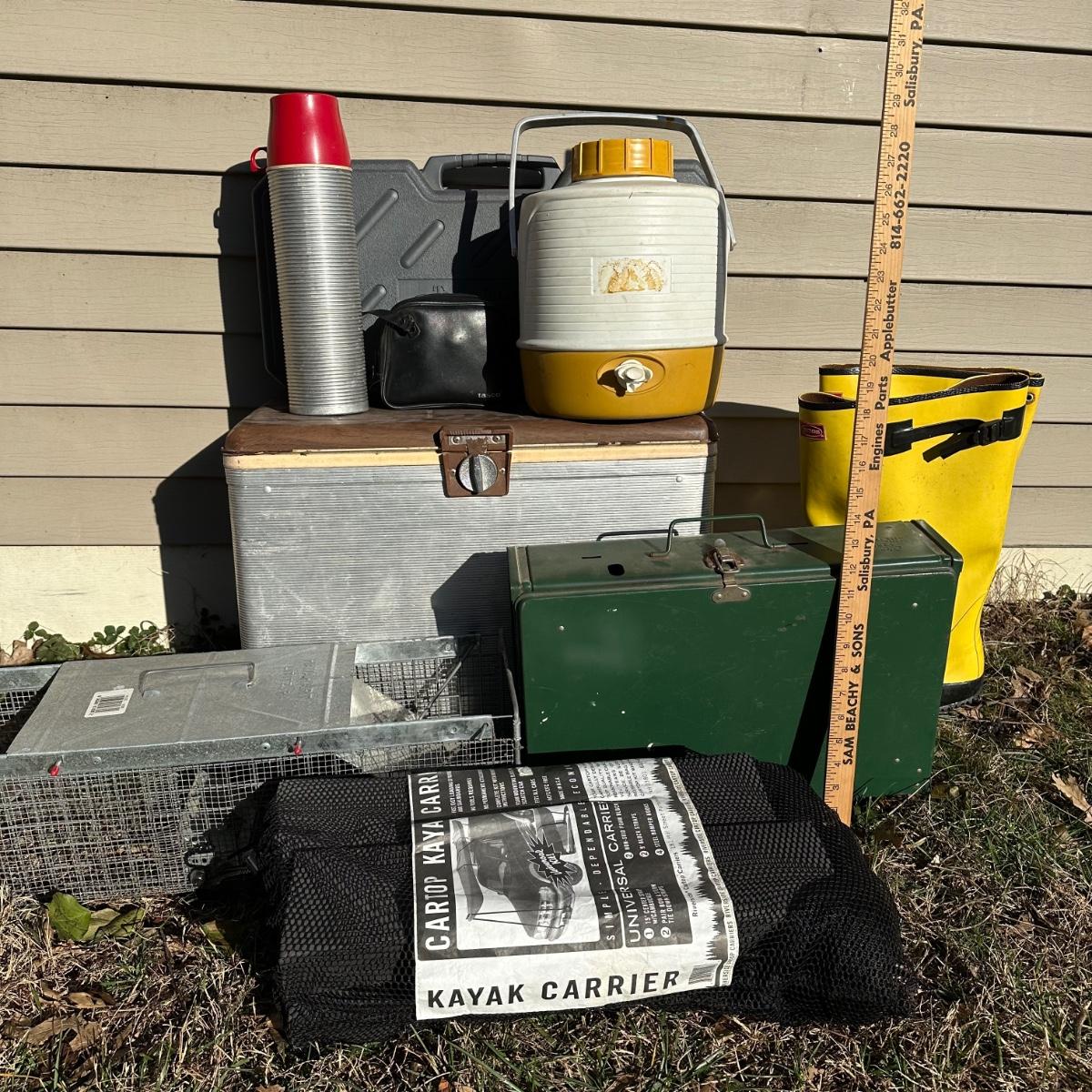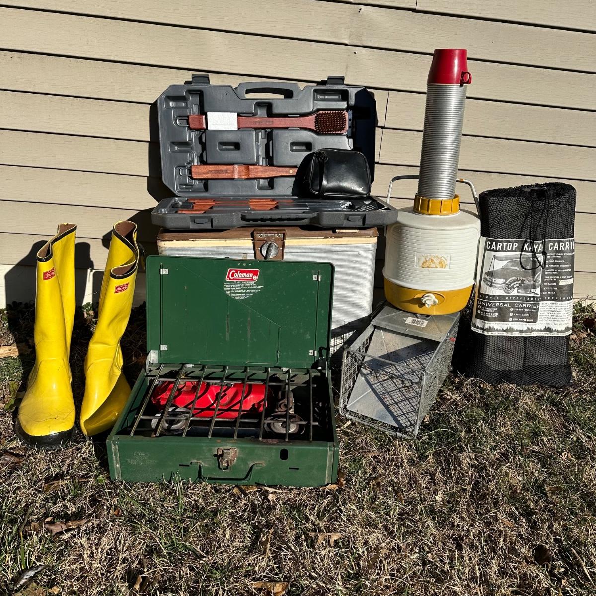 LOT 256S: Camping Lot - Vintage Ice Chest, Tasco Binoculars, Thermos, Coleman Portable Grill & More