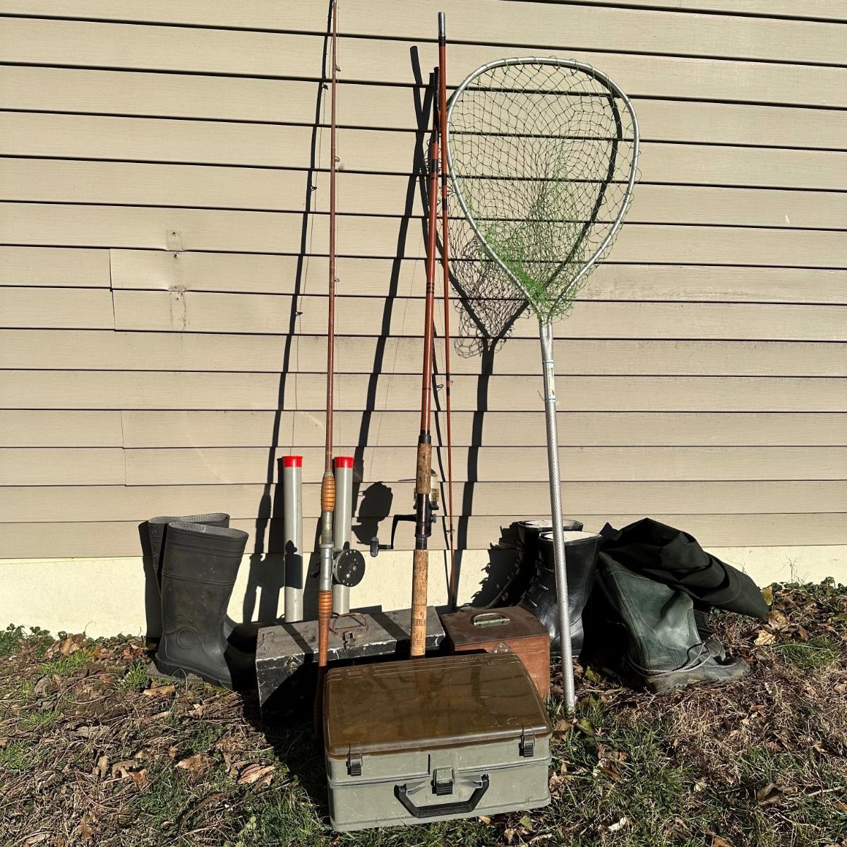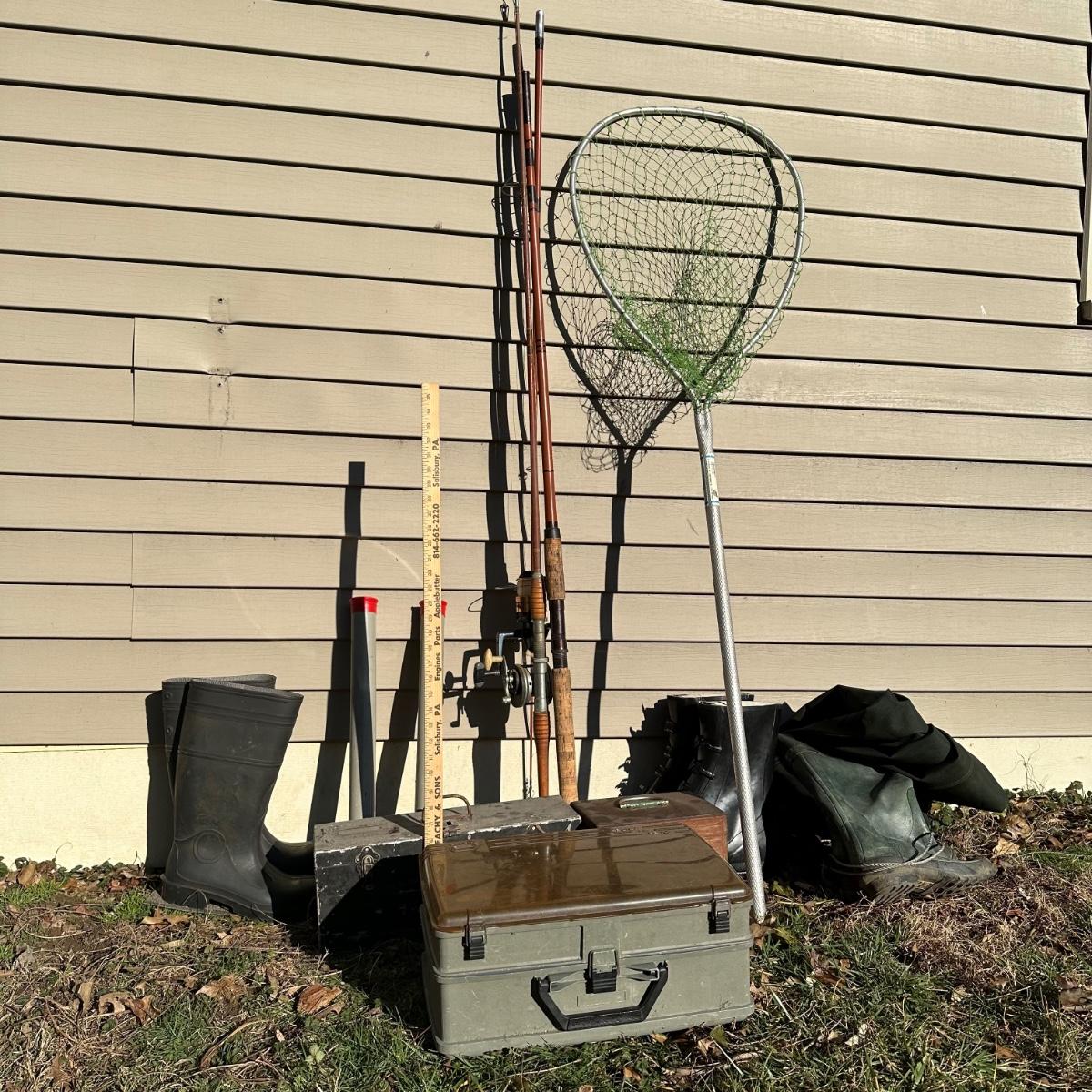 LOT 257S: Salt Water Fishing Gear - Rods/Reels, Sand Spikes, Tackle Boxes, Net, Waders & More