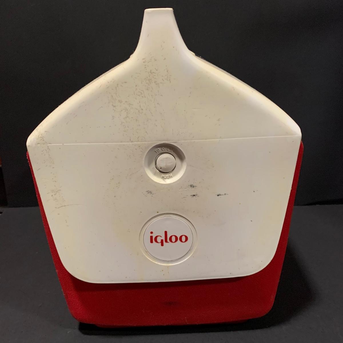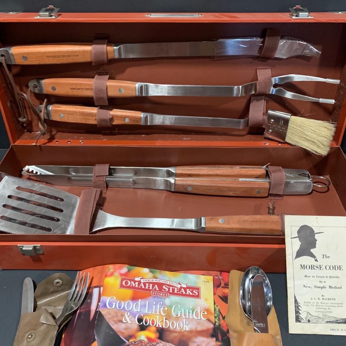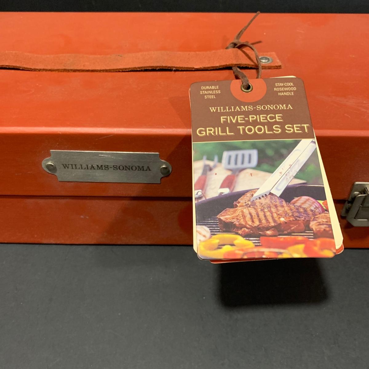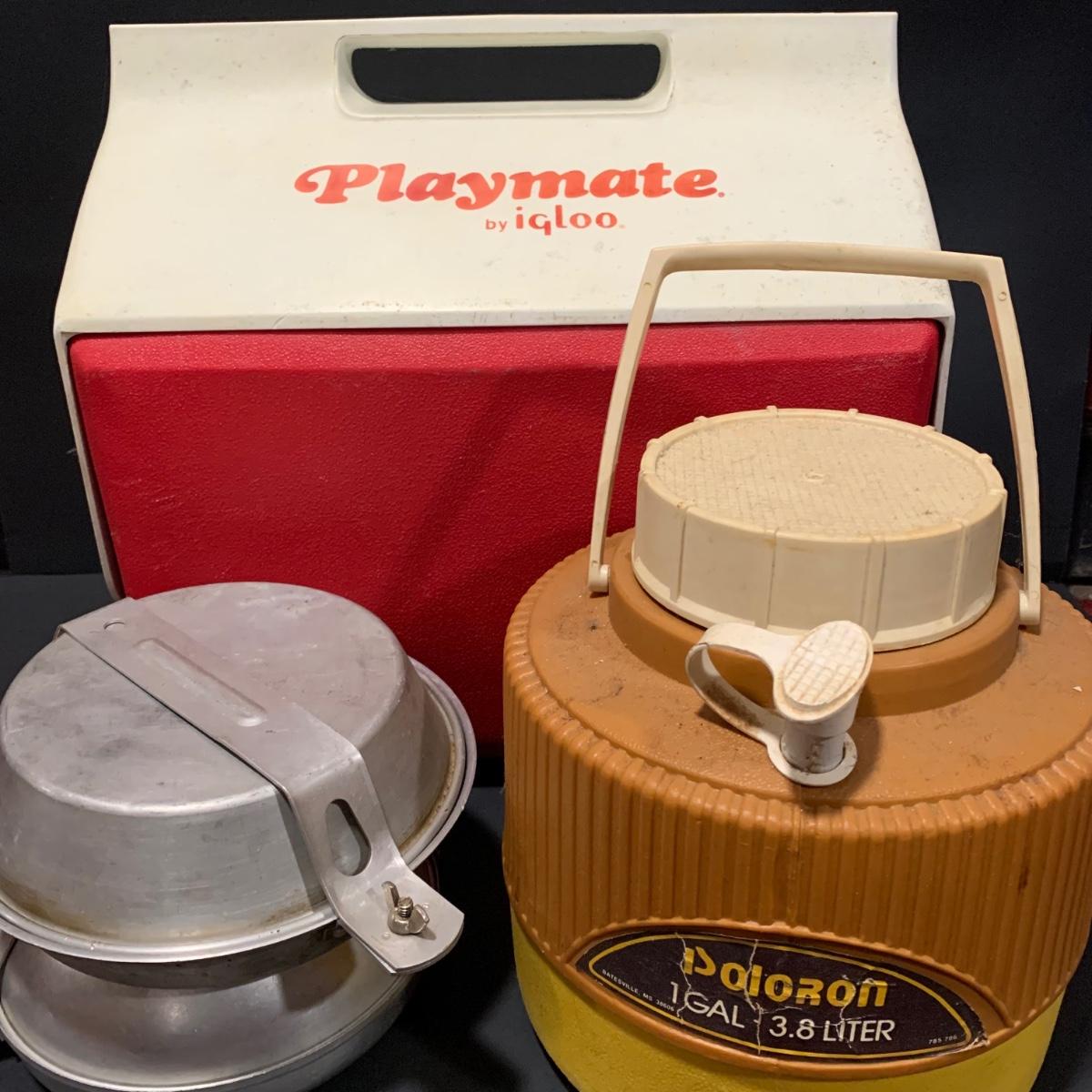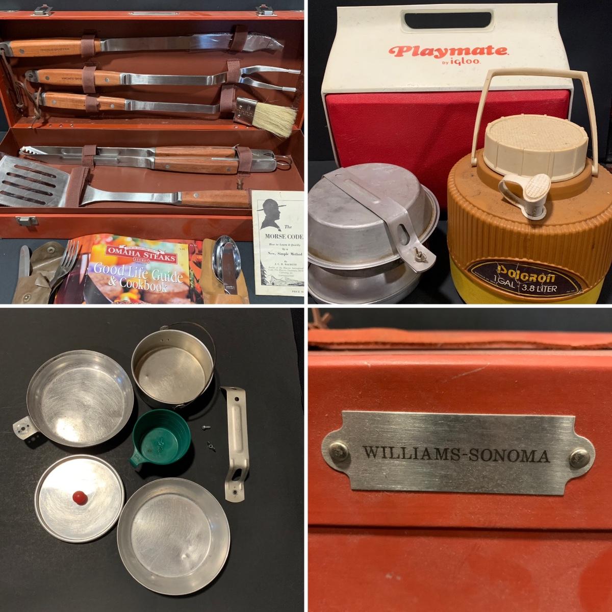 LOT 265 B: Camping Collection: William Sonoma 5 Piece Grill Tool Set, Igloo Playmate Cooler, Poloron 1 Gallon Jug, & More