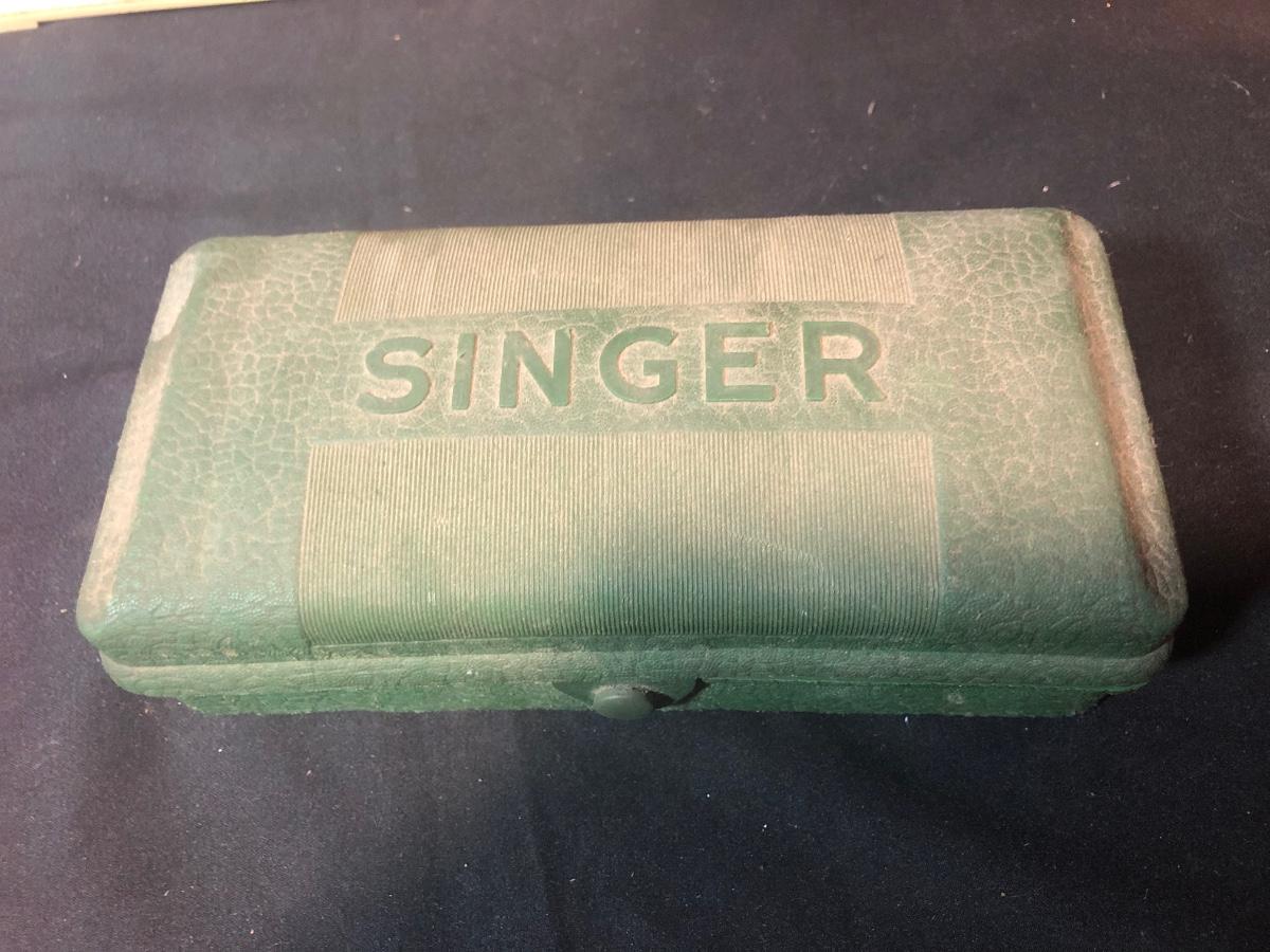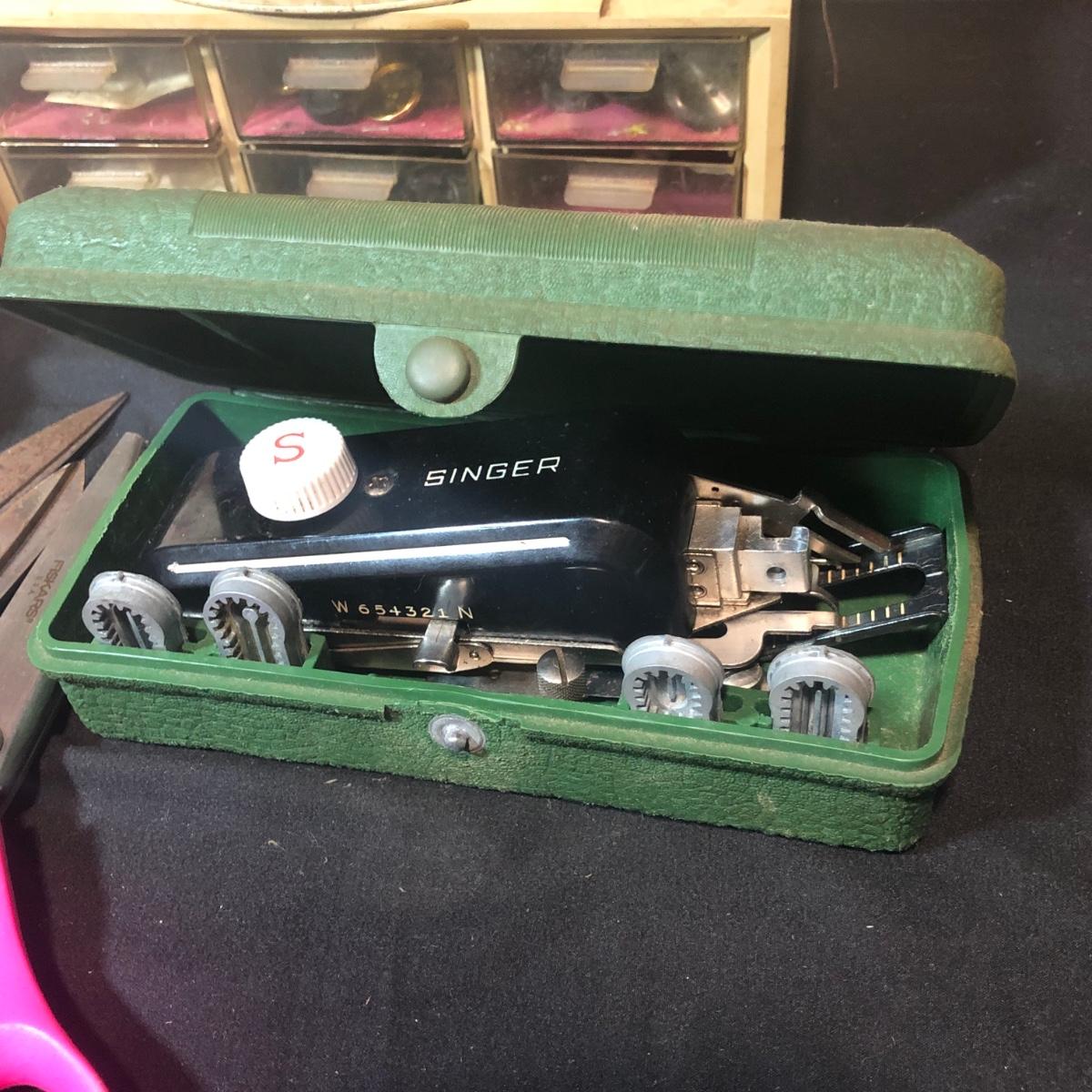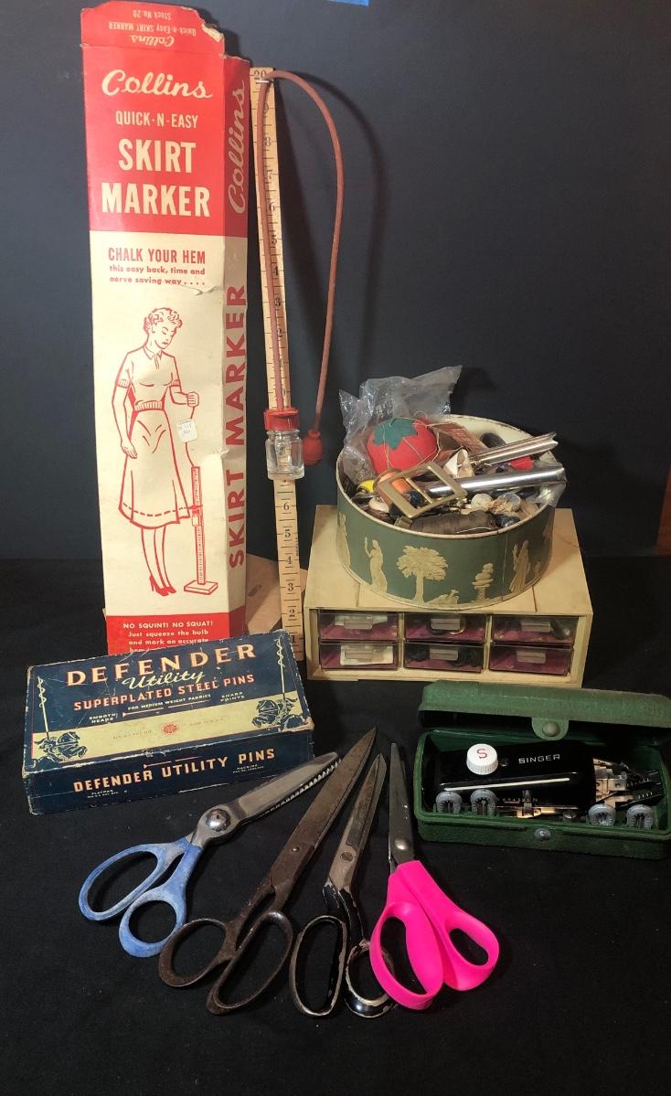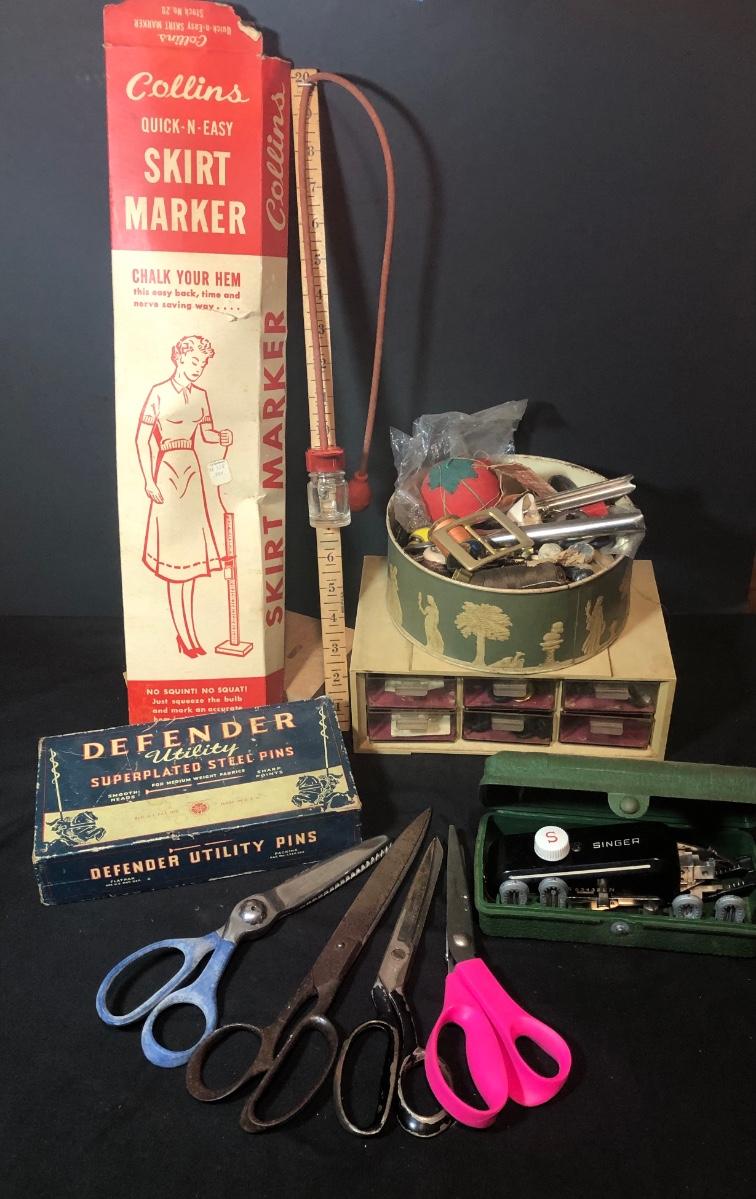 LOT 287B: Vintage Sewing Collection - Hand Held Singer W654321, Gromet Puncher, Scissors, Buttons & More