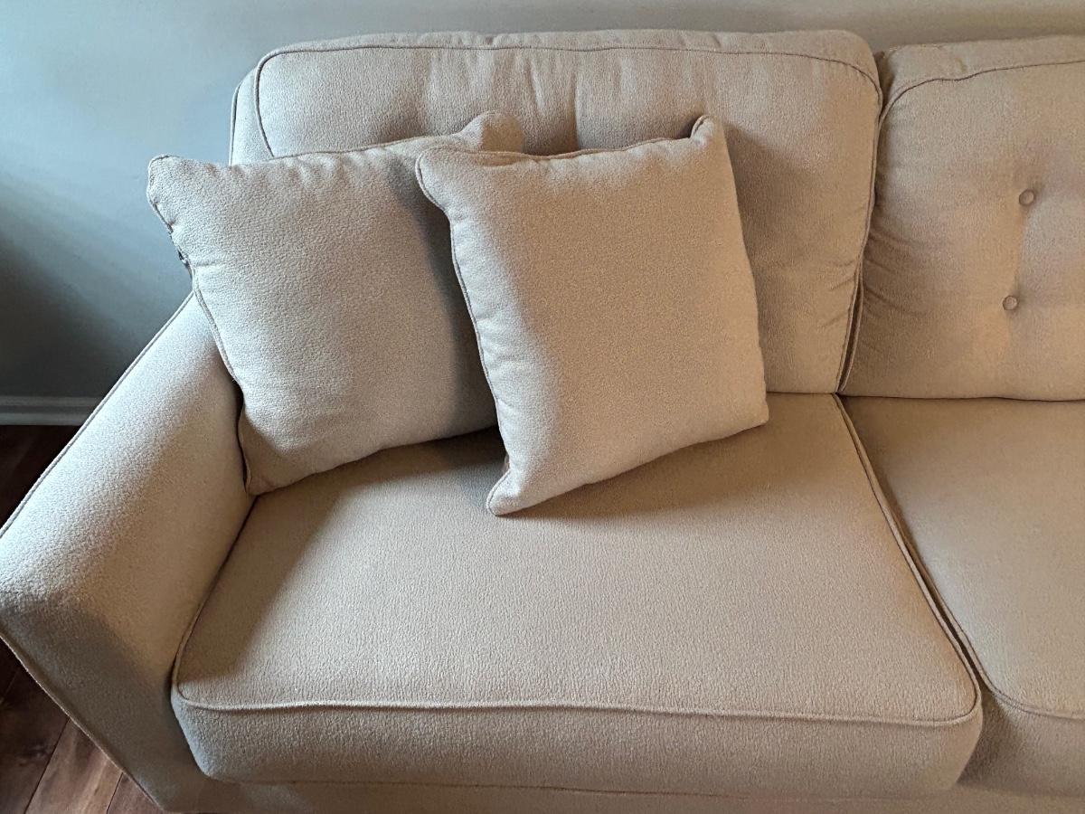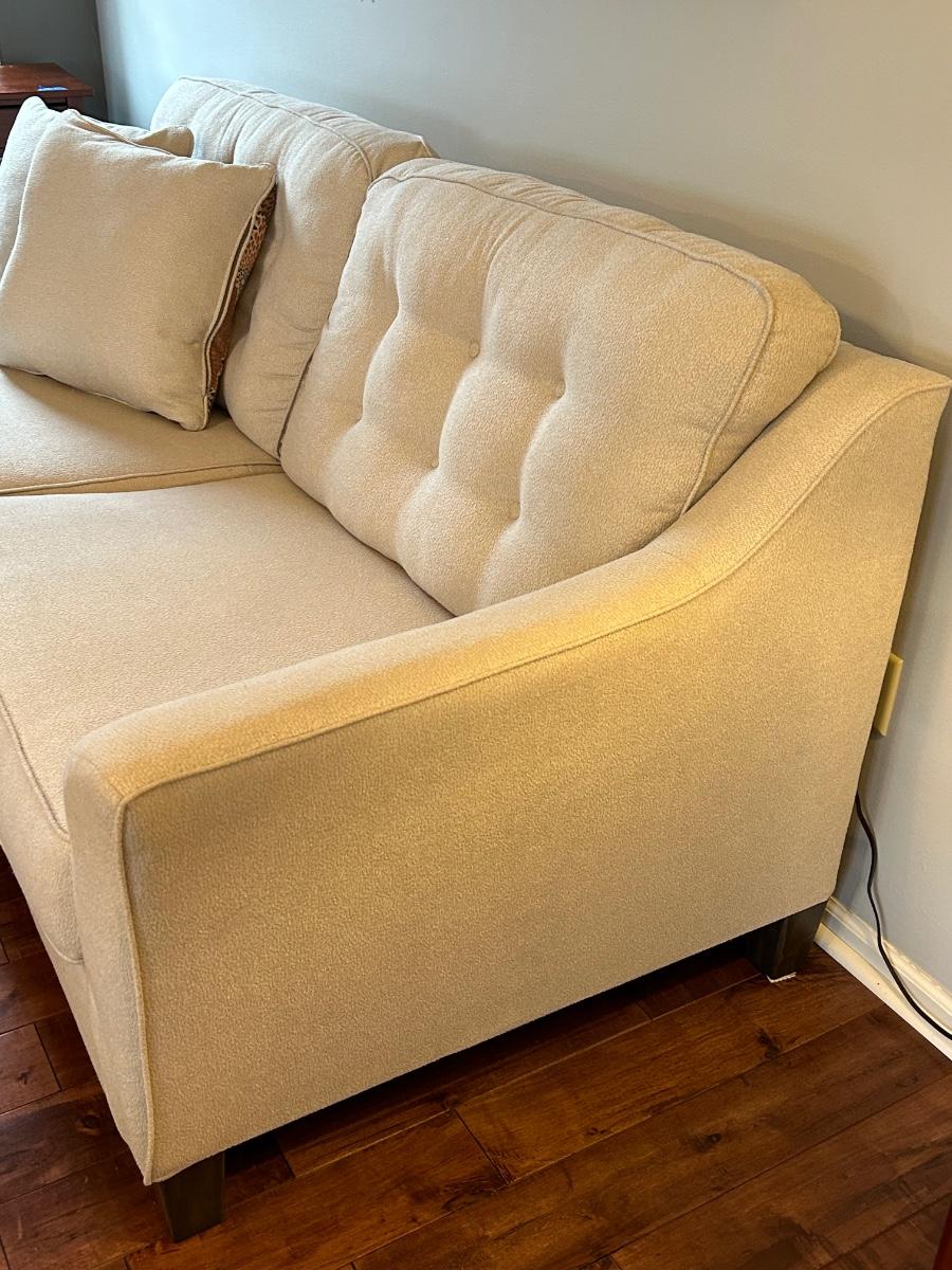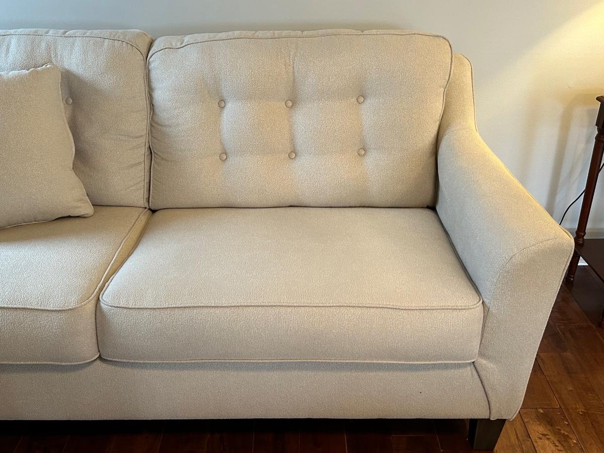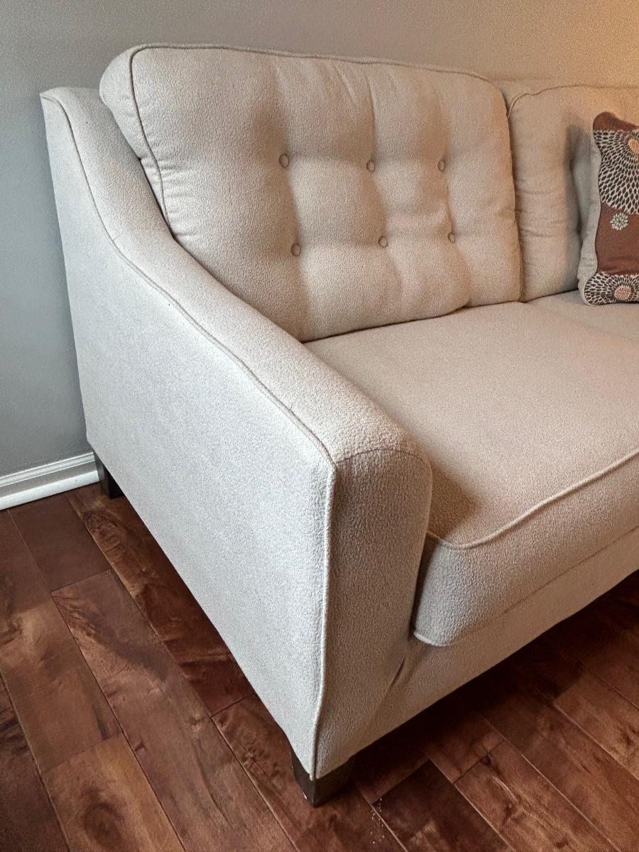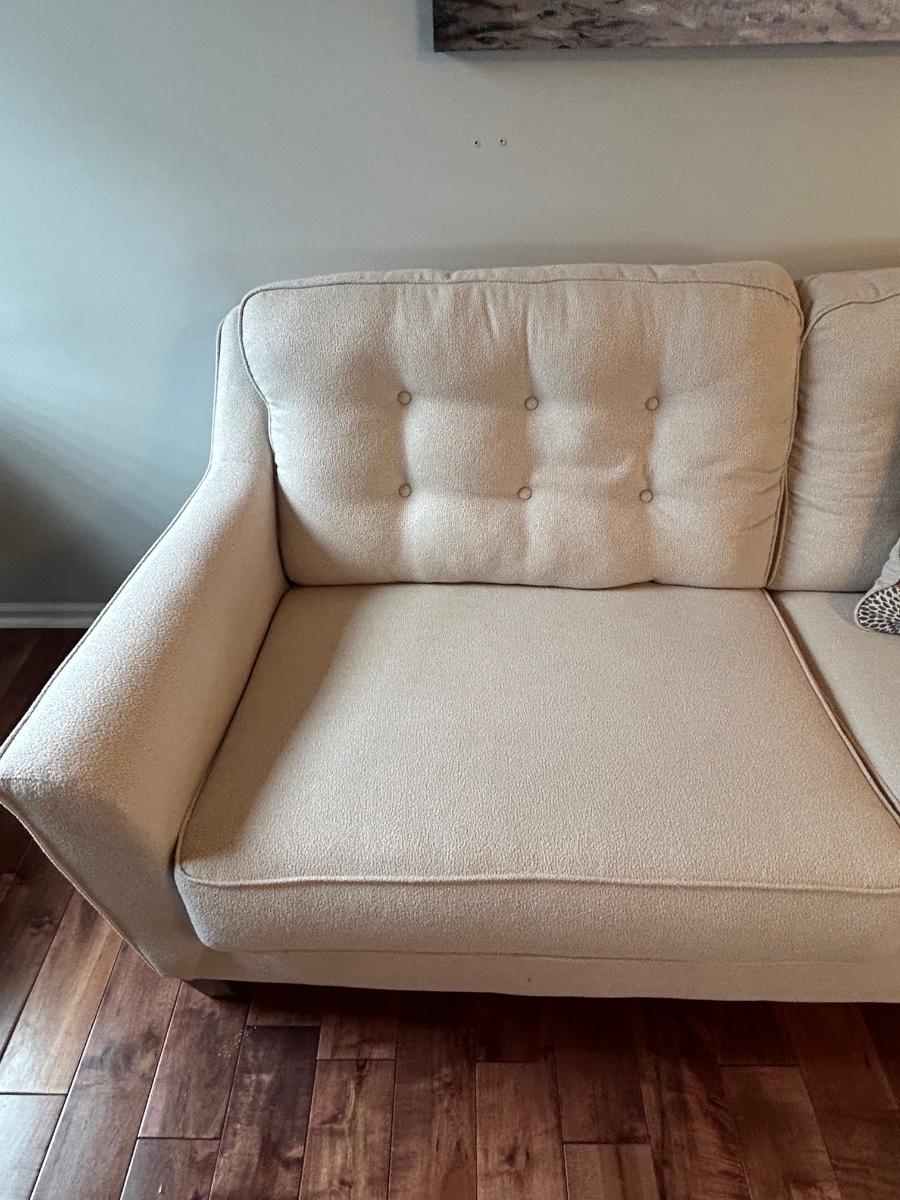 This is a beautiful cream colored, fuzzy textured sofa. Sofa is in excellent, used condition.