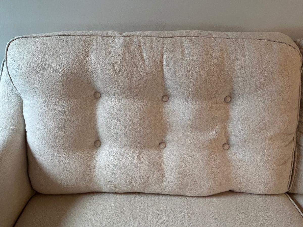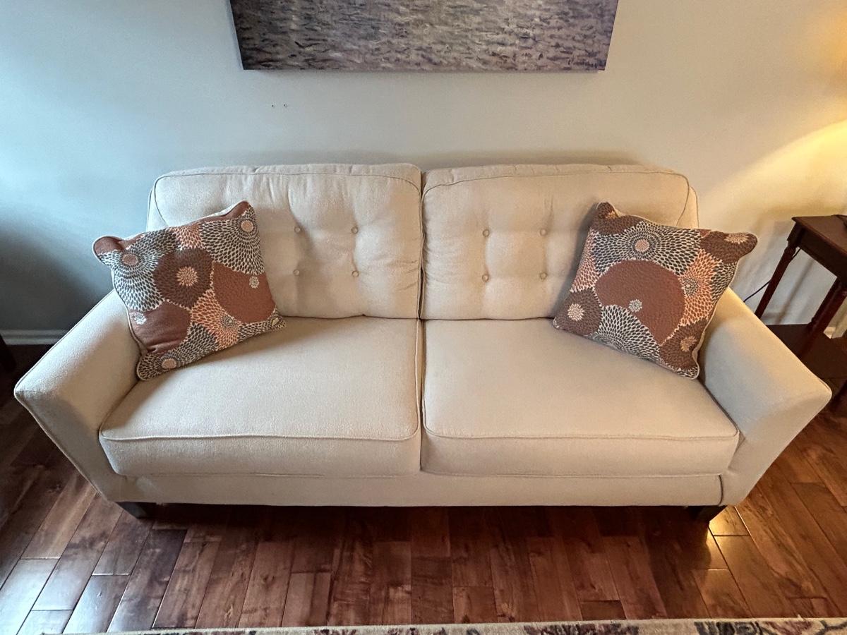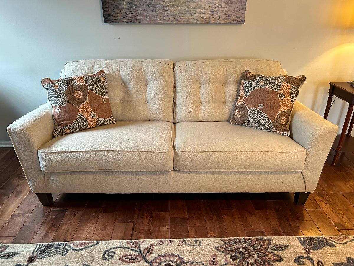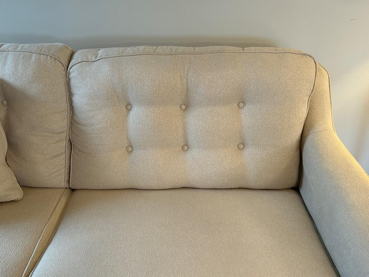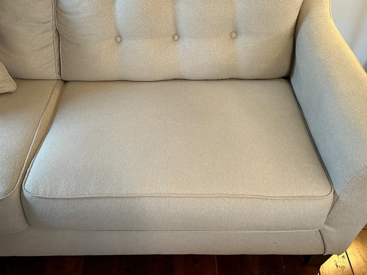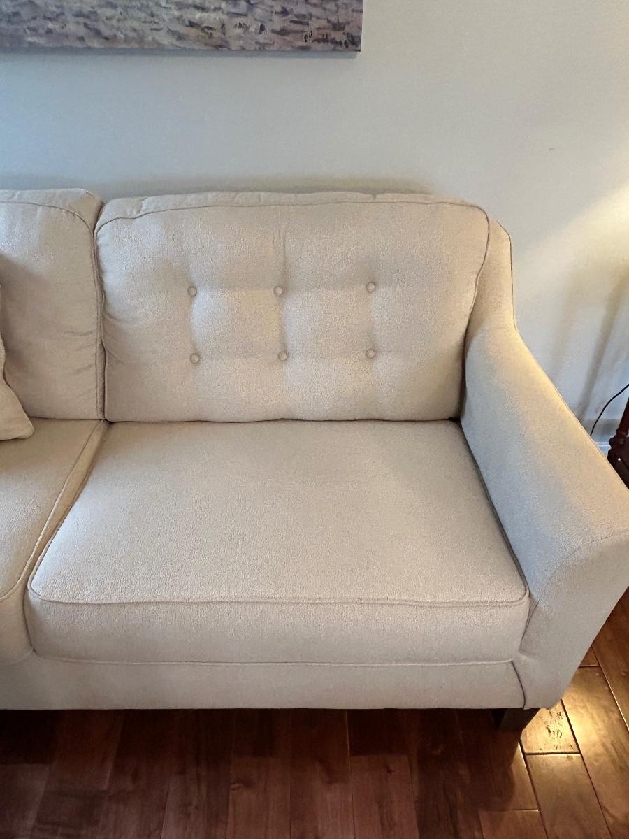This is a beautiful cream colored, fuzzy textured sofa. Sofa is in excellent, used condition.