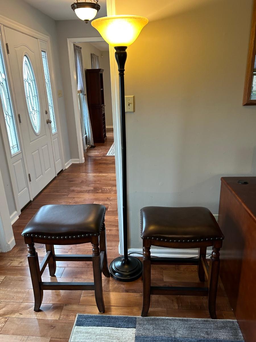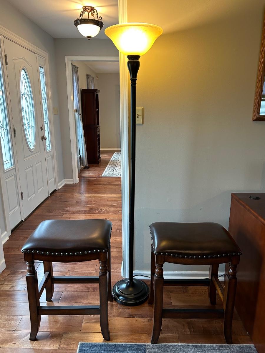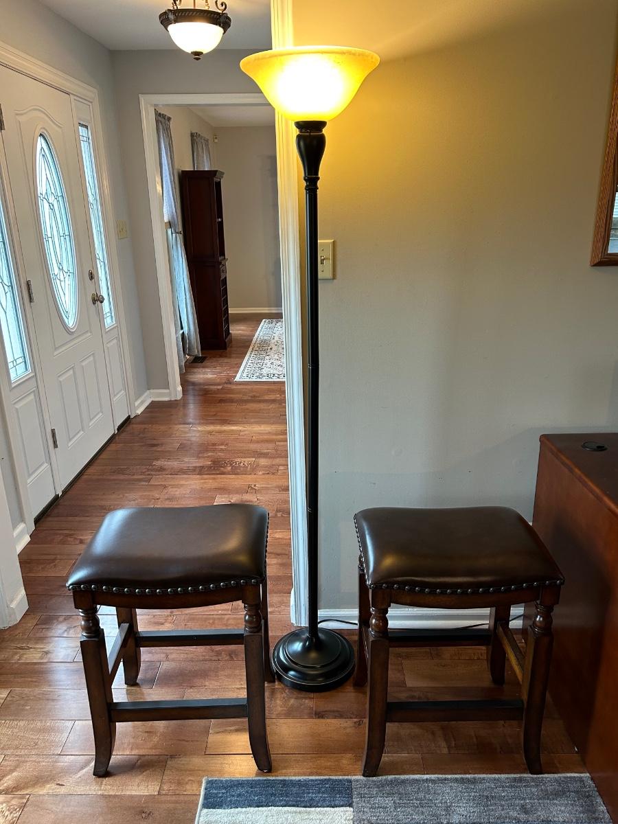 LOT 25: Two Leather Top Stools and Floor Lamp