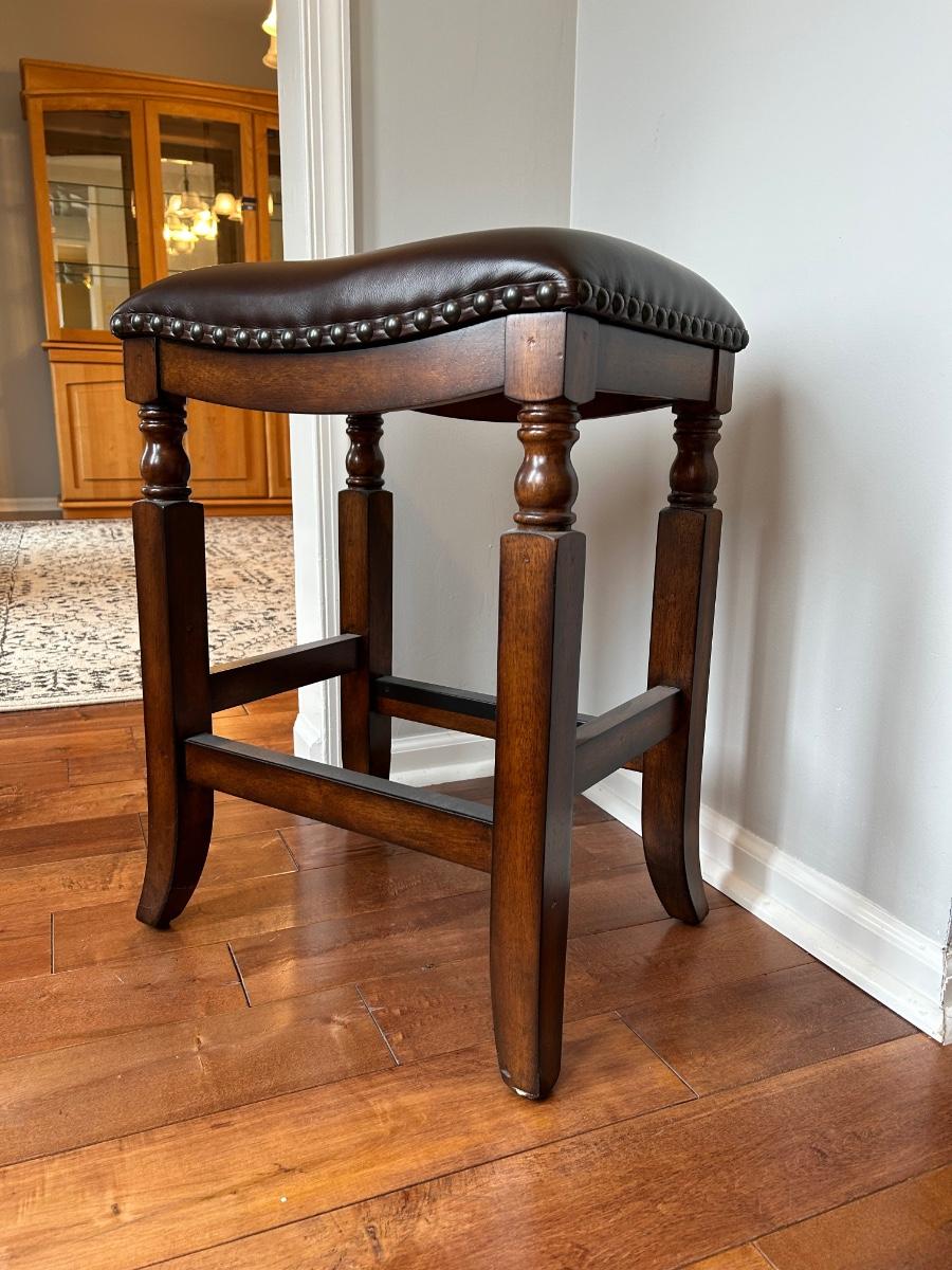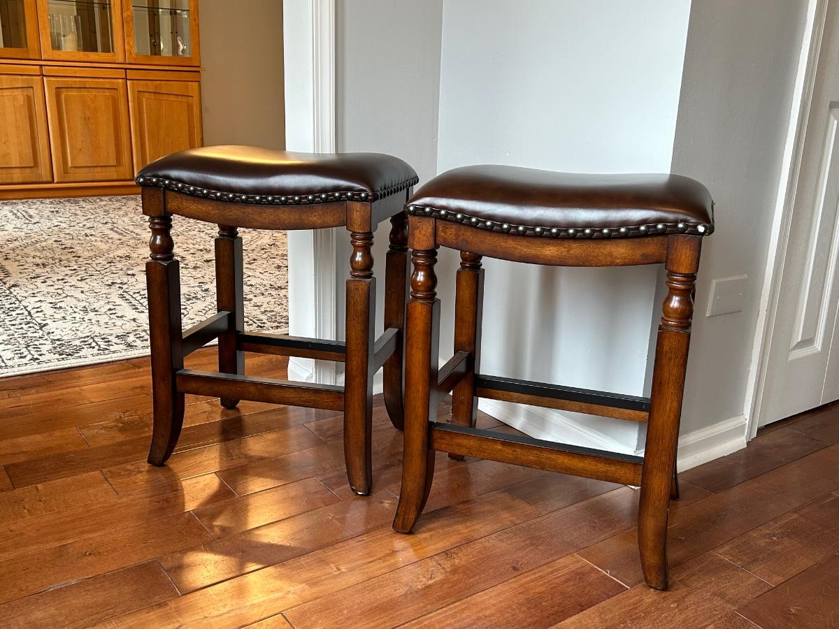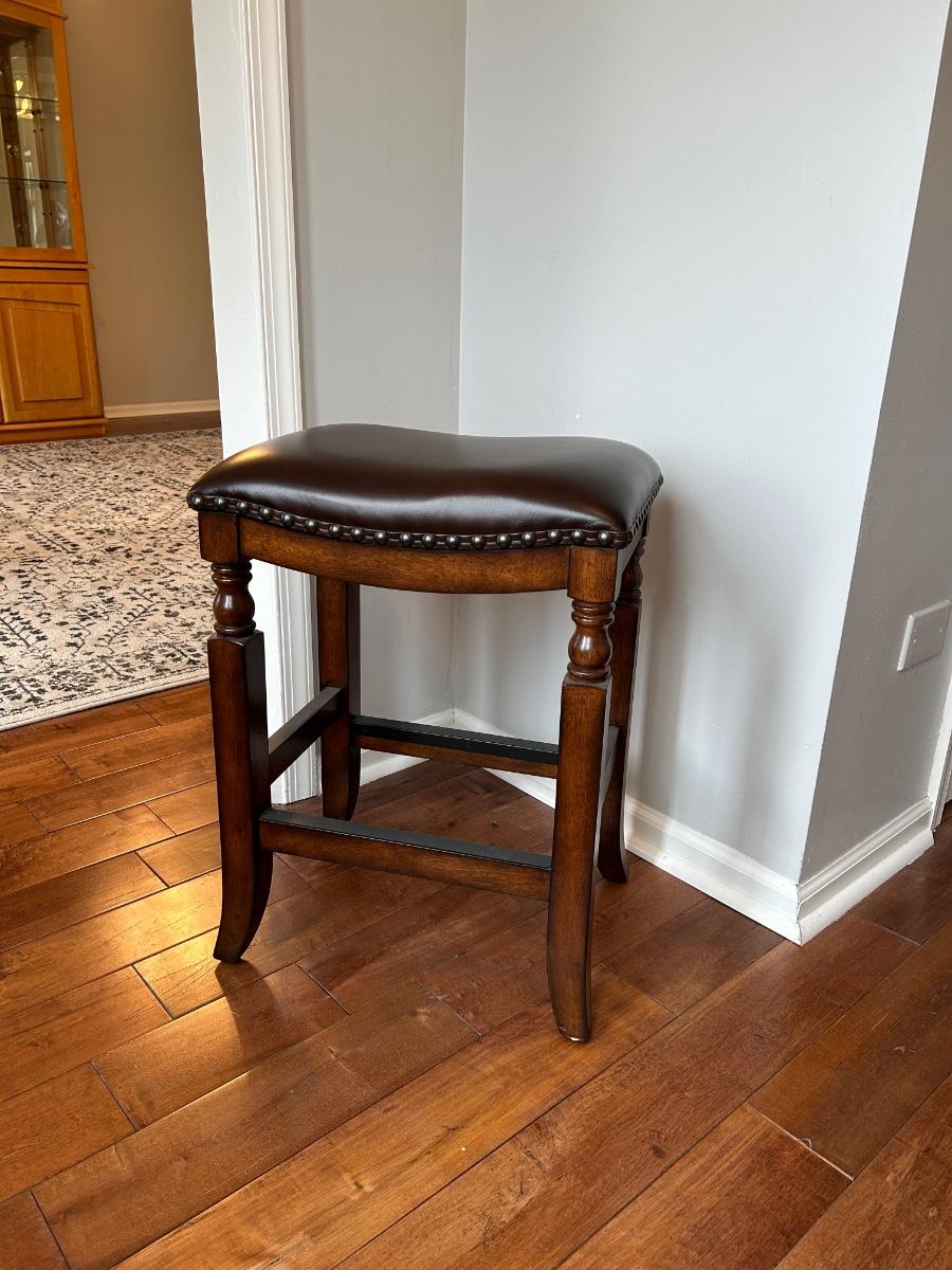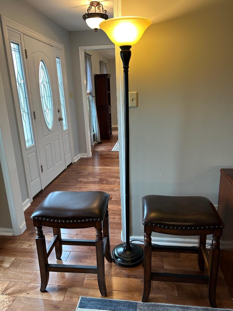 LOT 25: Two Leather Top Stools and Floor Lamp