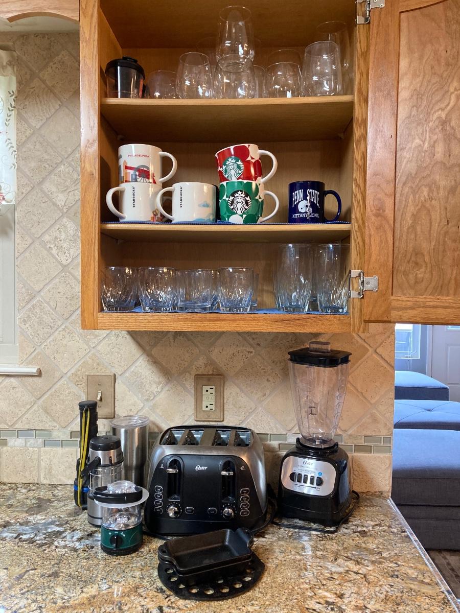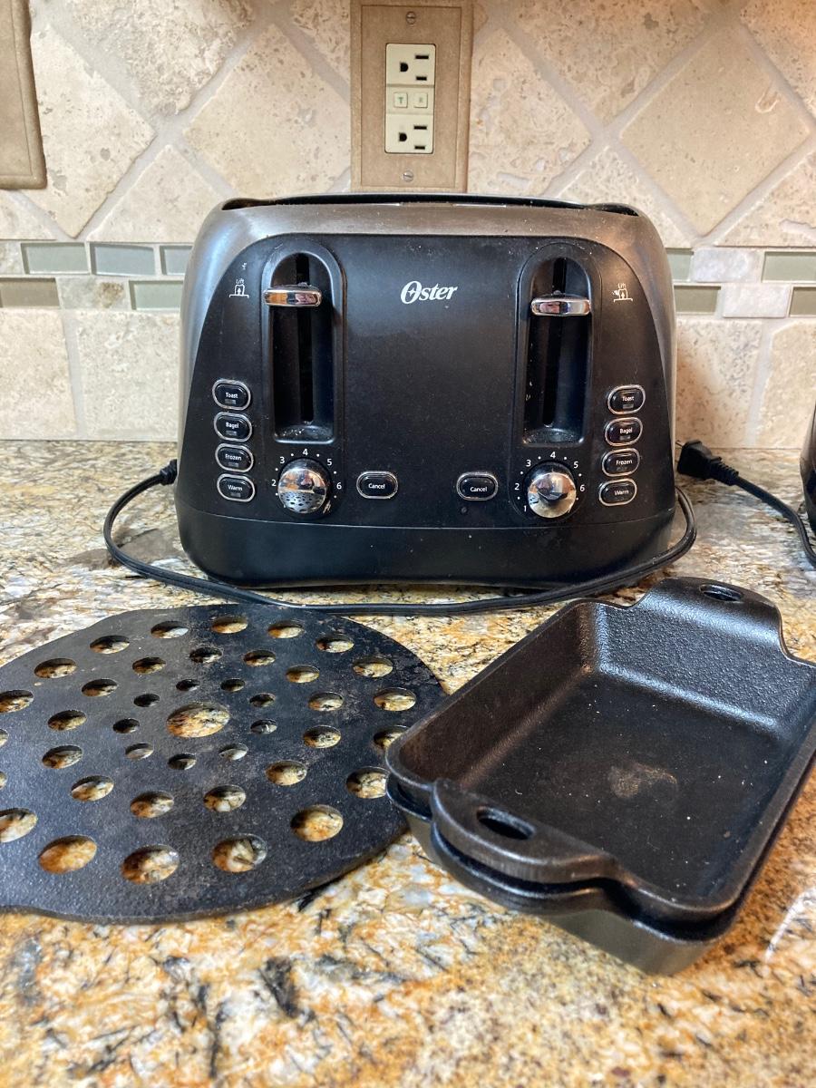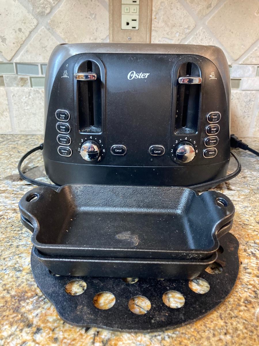 LOT 82: Kitchen Finds: Oster Blender and Toaster, Cast Iron Rectangle Bakeware , Starbucks Mugs and More