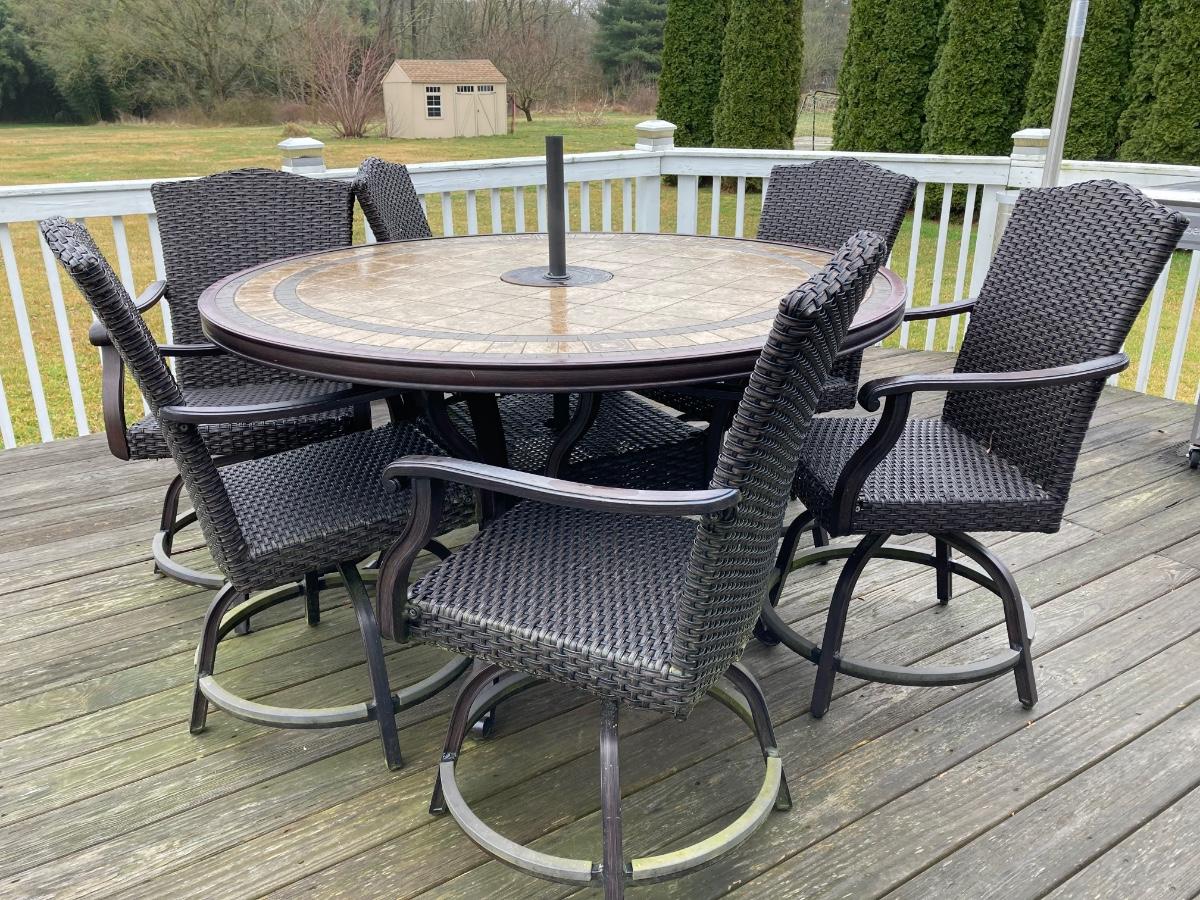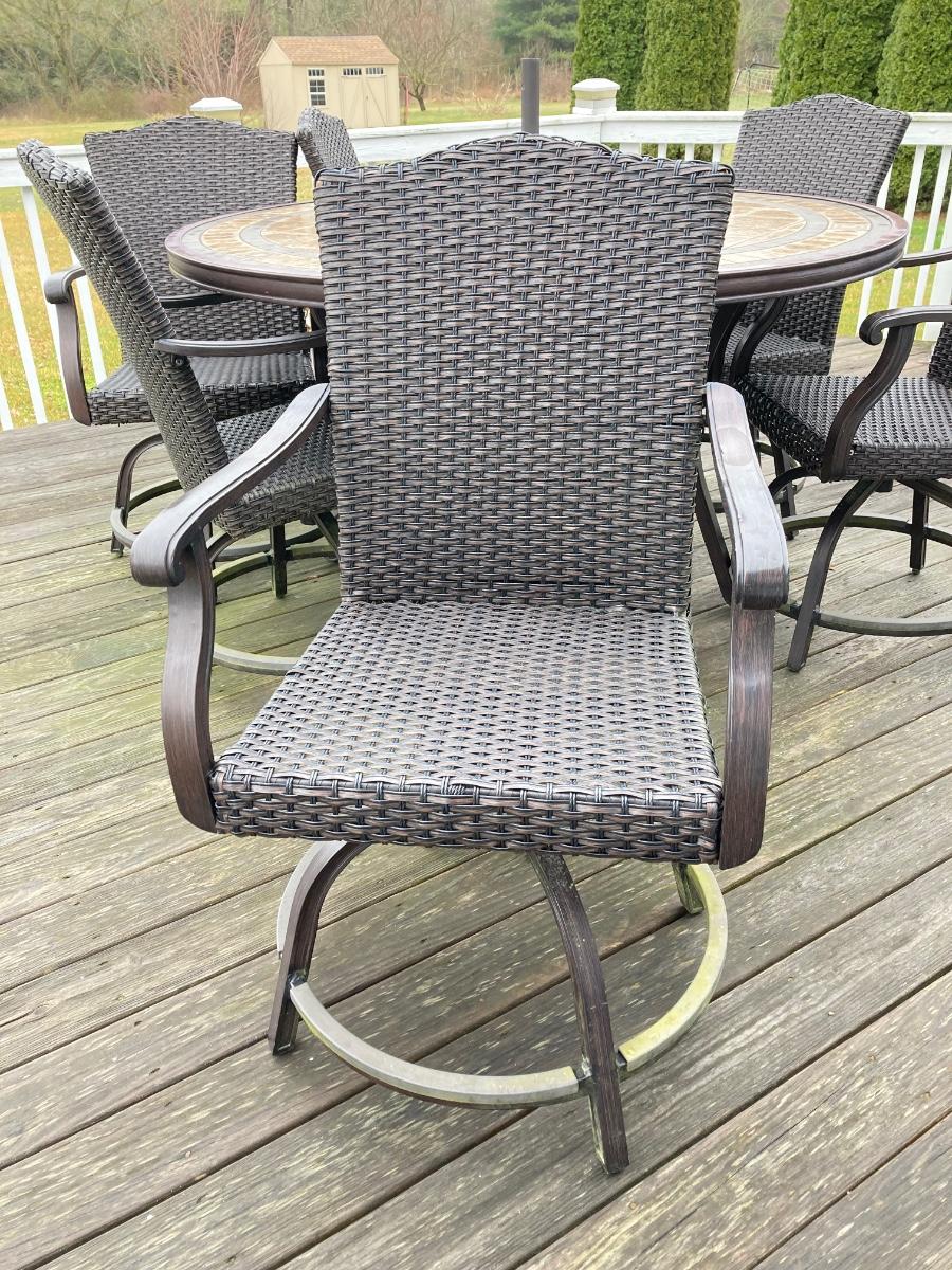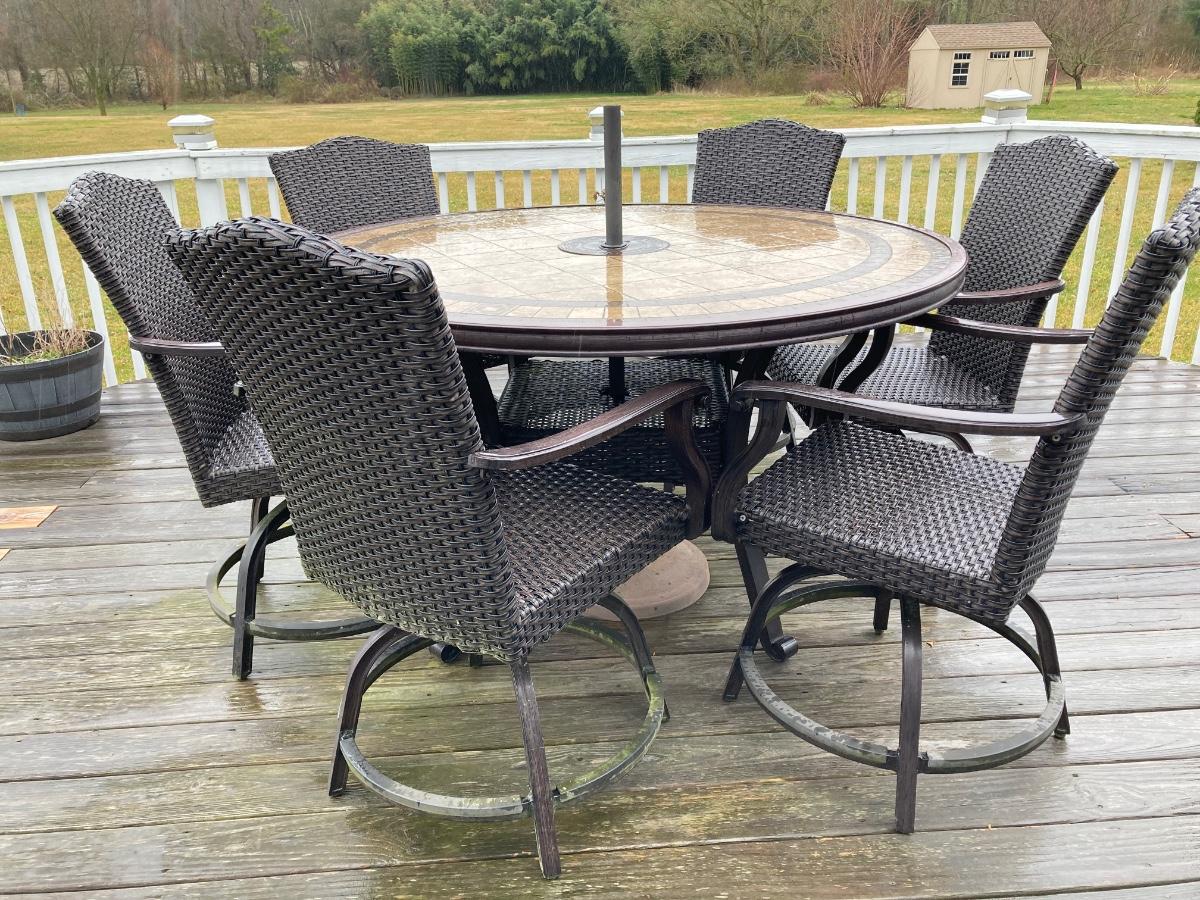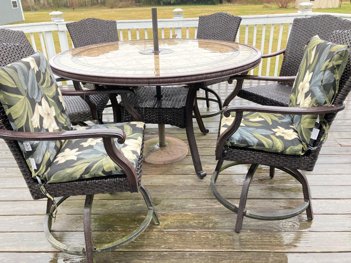 LOT 88: Round Table Patio Set with Six Swivel Chairs, Cushions and Allen + Roth Umbrella