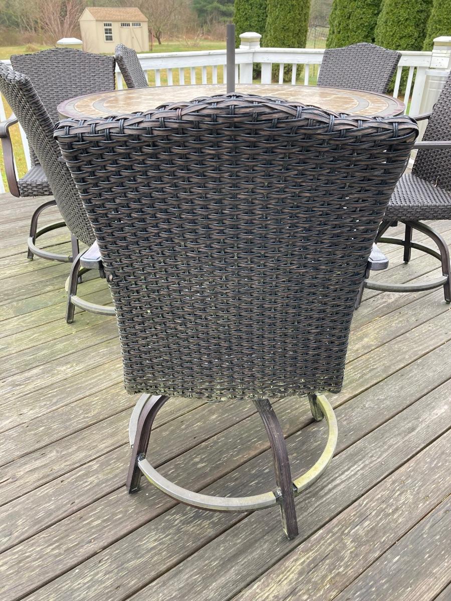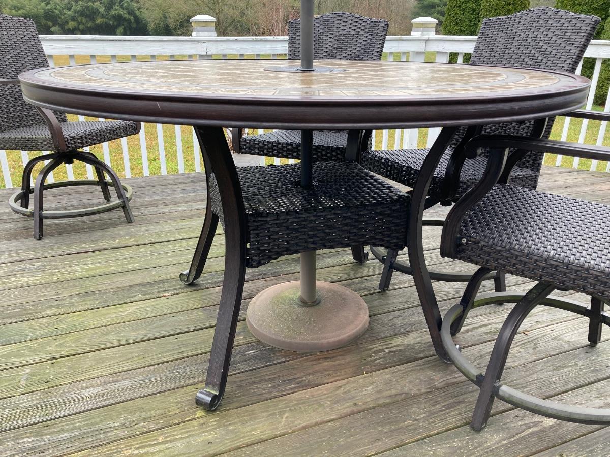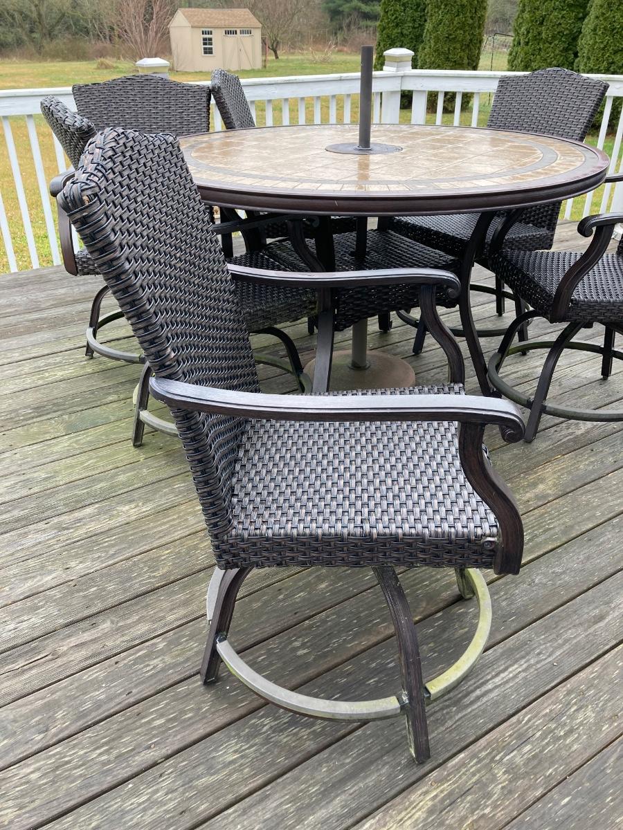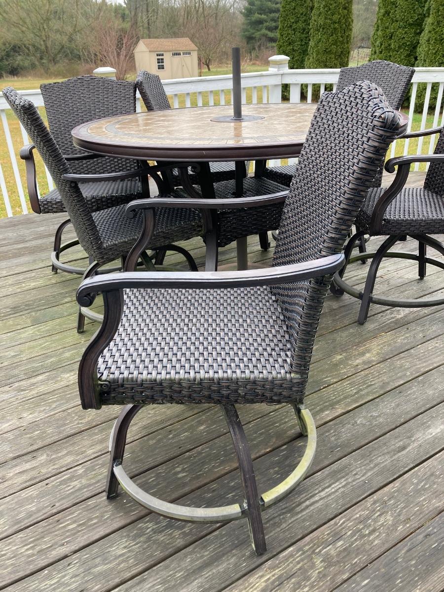 LOT 88: Round Table Patio Set with Six Swivel Chairs, Cushions and Allen + Roth Umbrella