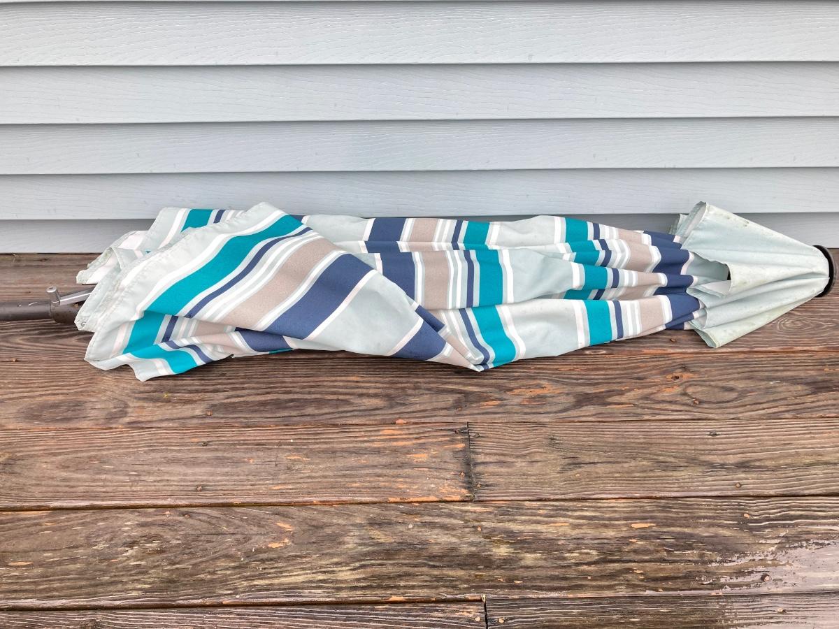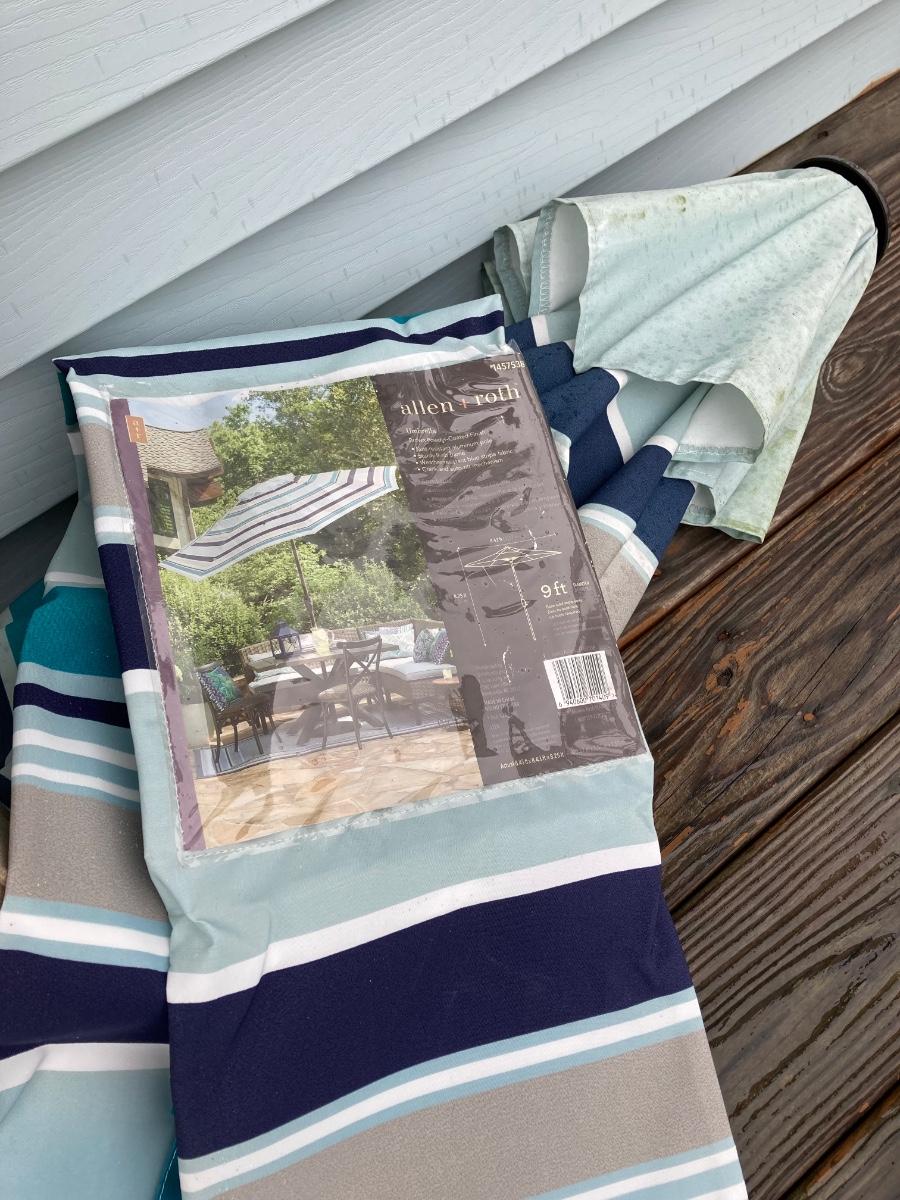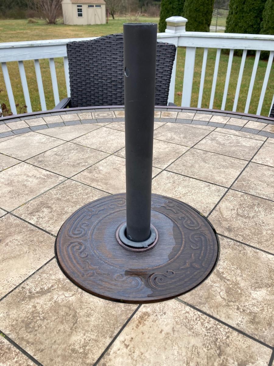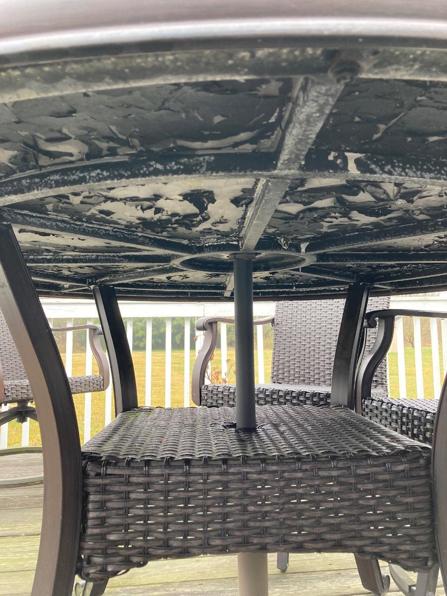 LOT 88: Round Table Patio Set with Six Swivel Chairs, Cushions and Allen + Roth Umbrella