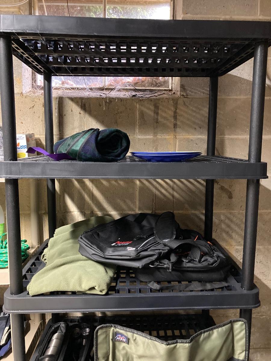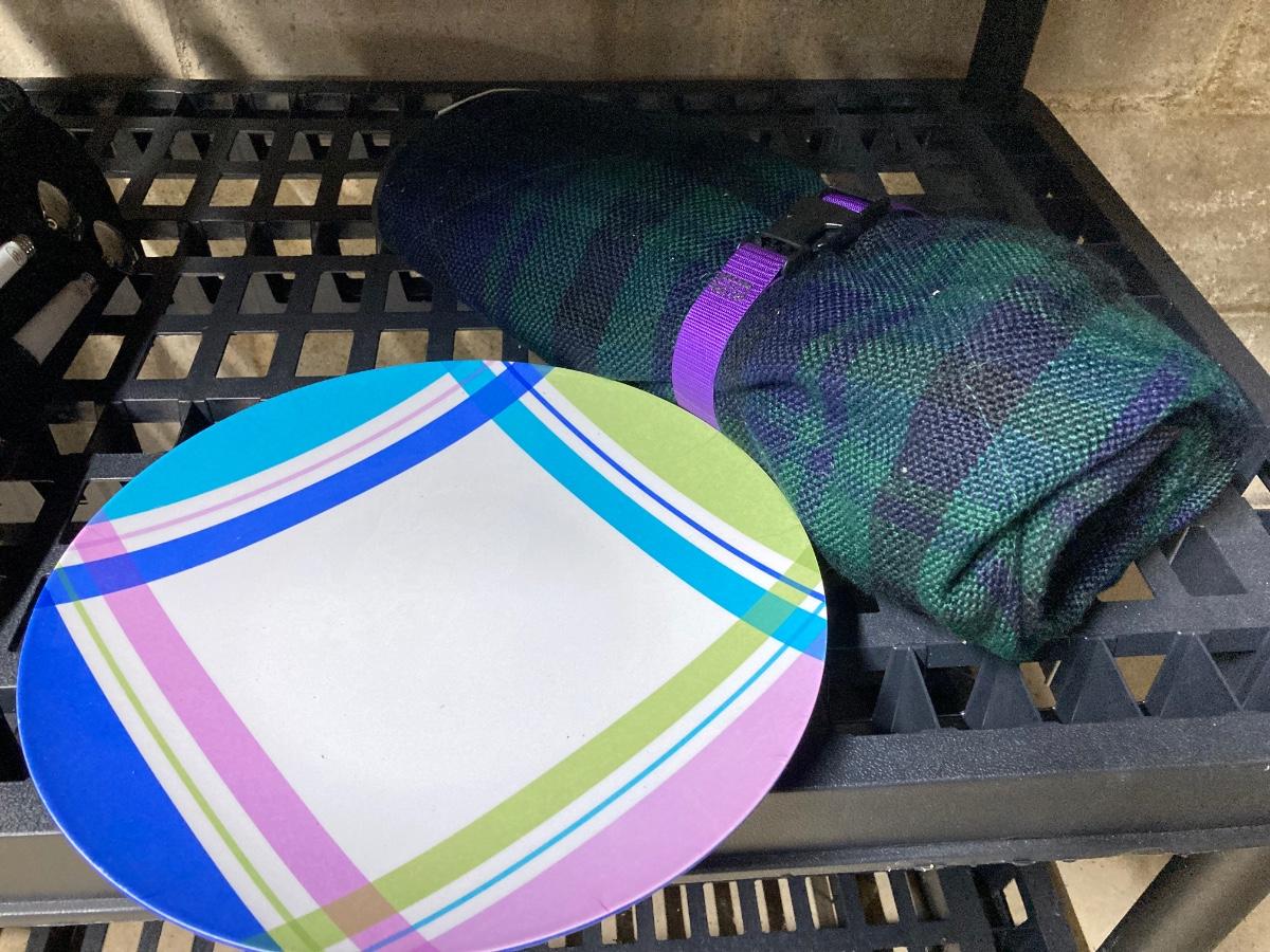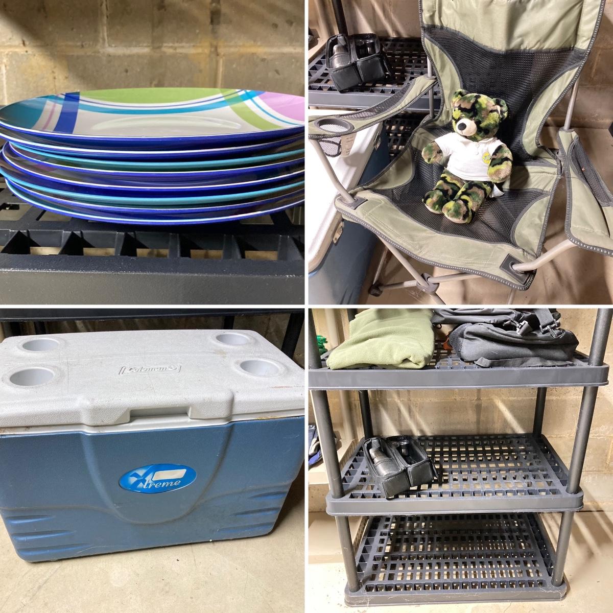 LOT 95: Storage Shelf and Contents - Camping / Picnic Essentials