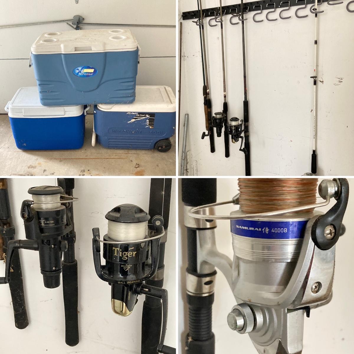 LOT 103: Fishing Rods / Reels and Storage Coolers - Tiger, Samurai, Coleman, Igloo and More