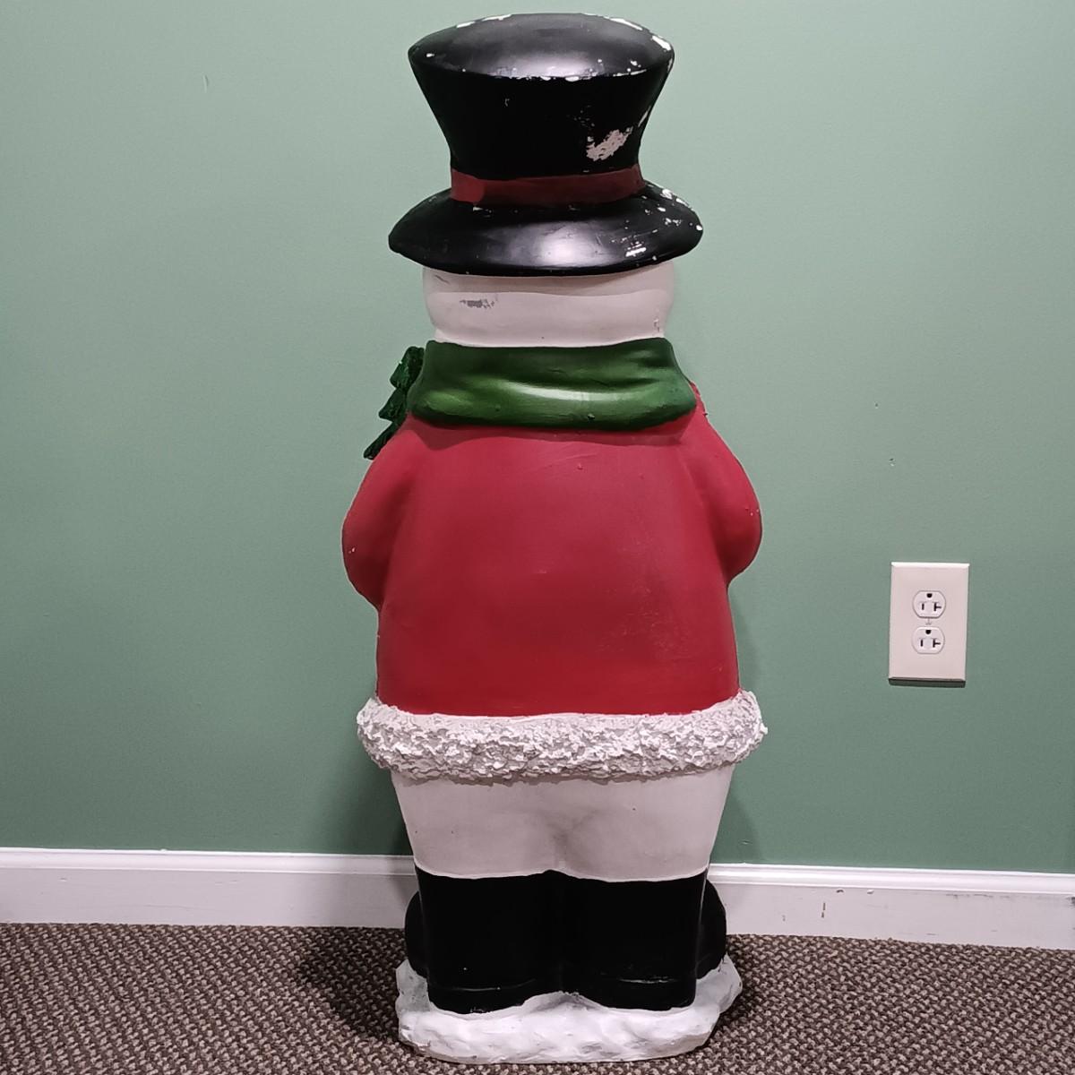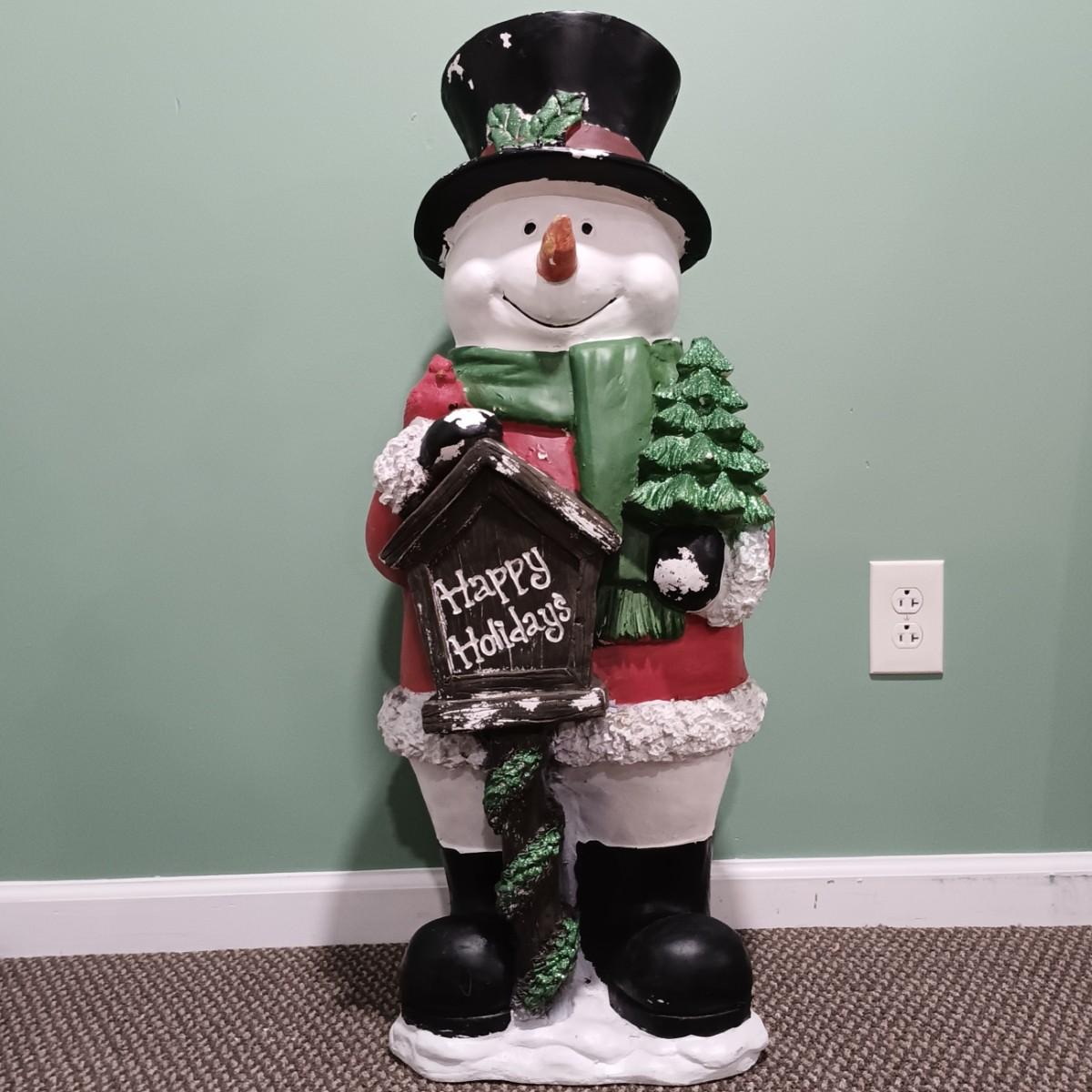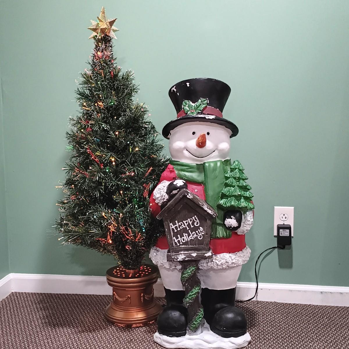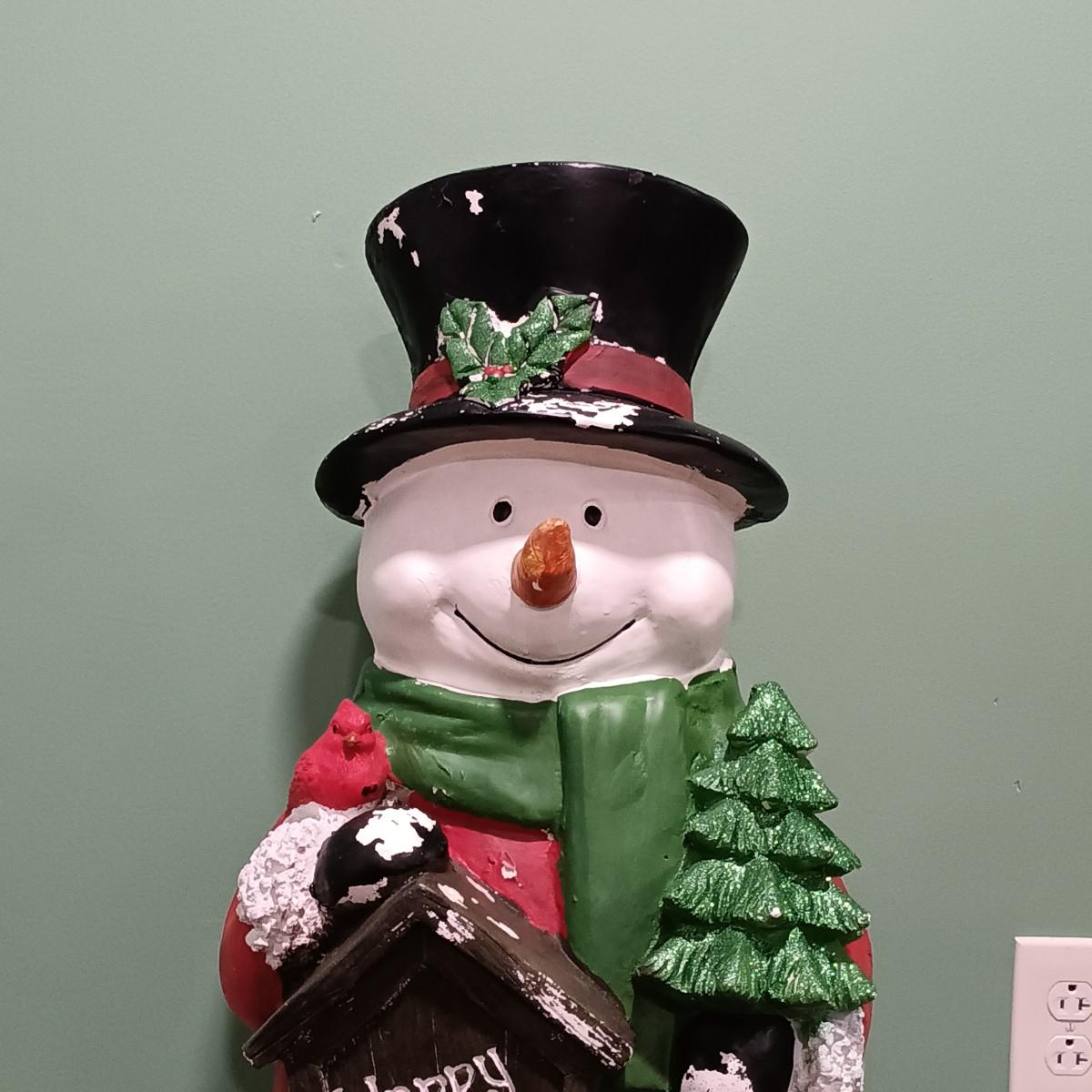 Tree topper is cracked and missing a piece. Snowman has chipped paint and some weathering.