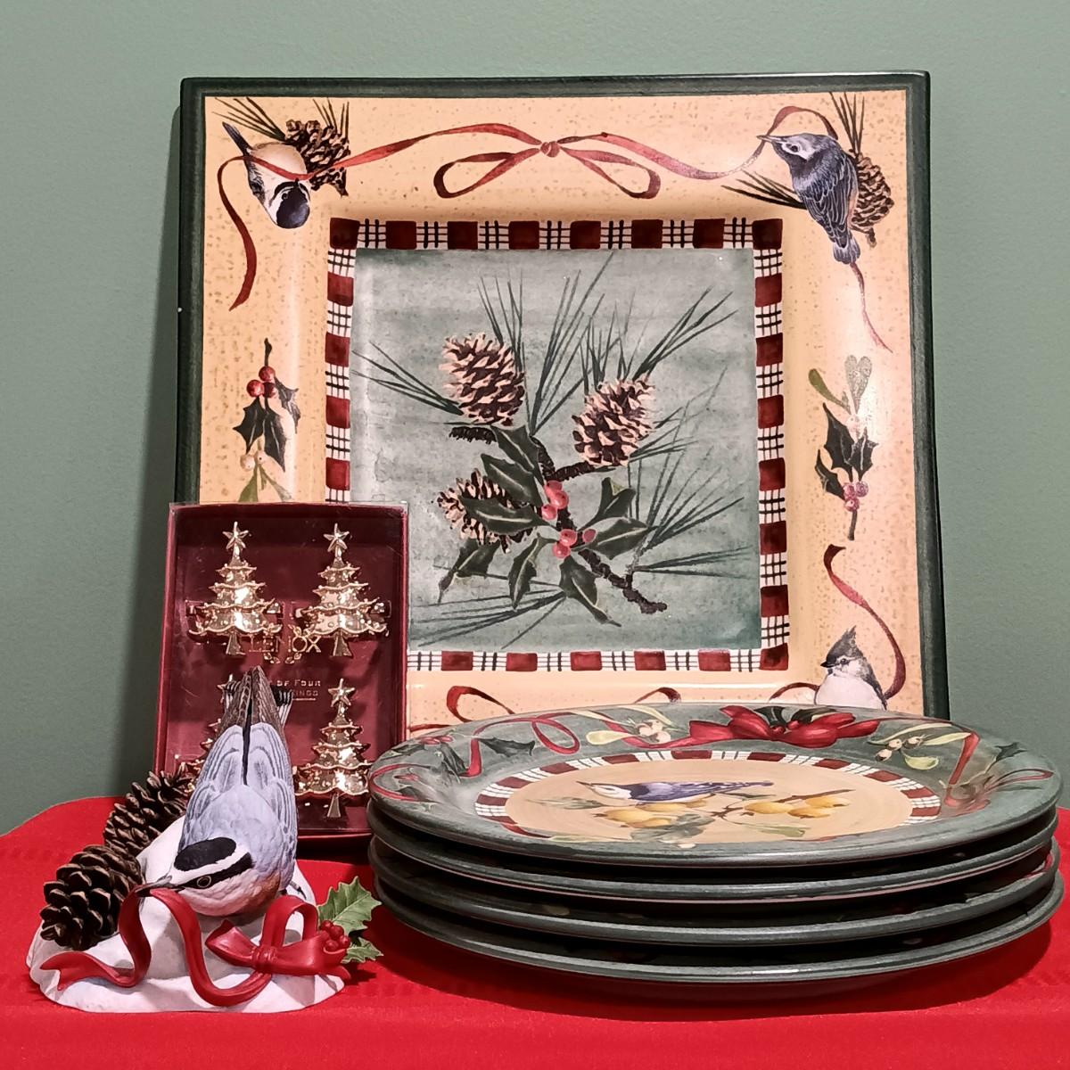 LOT 23: Lenox Collection- Winter Greeting Dishware w/ Napkin Rings & Porcelain Nuthatch