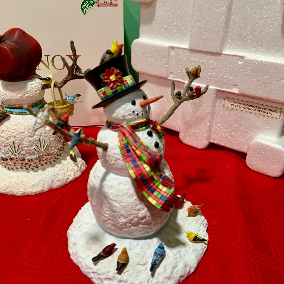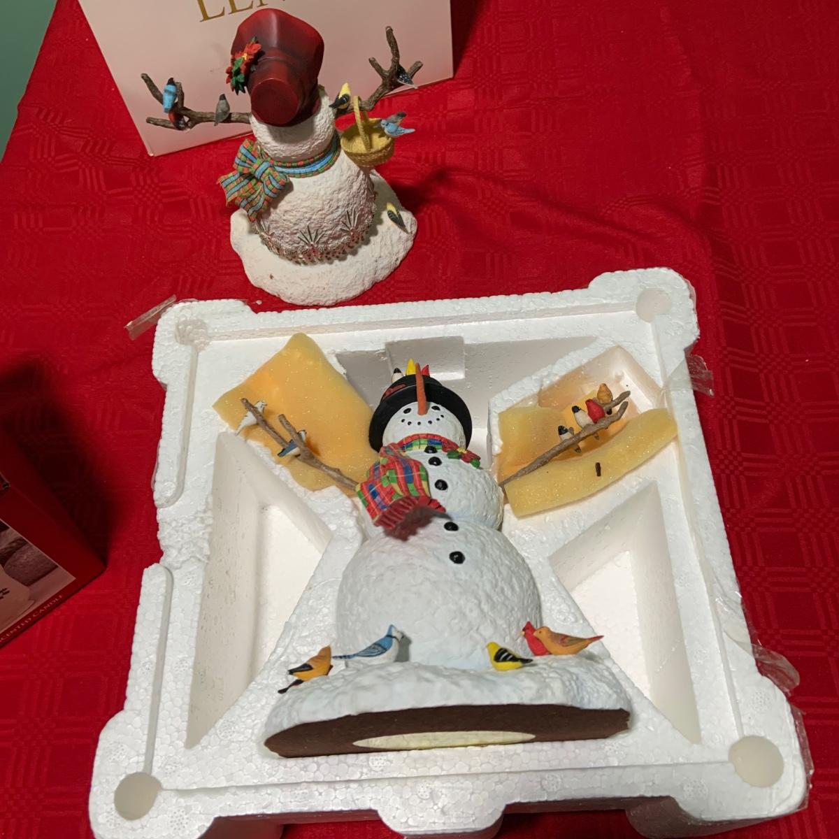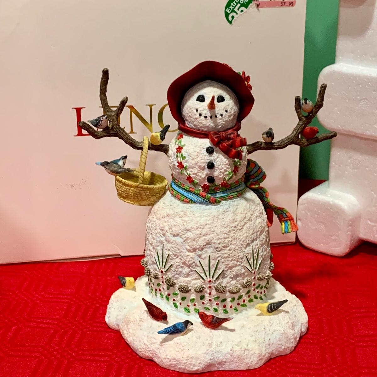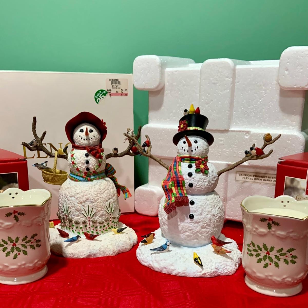 LOT:35: Lenox Snow People - A Winter's Visit Snowlady & Feathered Friends Snowman by Len Bywater and 2 Holy Berry Patterned Candle Holder with Candles