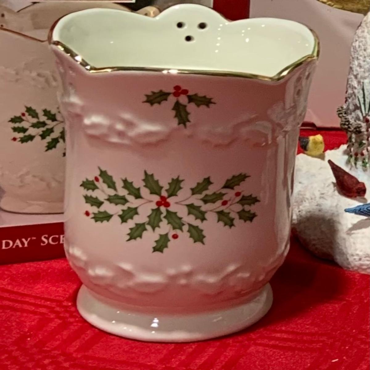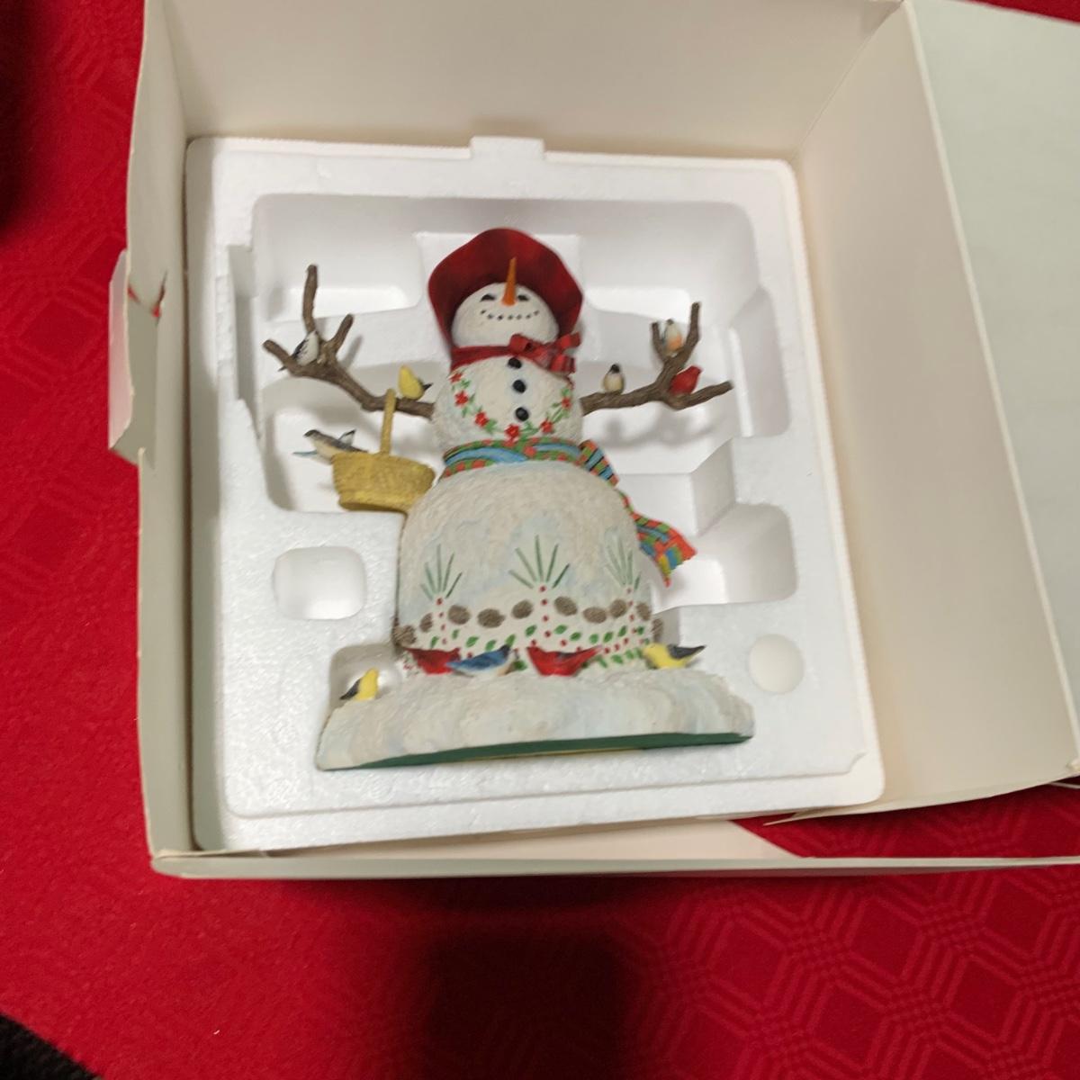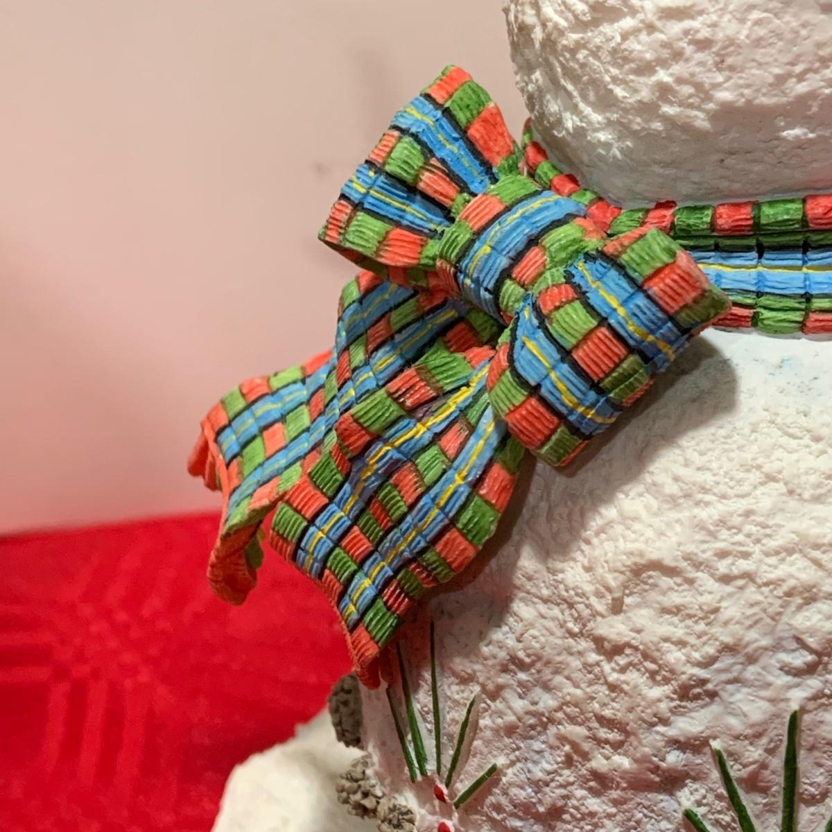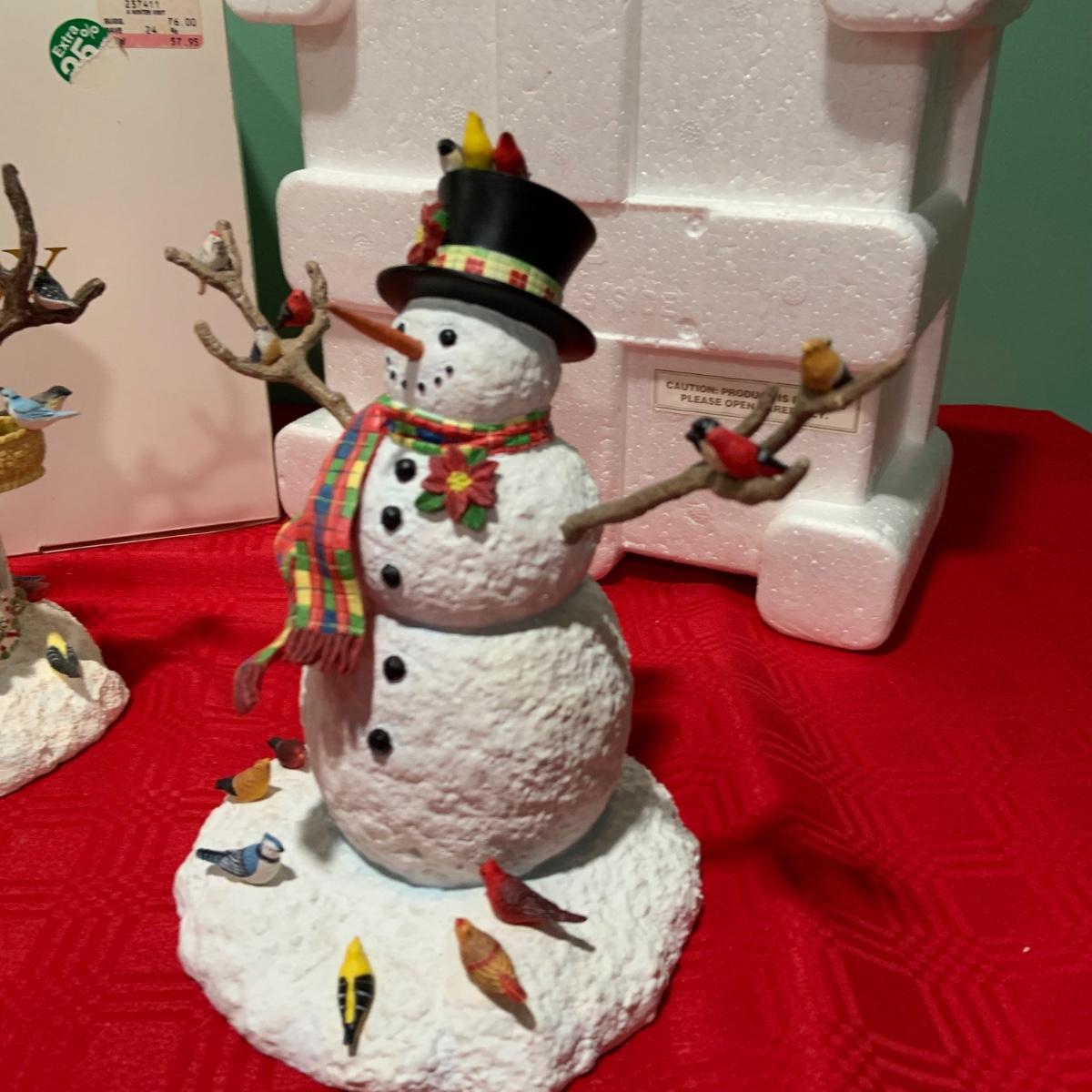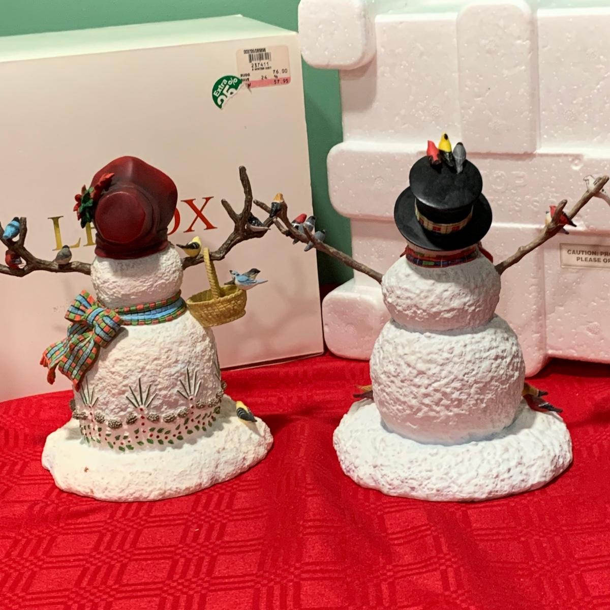 LOT:35: Lenox Snow People - A Winter's Visit Snowlady & Feathered Friends Snowman by Len Bywater and 2 Holy Berry Patterned Candle Holder with Candles