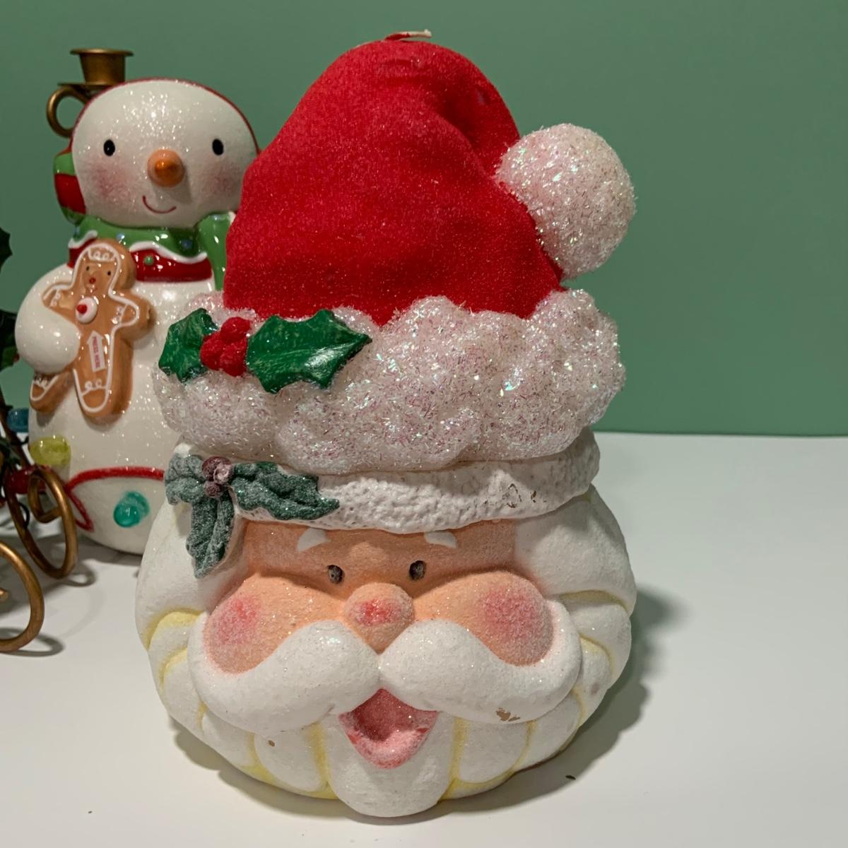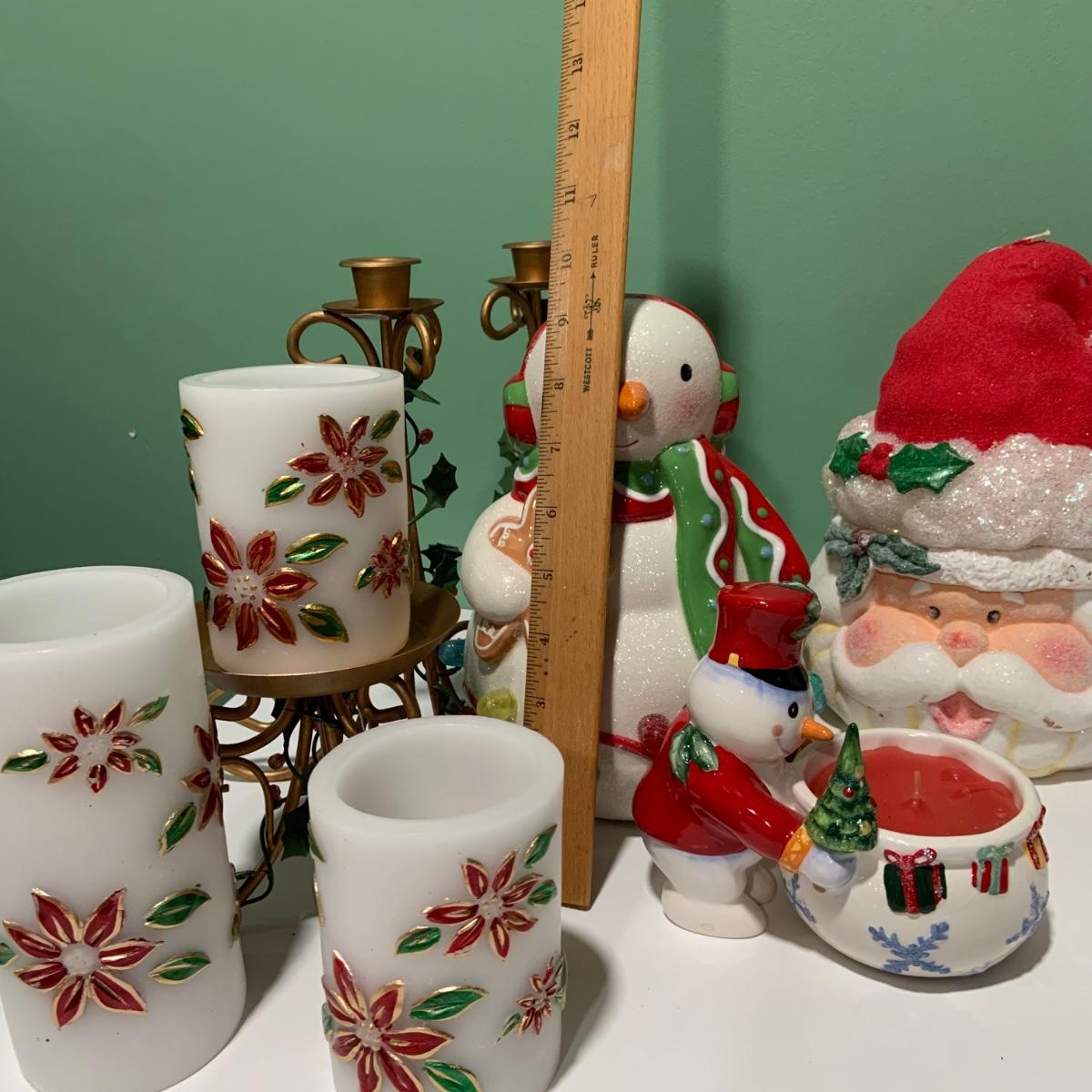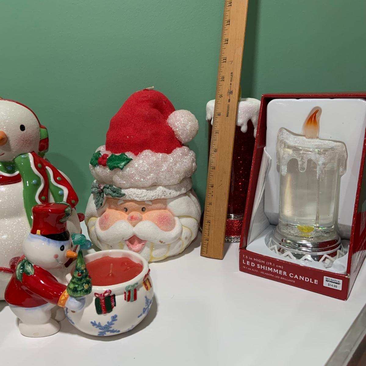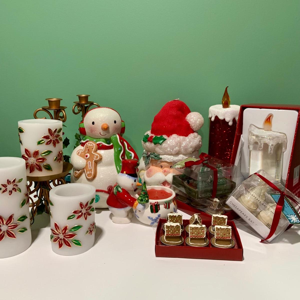 LOT:38: Light Up the Holidays Collection of Flameless Candles, White Barn Snowman Candle, Large Santa Head Wax Candle, Hallmark Light-Up Snowman Mini Gingerbread House Candles and More