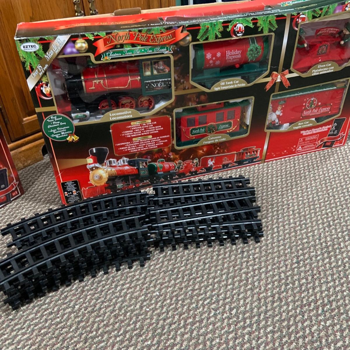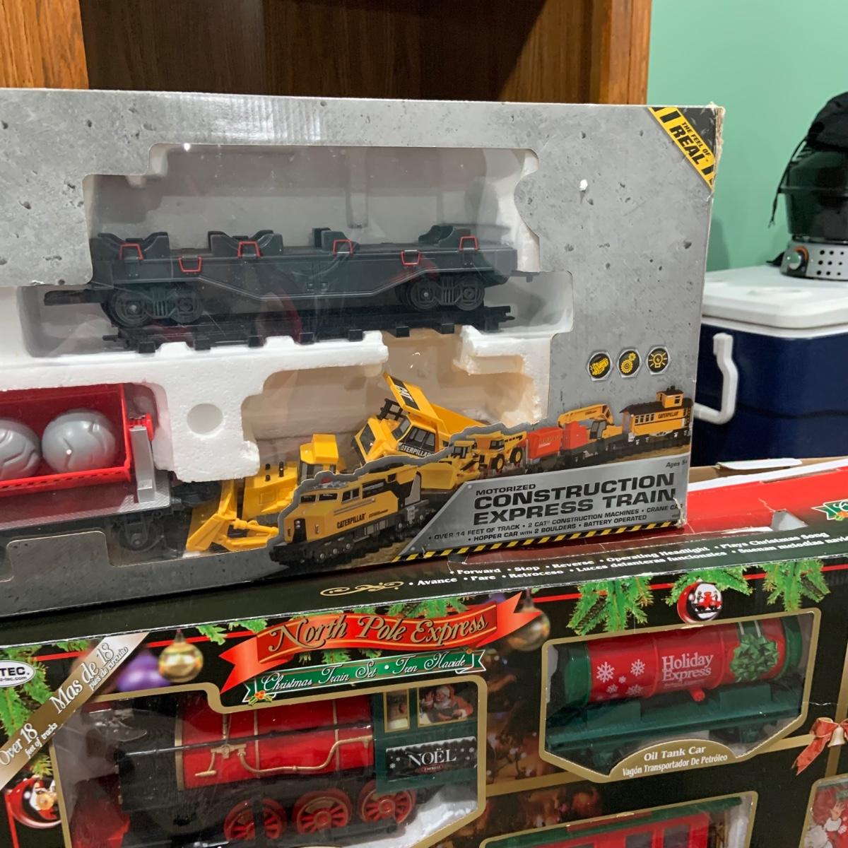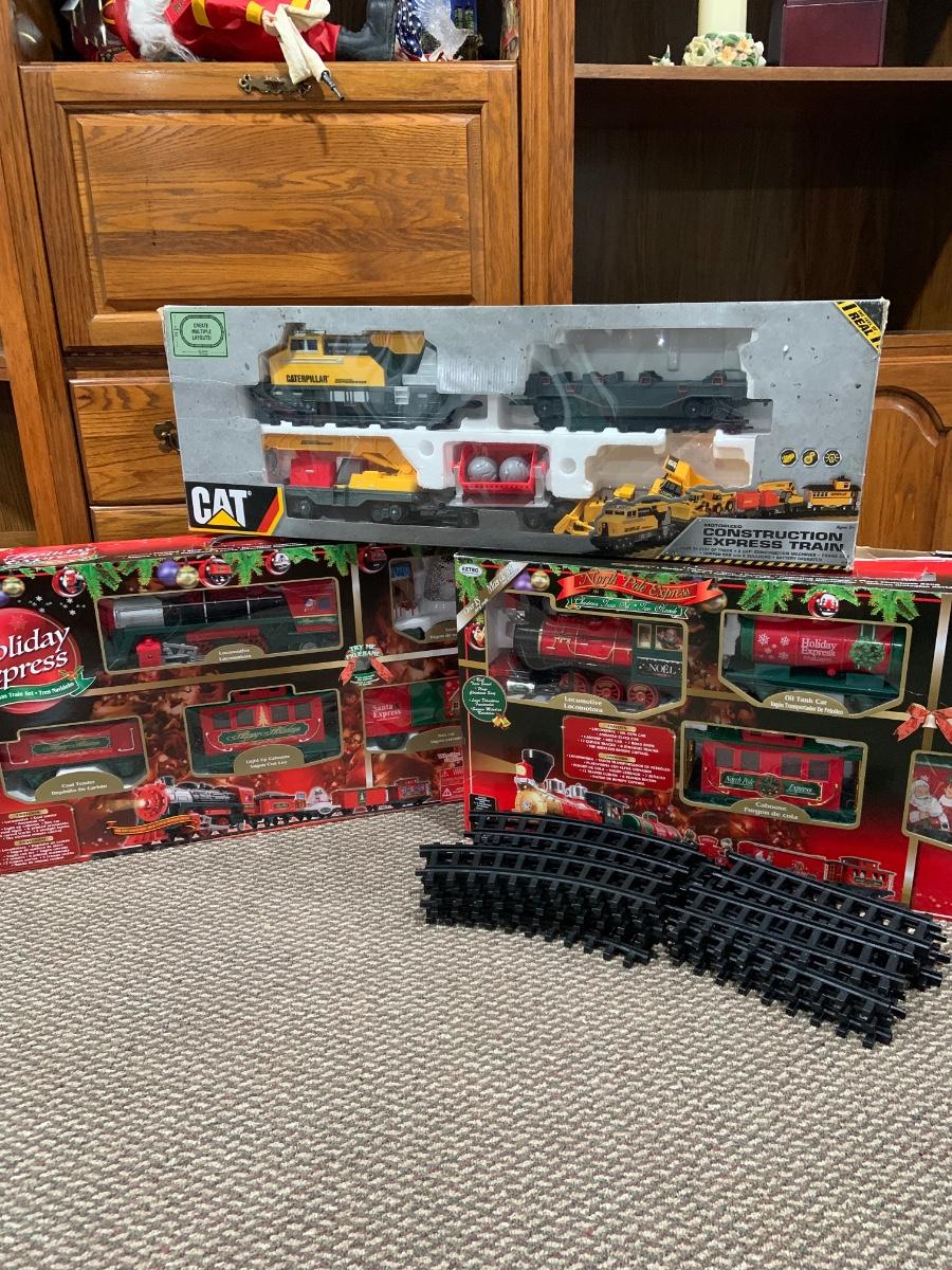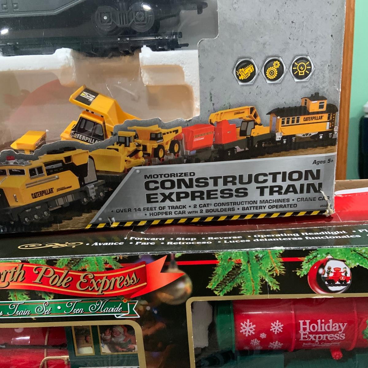 The CAT train set is missing a car but the Holiday Exoress set was never removed from the box.