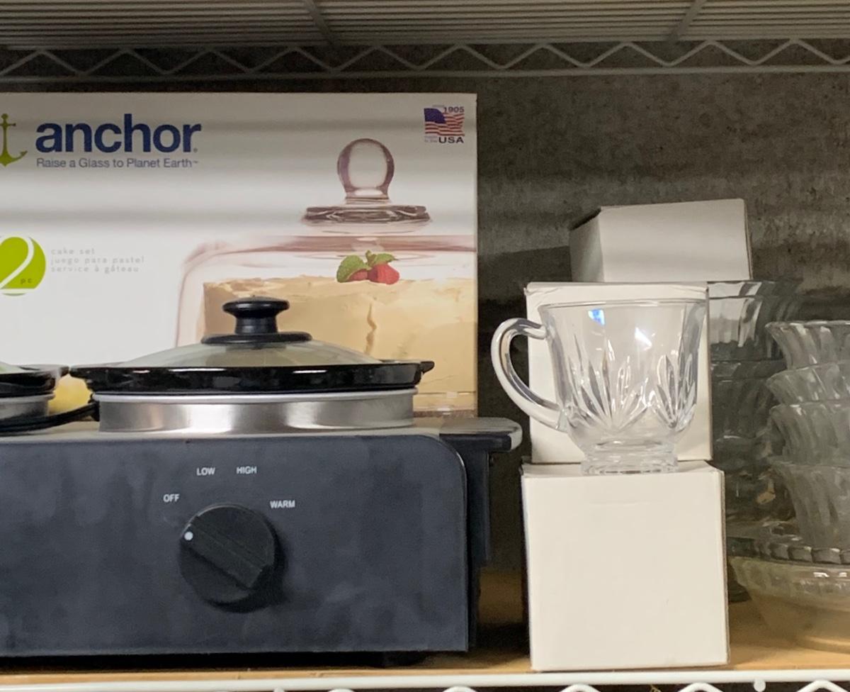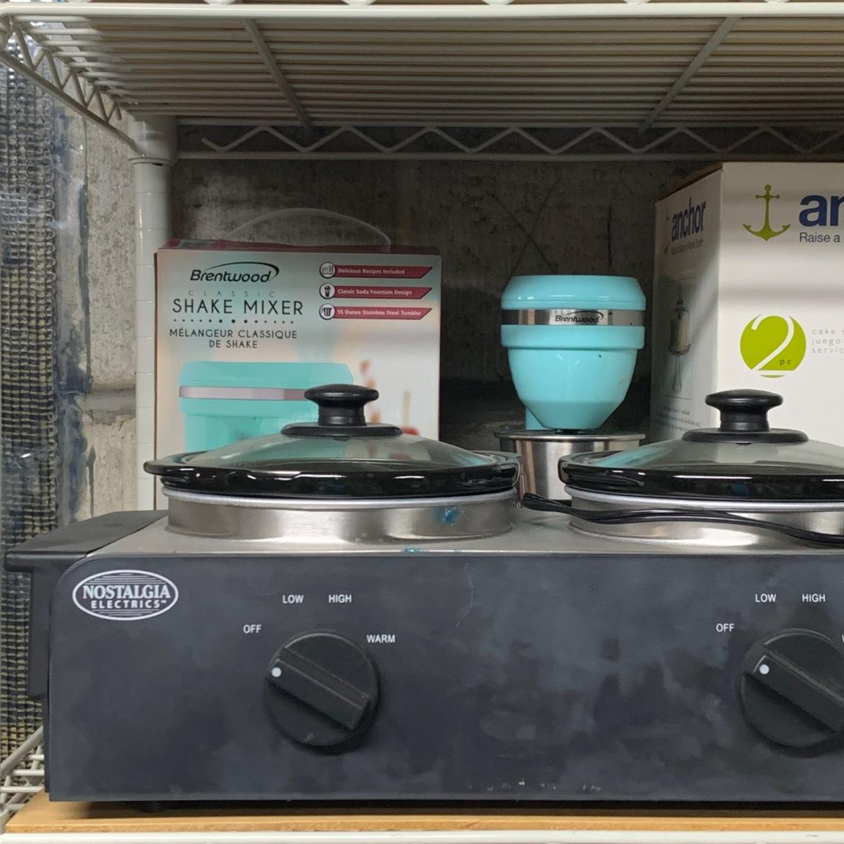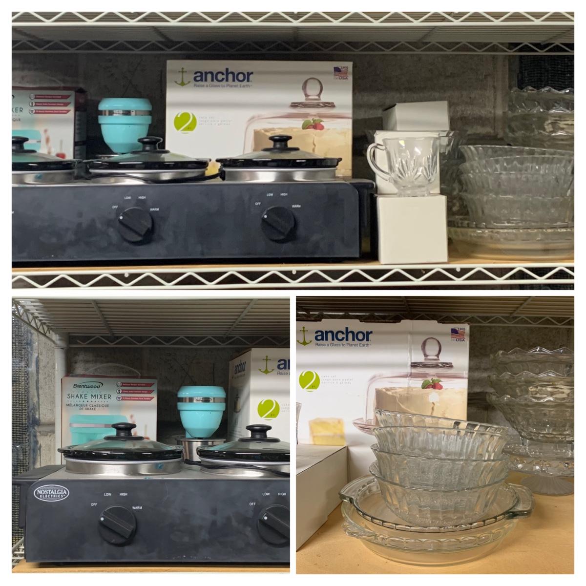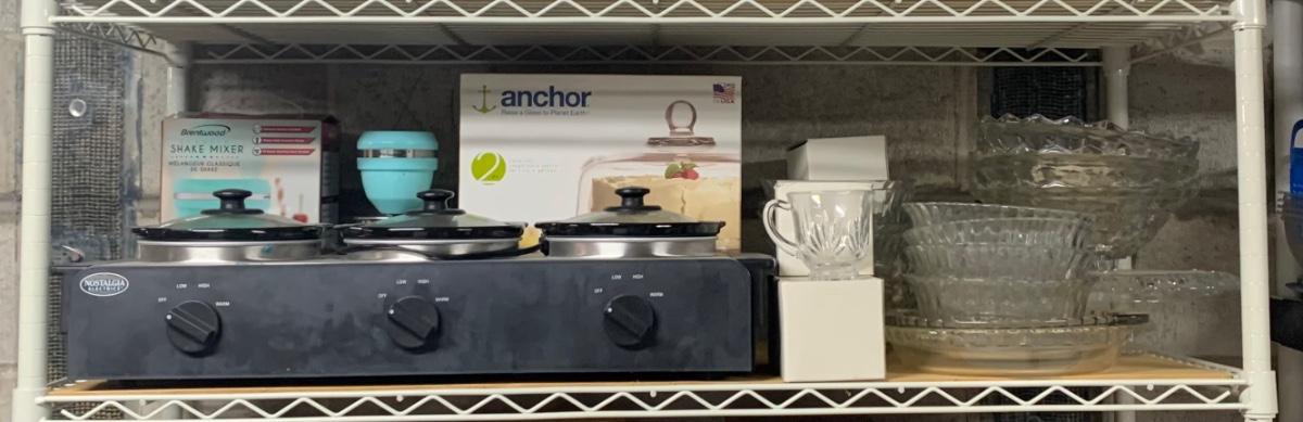 LOT:56: Kitchen Closet Lot Includes Brentwood Shake Mixer In MCM Blue, Nostalgia Electrics Slow Cooker Buffet, Glass Dishes. Anchor Cake Dish and More