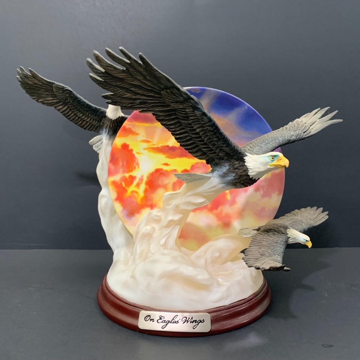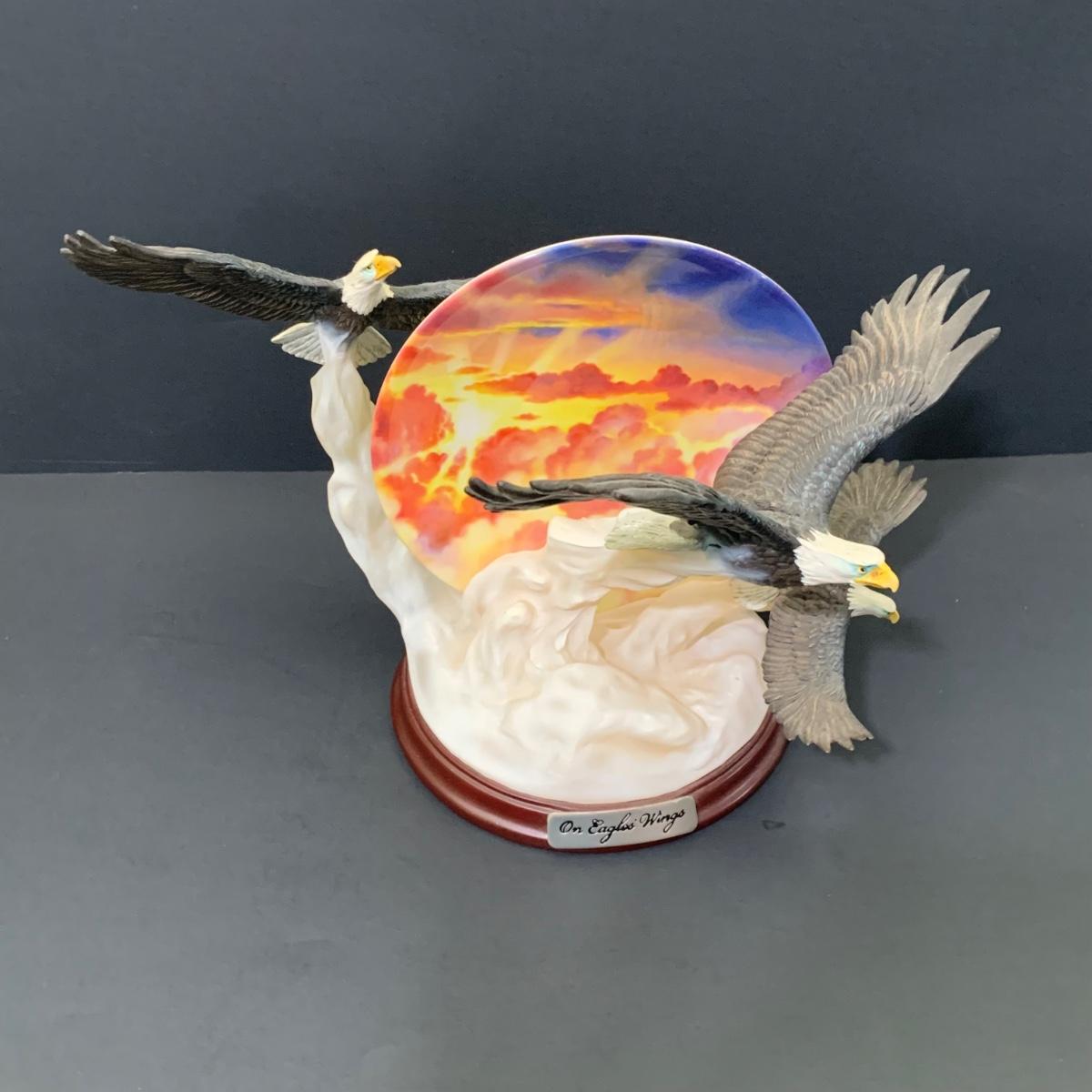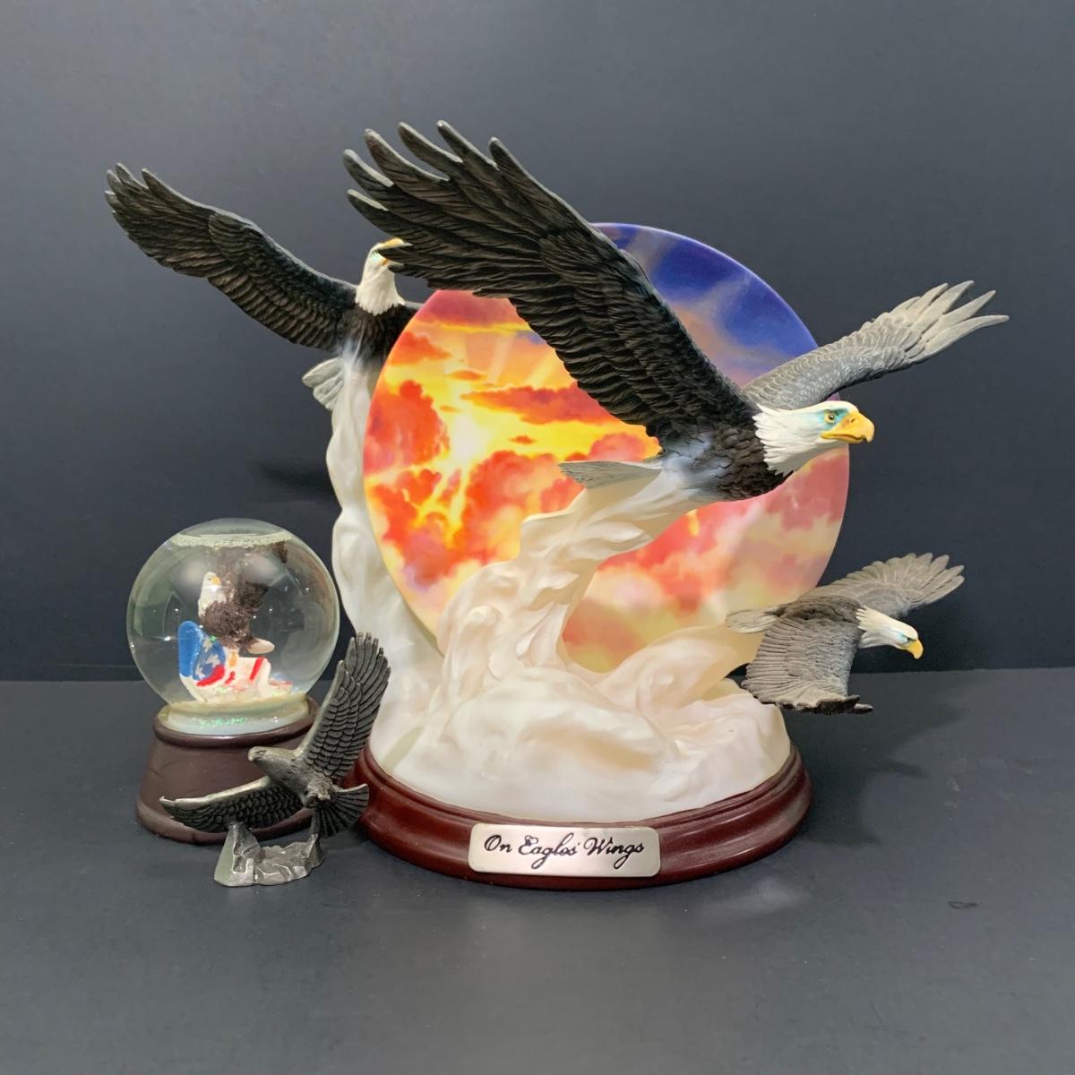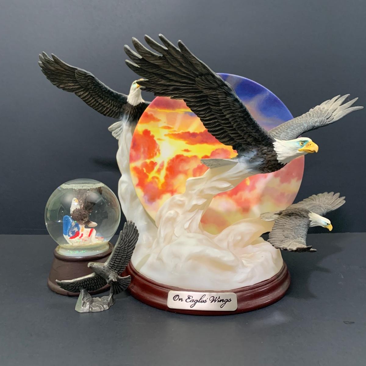 LOT 63: Bradford Exchange's On Eagle Wings 1st Isssue Between Heaven and Earth Commorative Plate and Flying Bald Eagles Statue Along with a Pewter Eagle and Eagle Snowglobe.