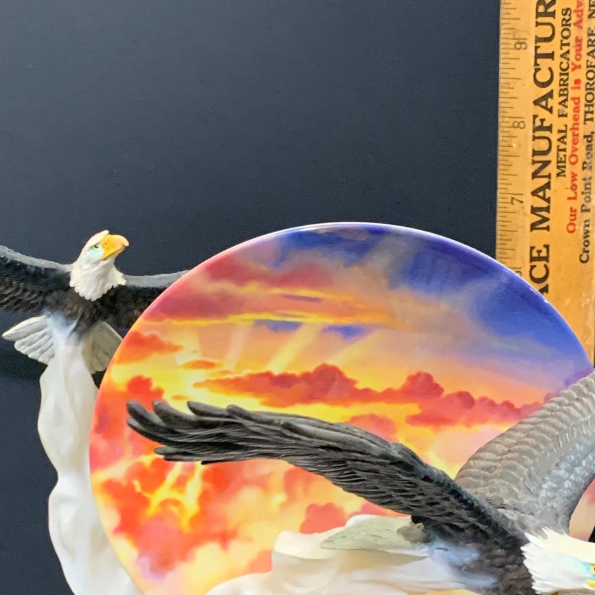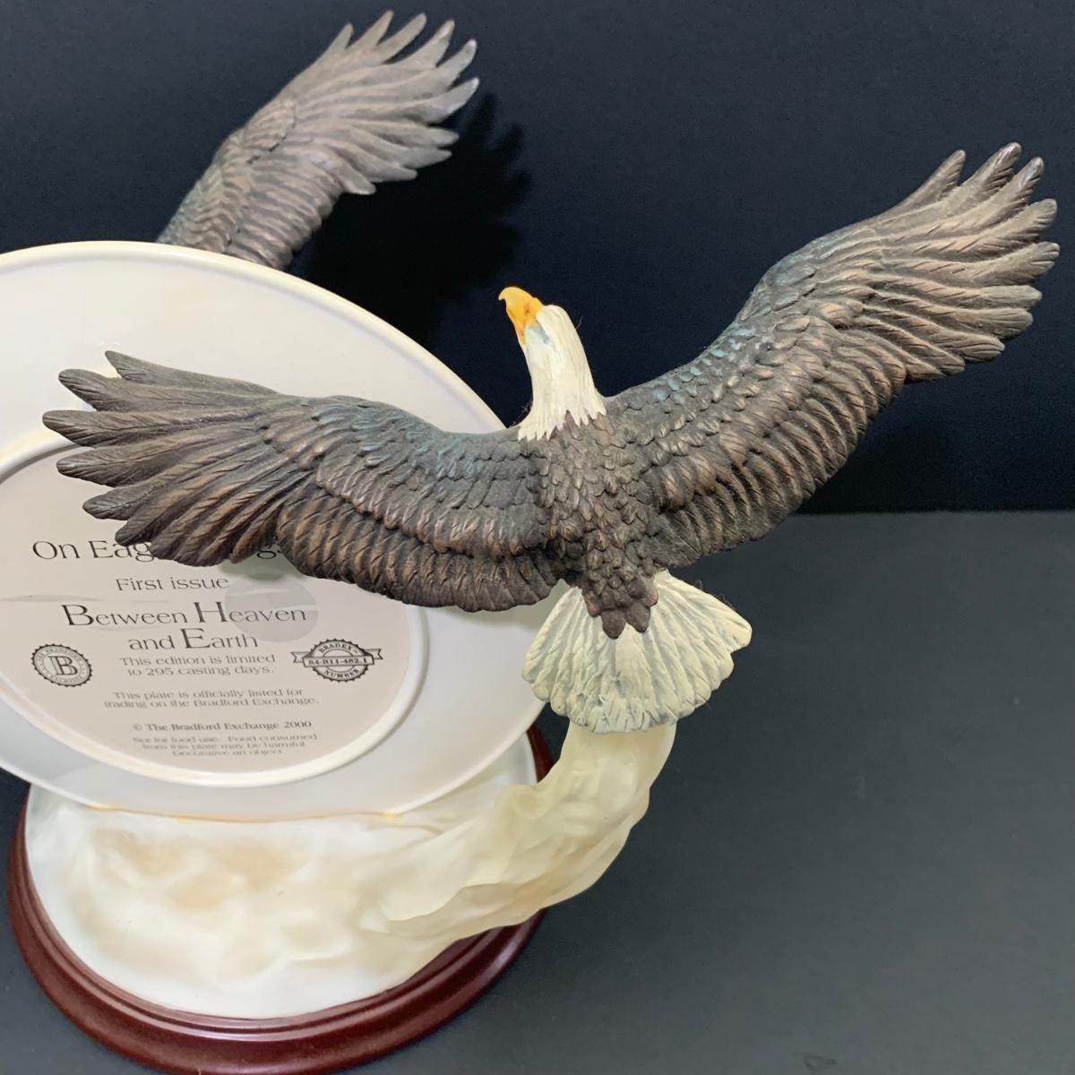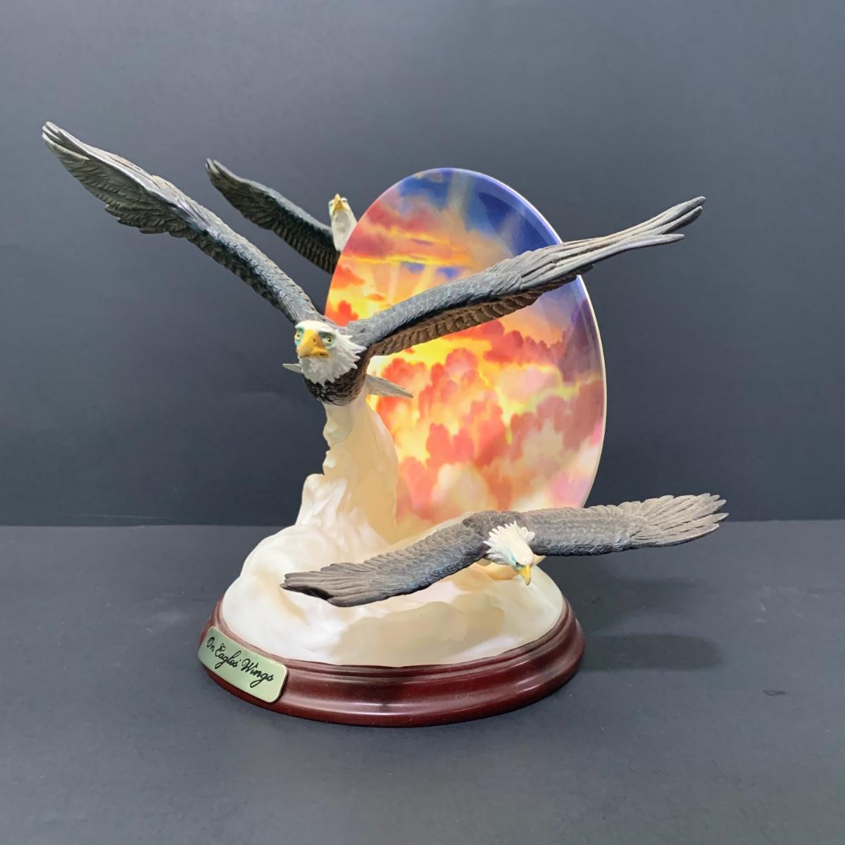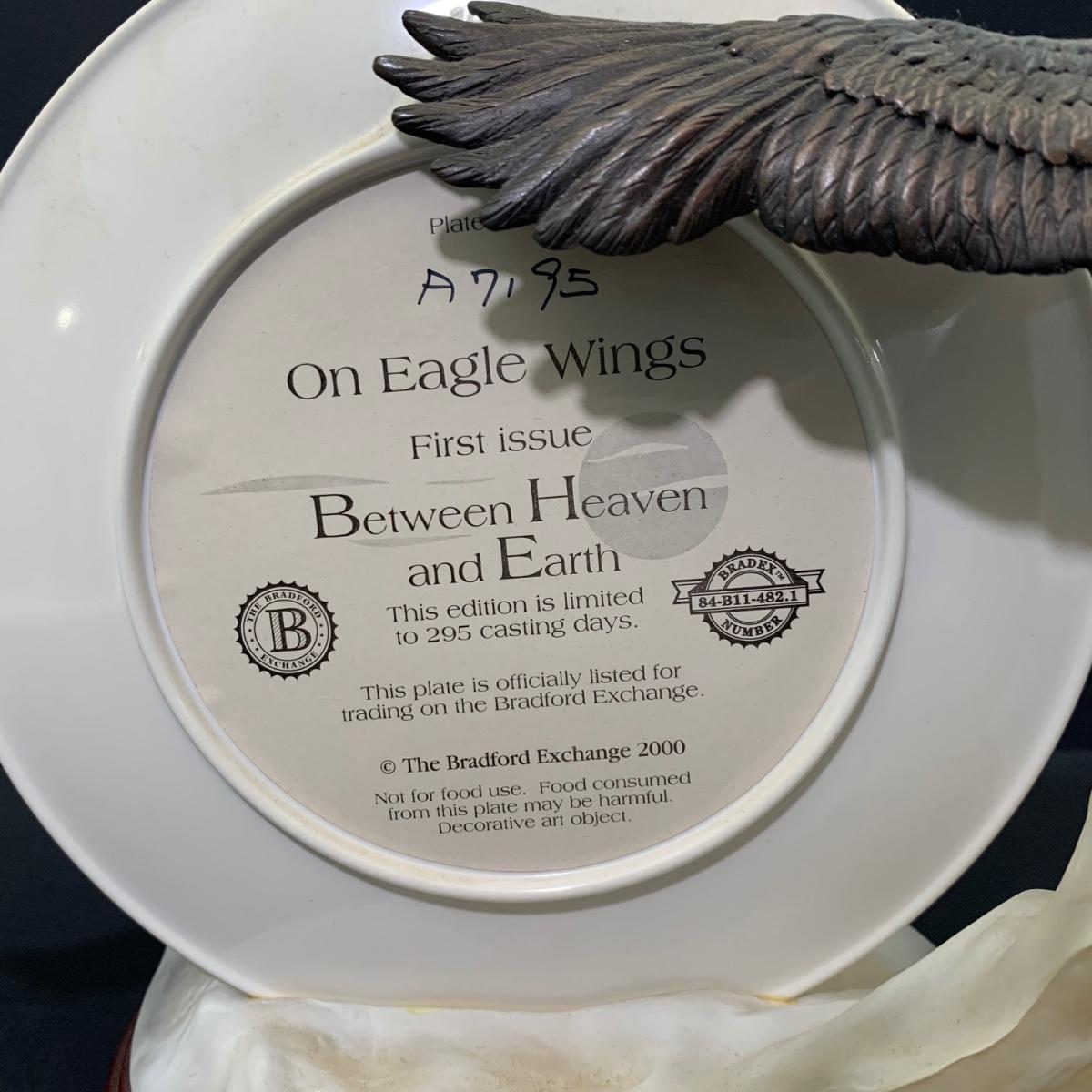 LOT 63: Bradford Exchange's On Eagle Wings 1st Isssue Between Heaven and Earth Commorative Plate and Flying Bald Eagles Statue Along with a Pewter Eagle and Eagle Snowglobe.