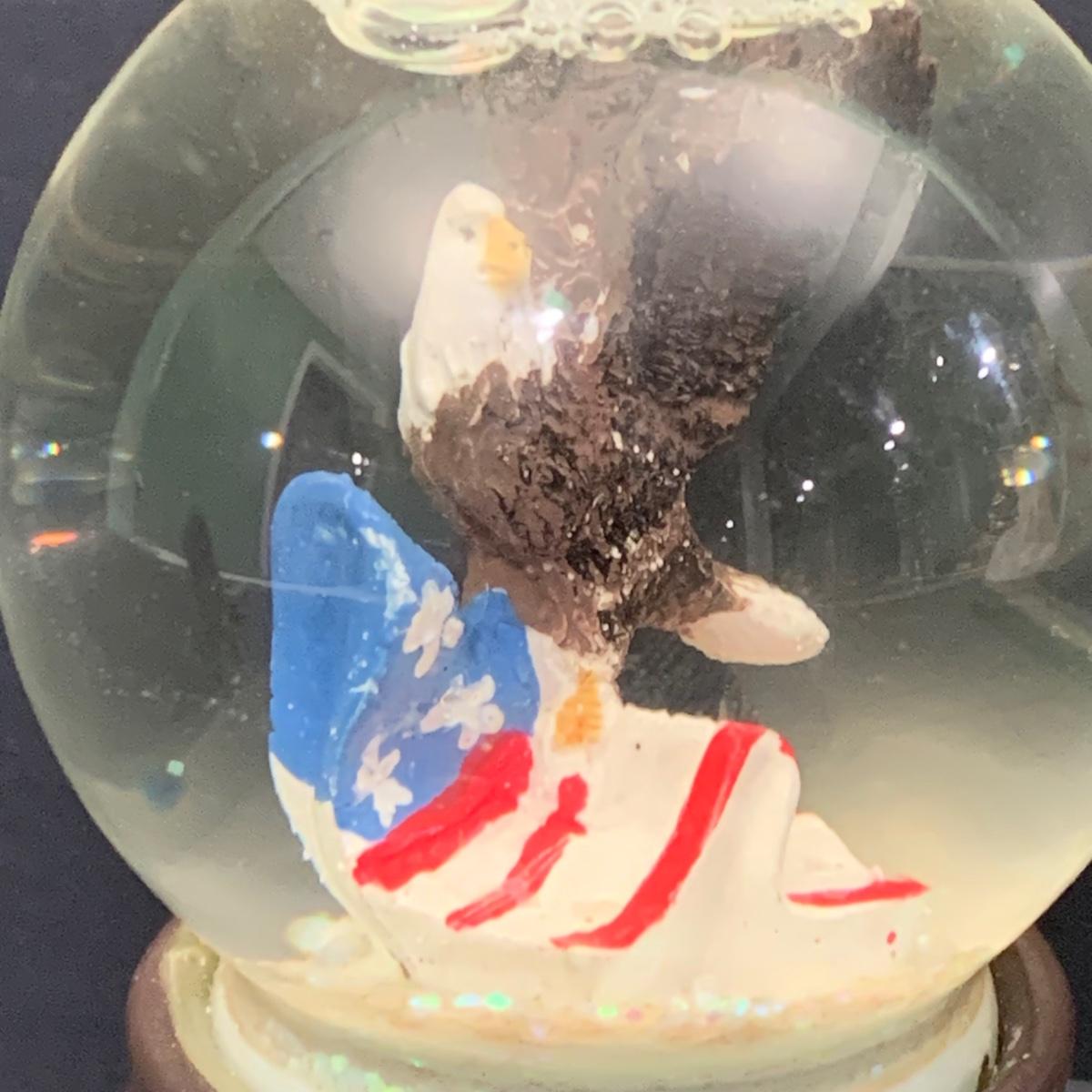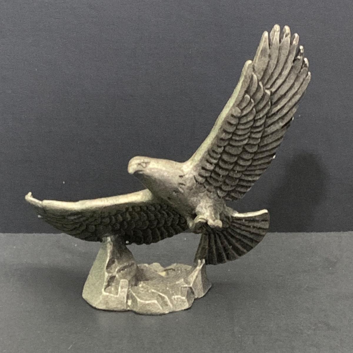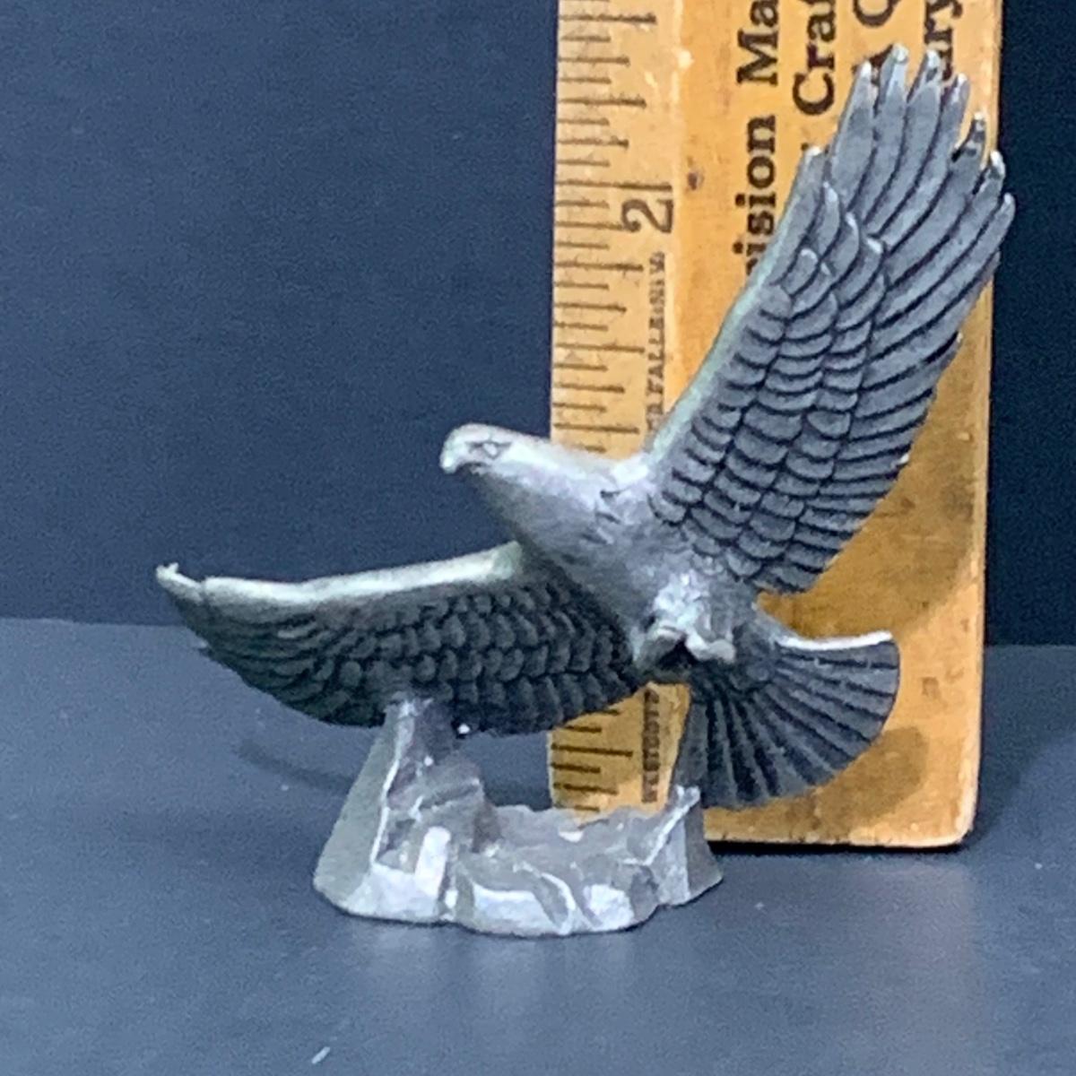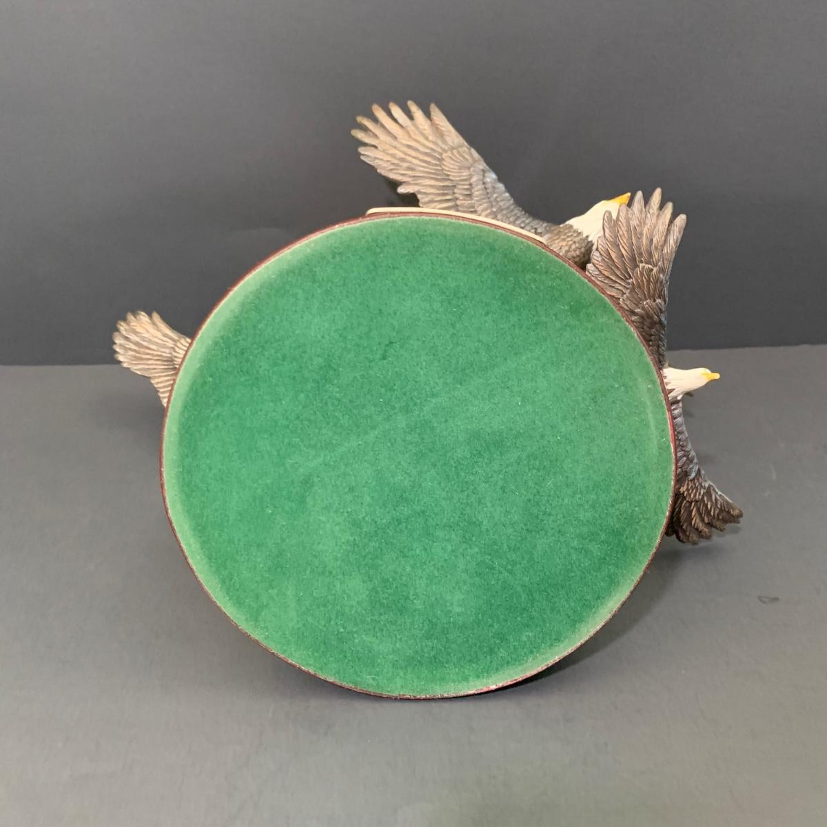 LOT 63: Bradford Exchange's On Eagle Wings 1st Isssue Between Heaven and Earth Commorative Plate and Flying Bald Eagles Statue Along with a Pewter Eagle and Eagle Snowglobe.