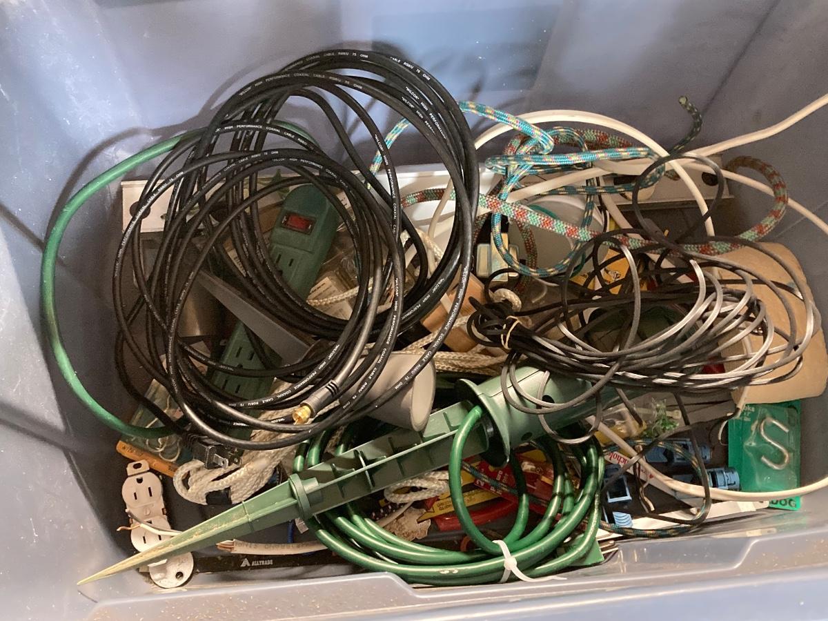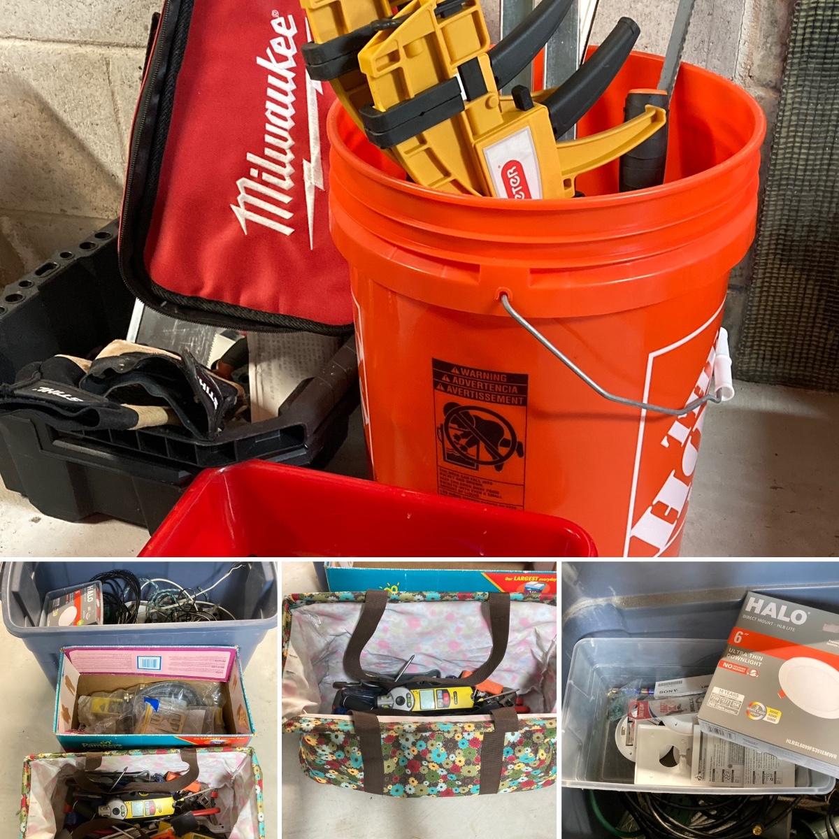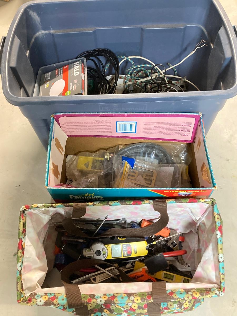 LOT 99: Basement Finds - Containers / Totes with Tools, Electrical Hardware, Gloves and More