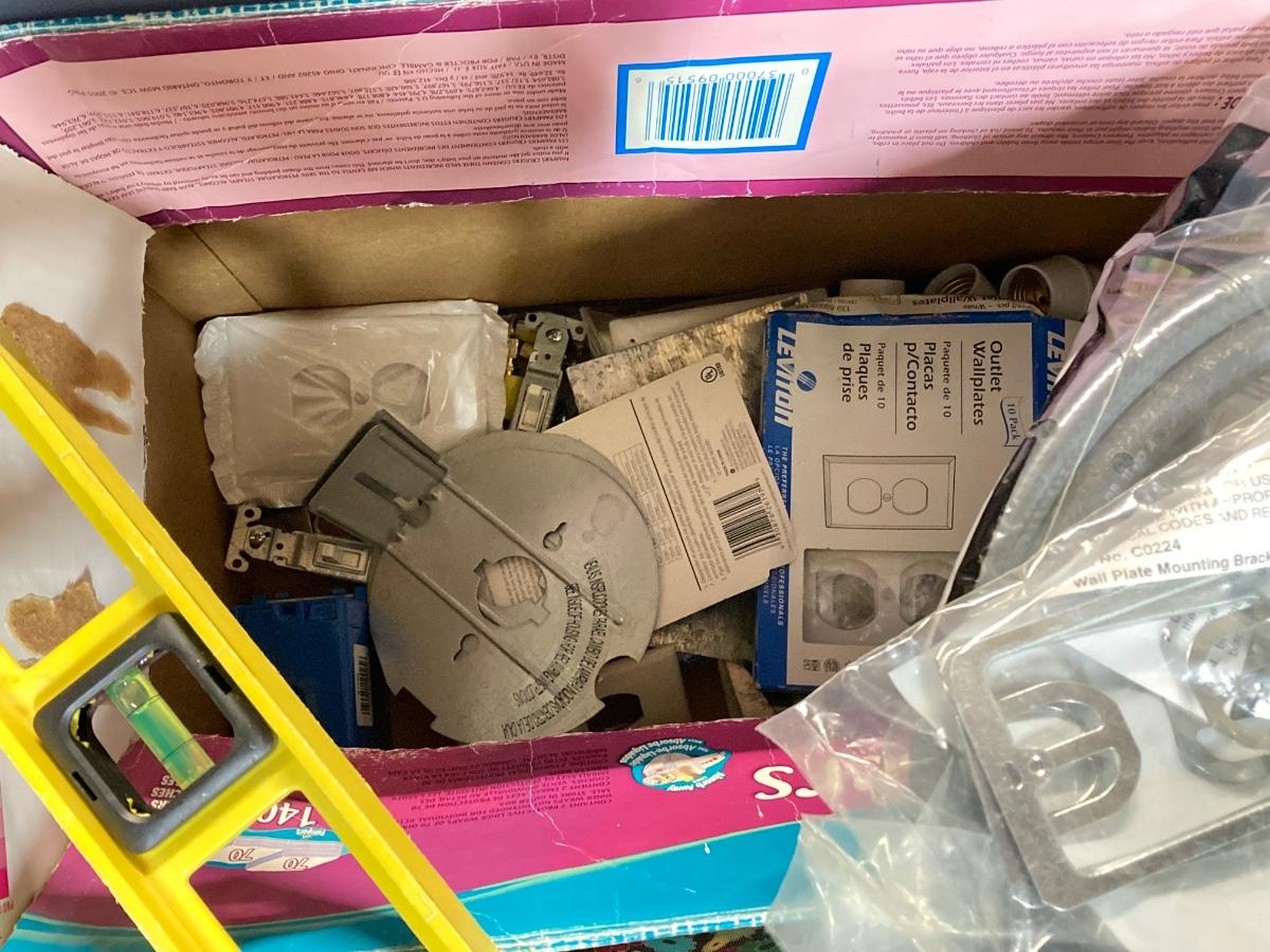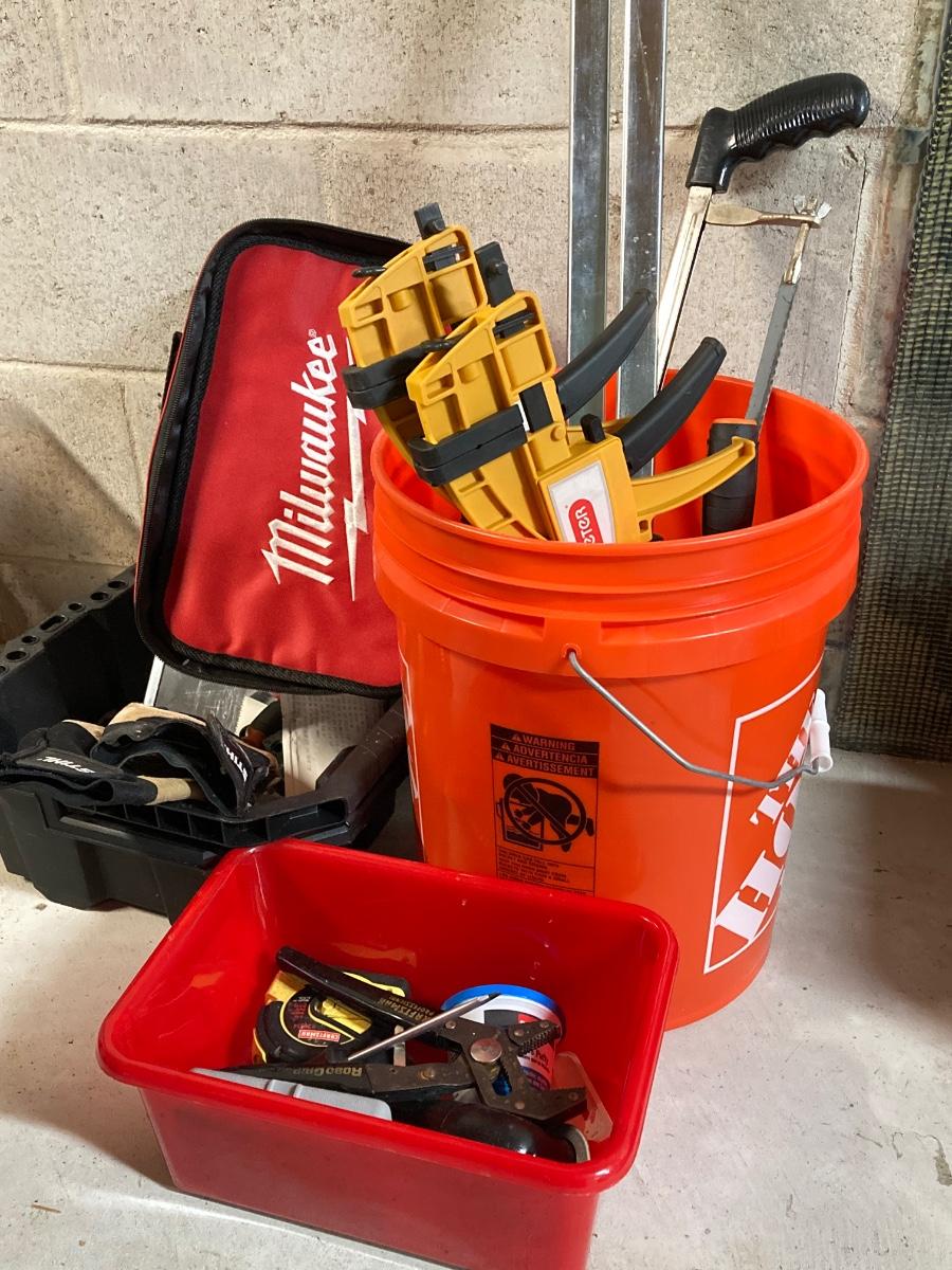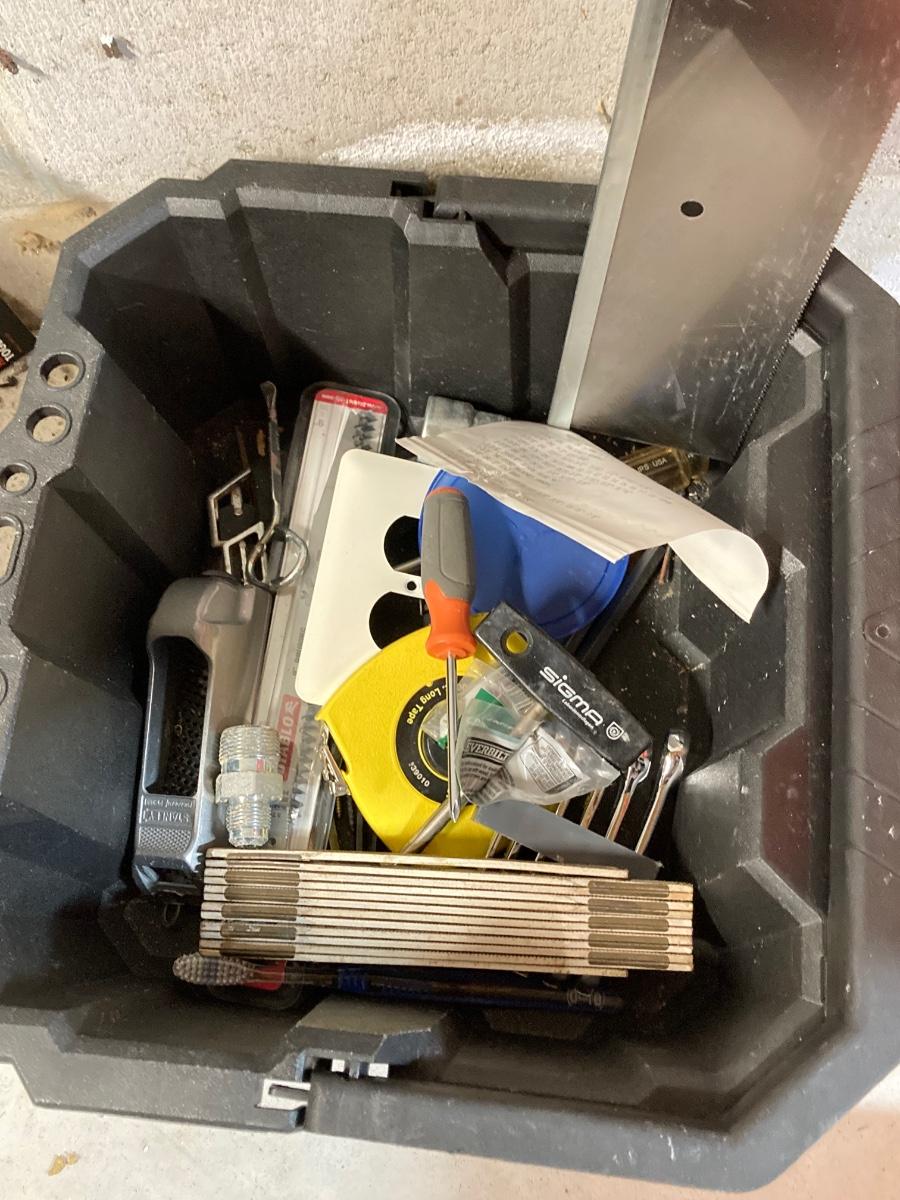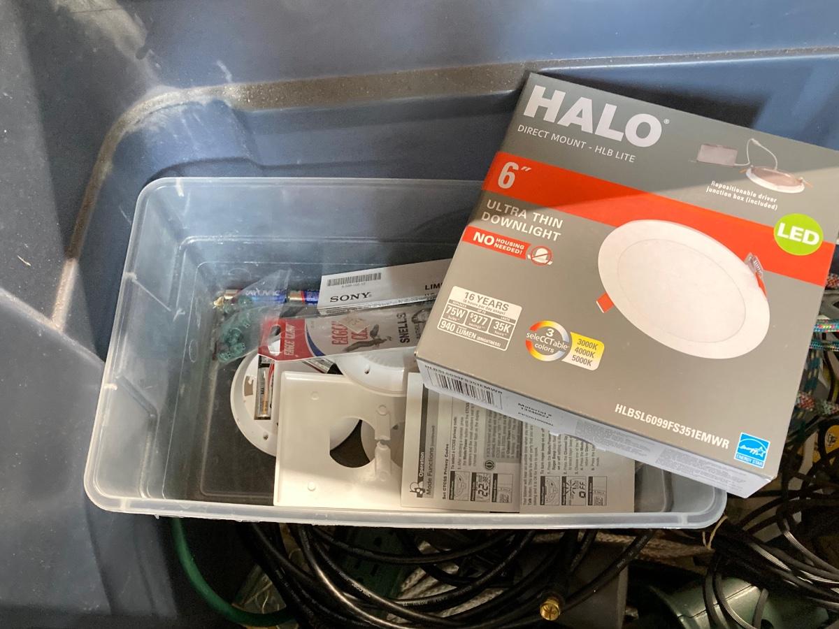 LOT 99: Basement Finds - Containers / Totes with Tools, Electrical Hardware, Gloves and More