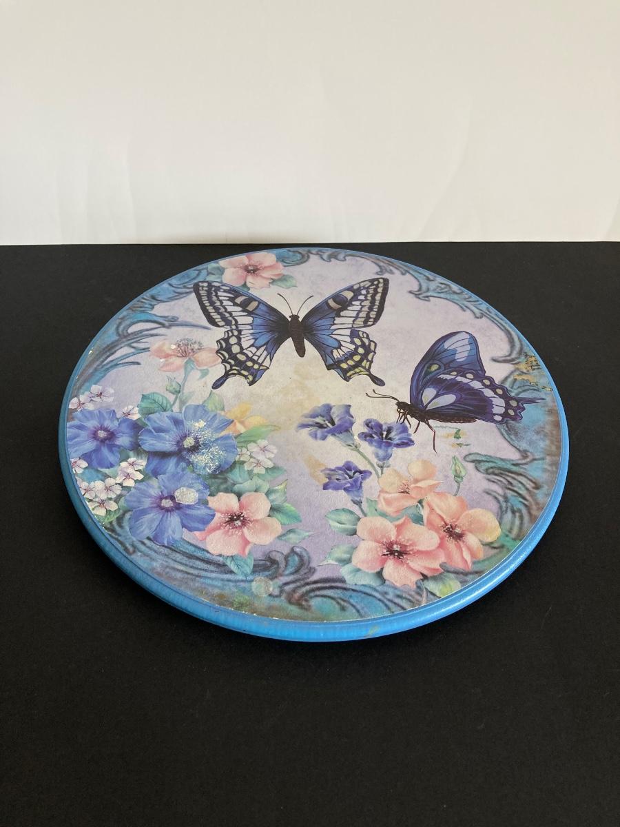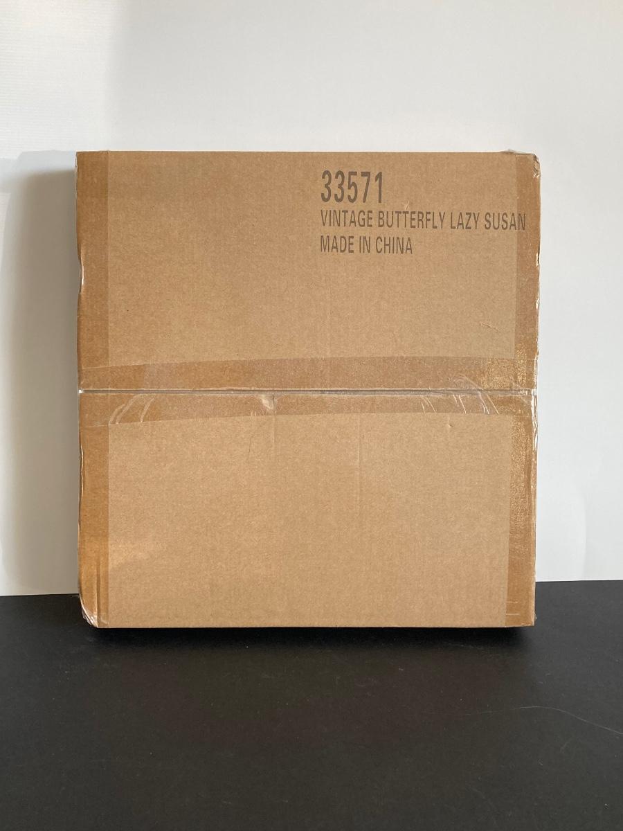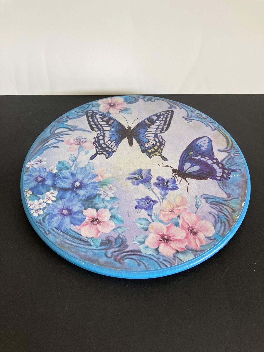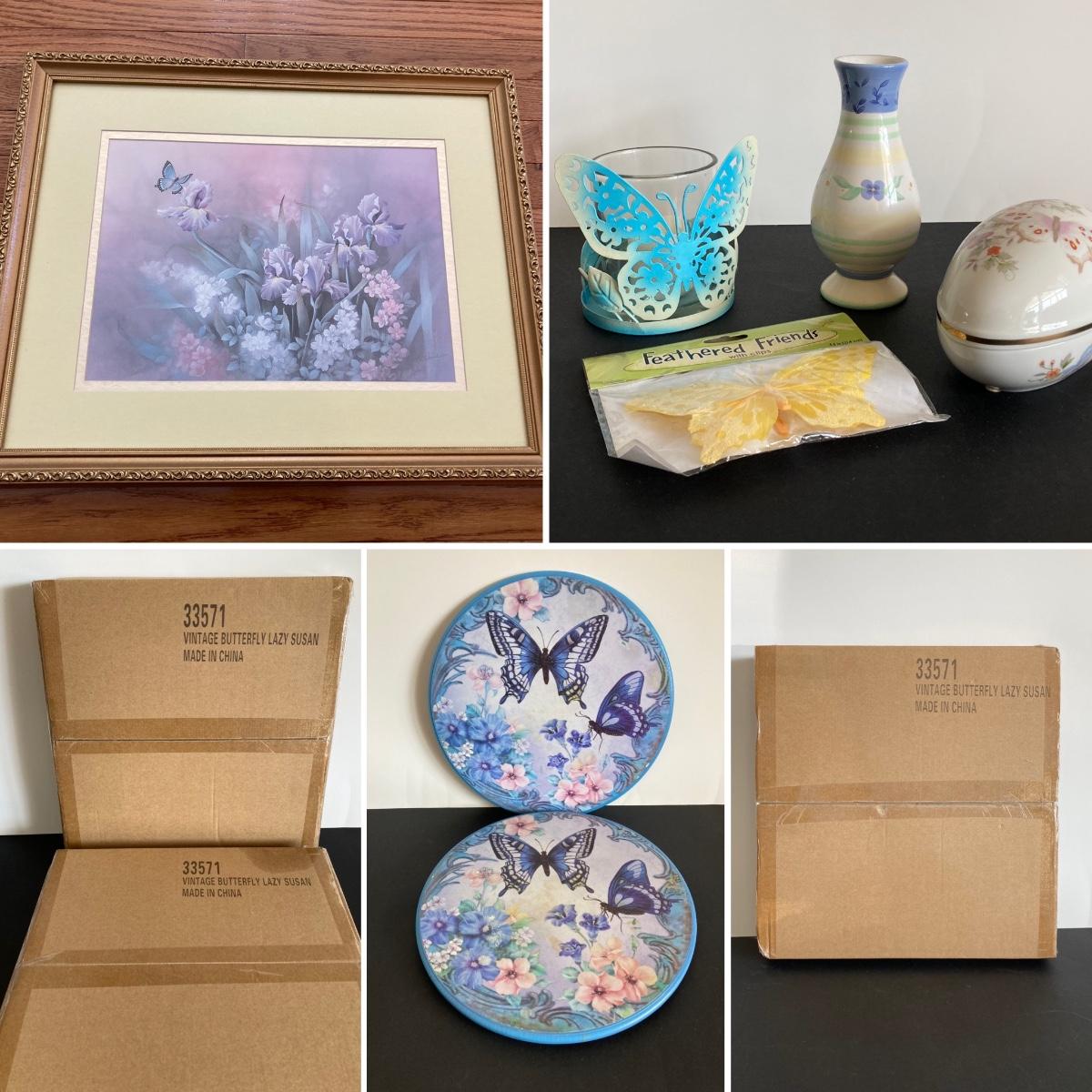 LOT 131: Framed Butterfly Print, Butterfly Lazy Susans (2 opened & 3 NIP) & More