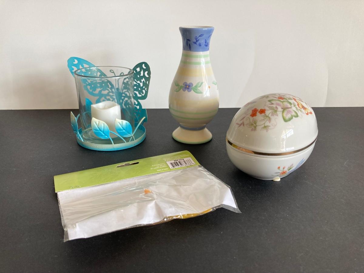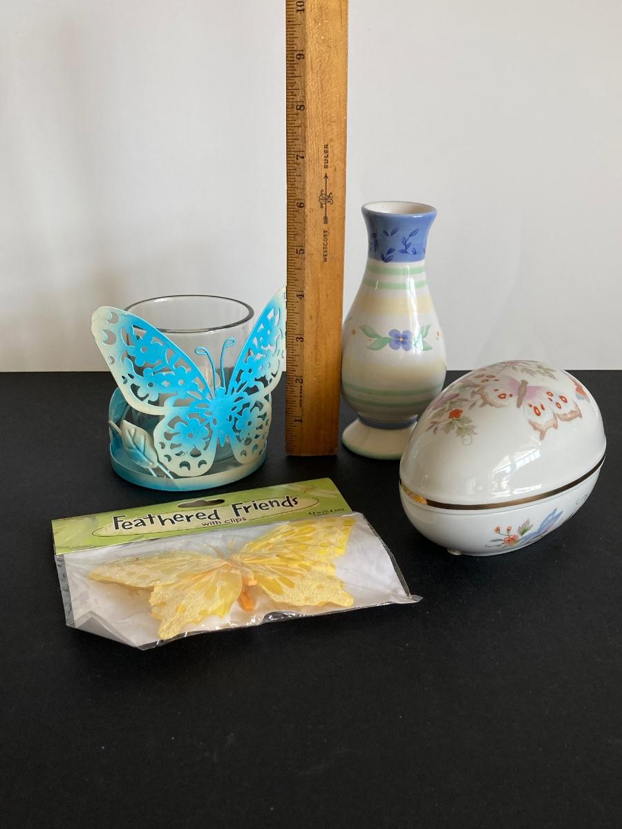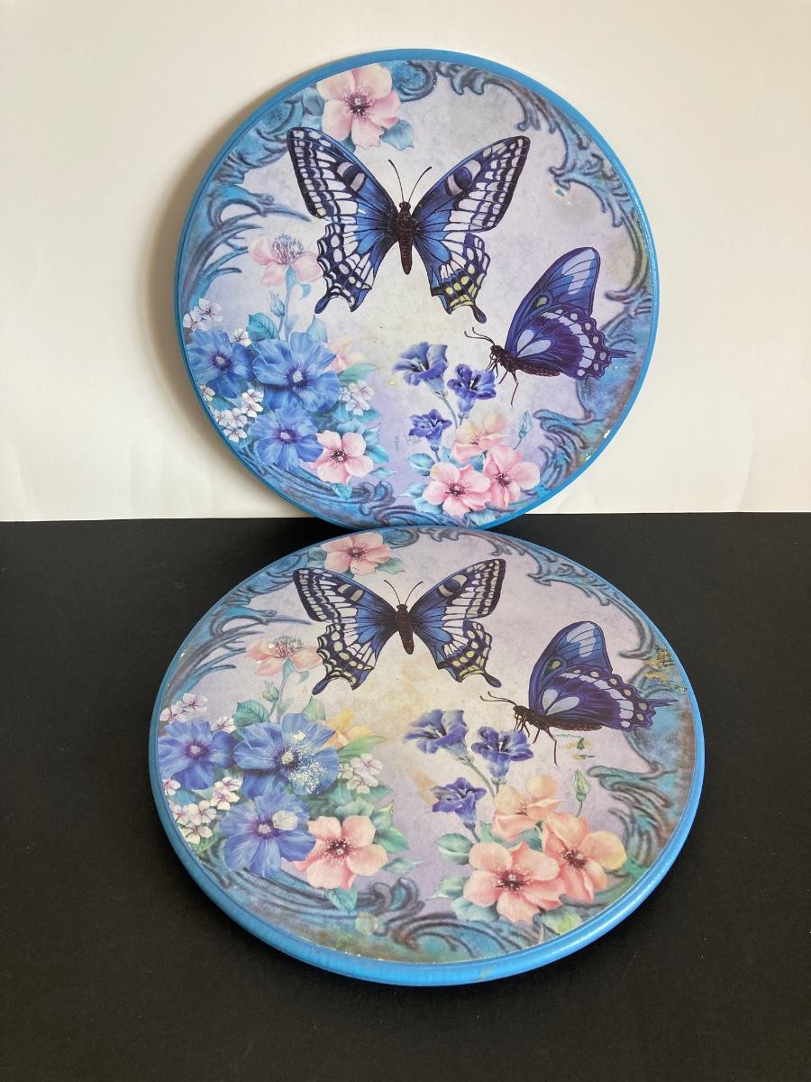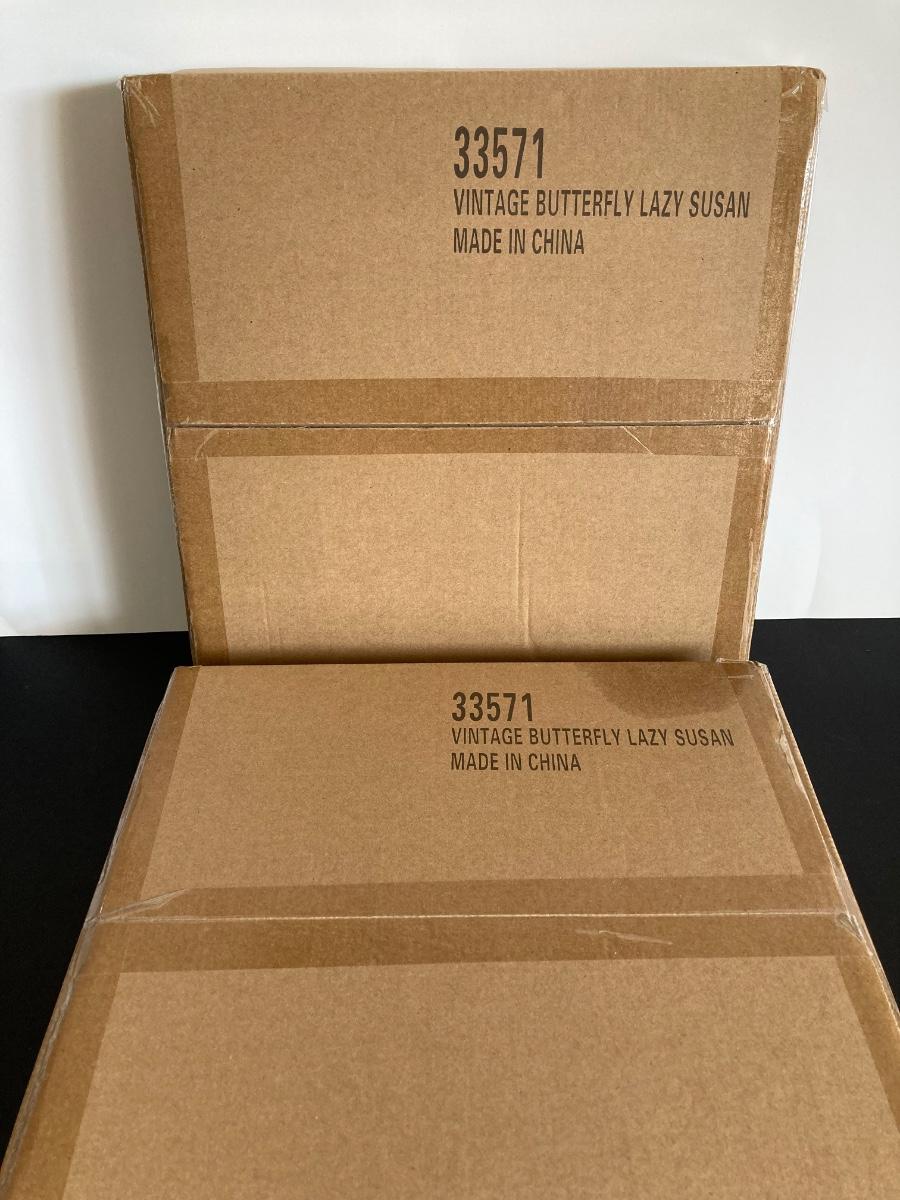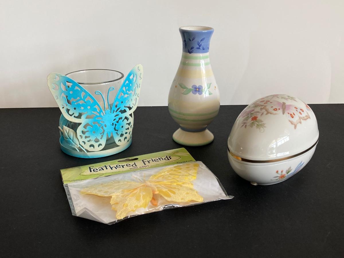 LOT 131: Framed Butterfly Print, Butterfly Lazy Susans (2 opened & 3 NIP) & More